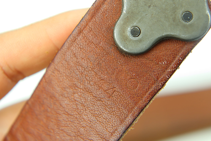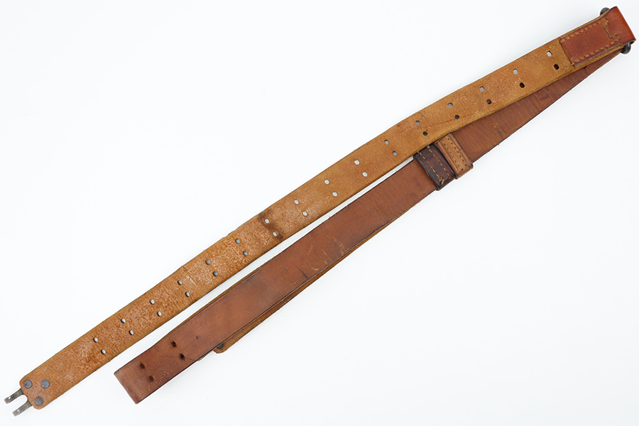 11/20/23 – This is an original WW2 production leather rifle sling for a M1 Garand, M1903, or similar US rifle. The sling is in excellent overall condition with some light surface wear and signs of aging but no major issues. Strong leather throughout and a faint (yet visible) maker and date stamp as shown.