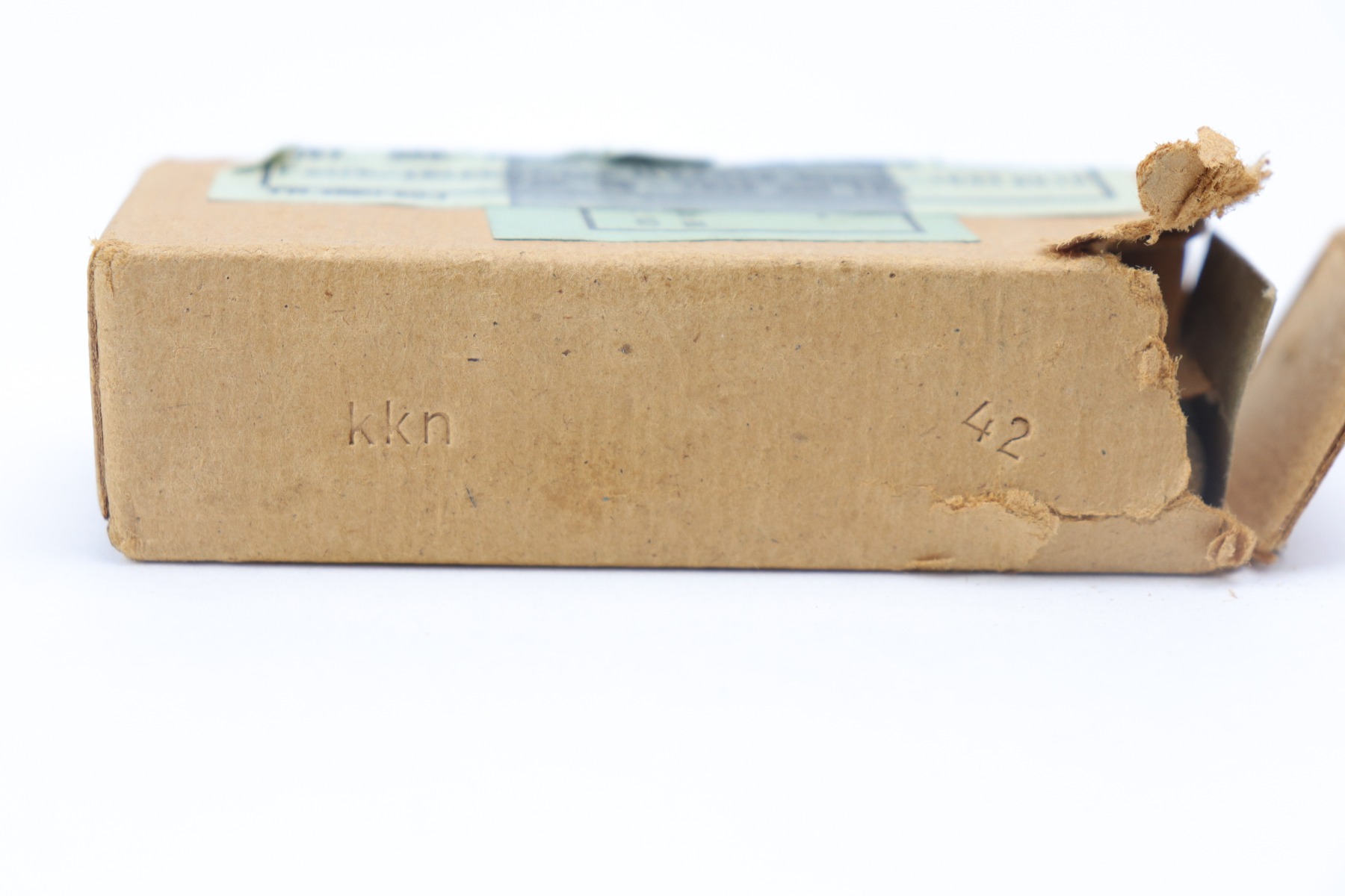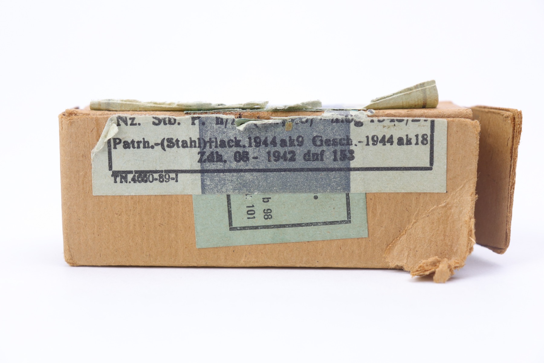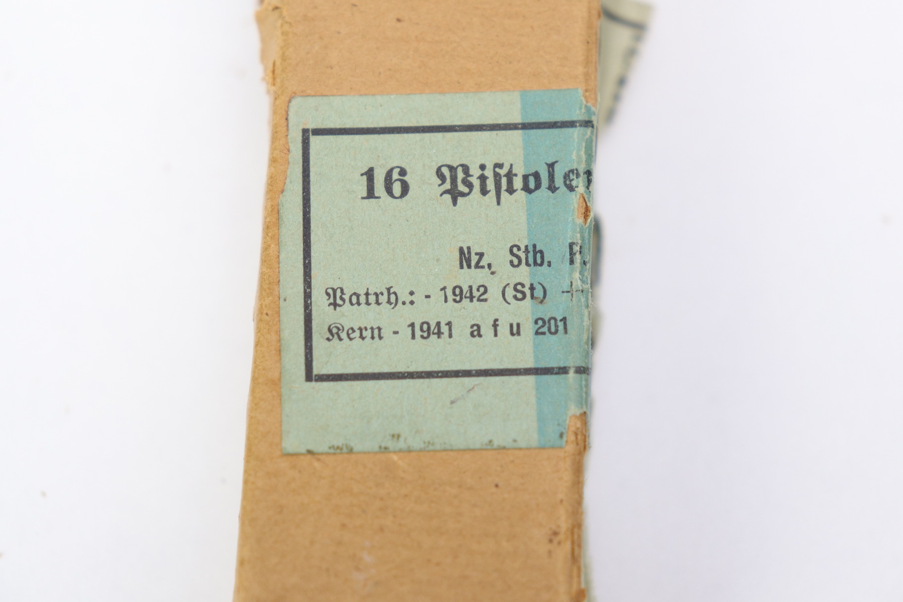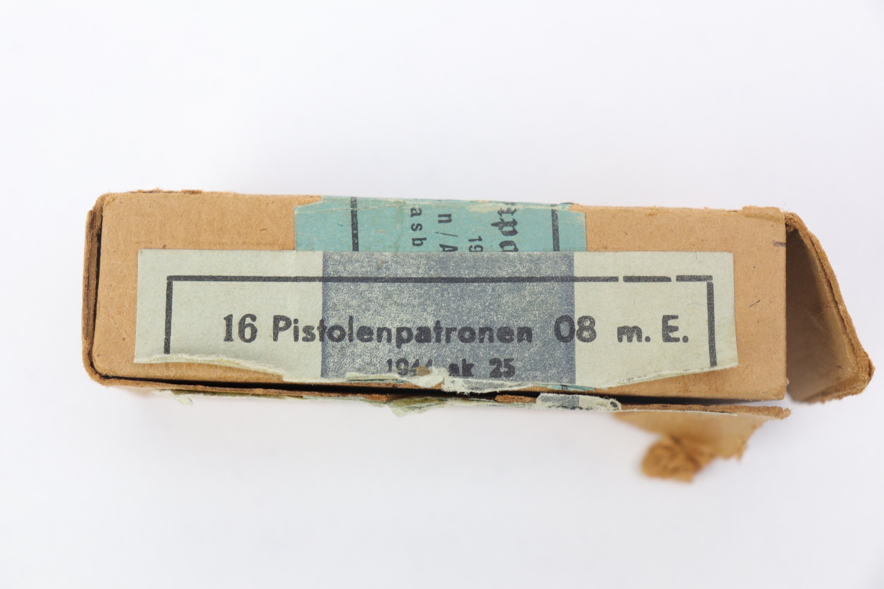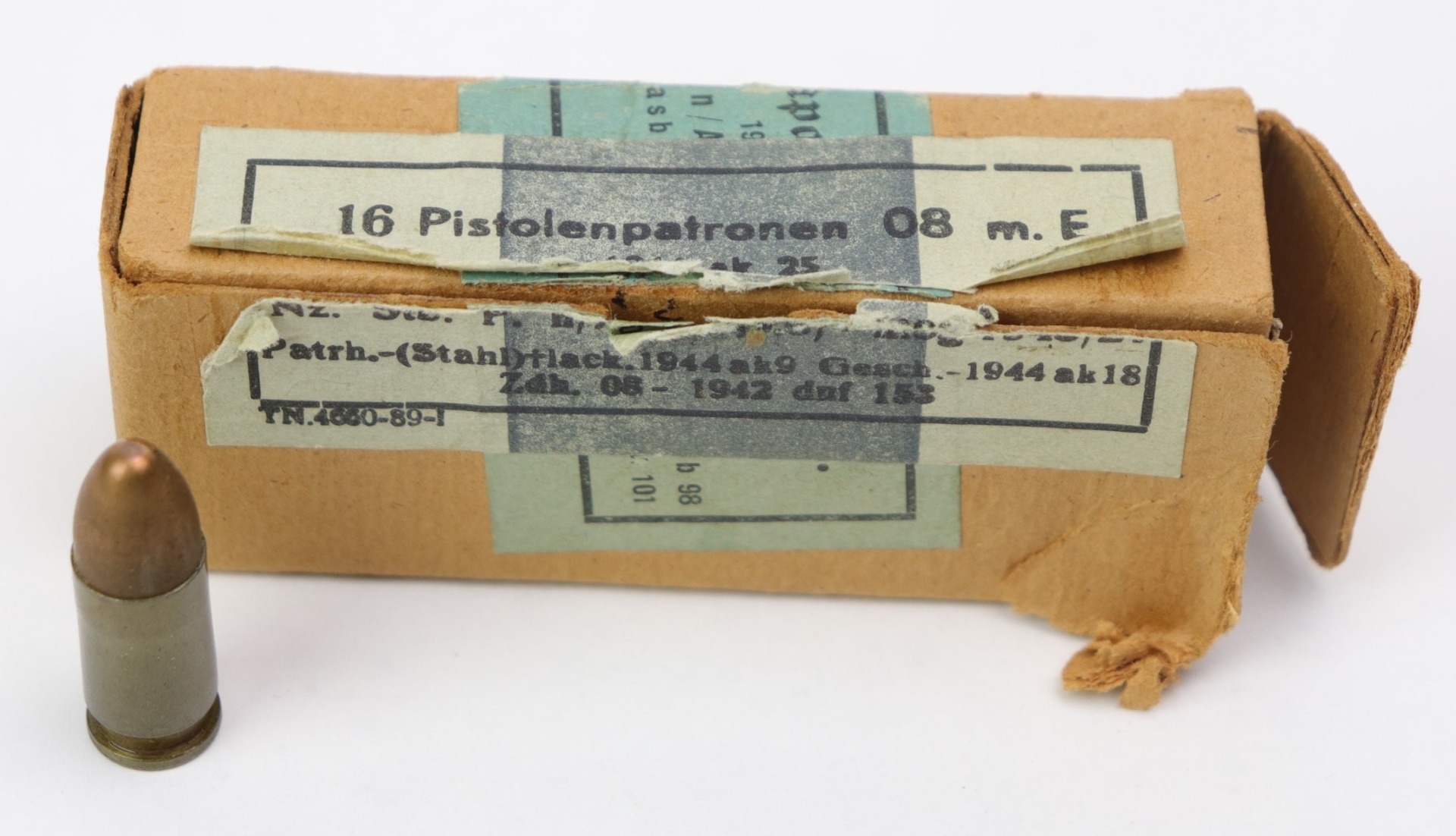 8/12/20 – This is a 16 round box of unused 9mm ammo. The box is ripped but the ammo is perfect. The box is labeled Pistolenpatronen 08 m.E 1944 ak 25.