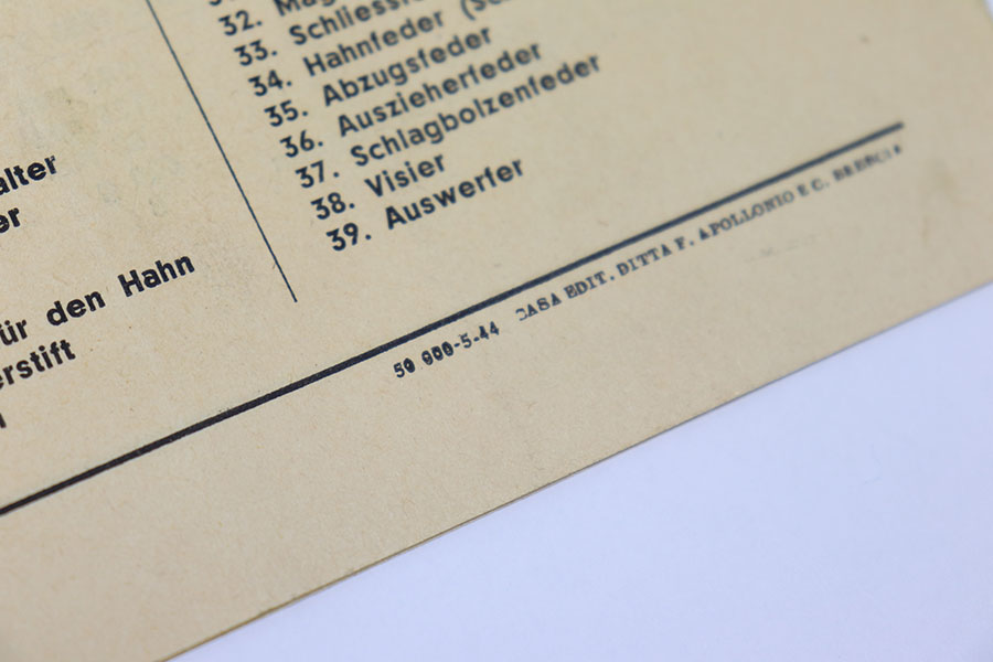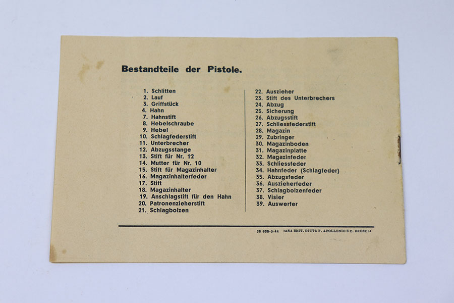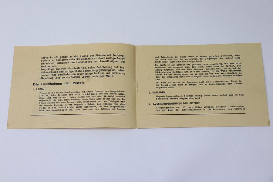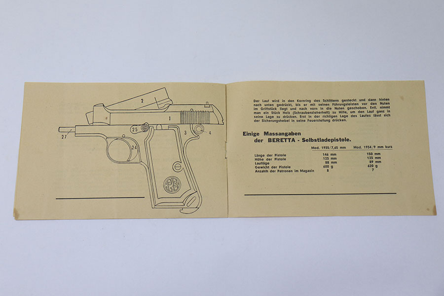 6/1/21 – This is a short, 6 page manual written in German and dated 1944. Fairly scarce as there aren’t a lot of German made manuals for the Beretta pistols during WW2. The pages are delicate, but still completely intact and in great condition overall. Perfect to pair with any 4UT marked Beretta.