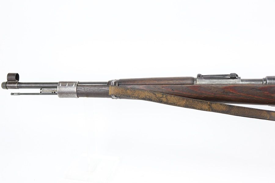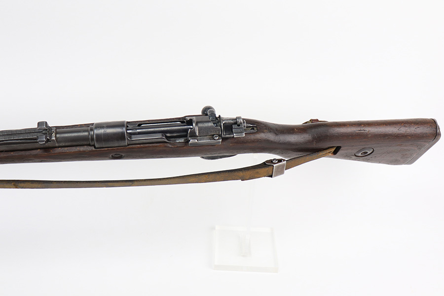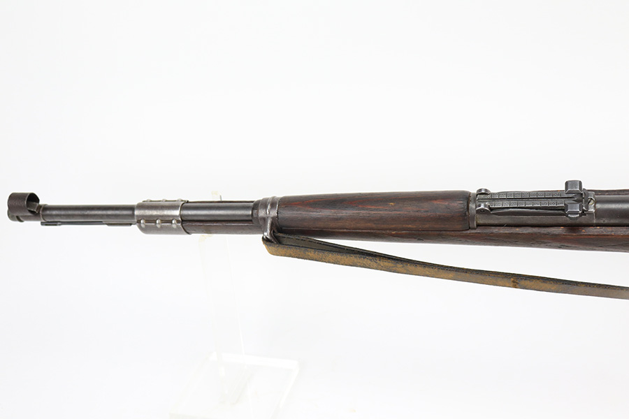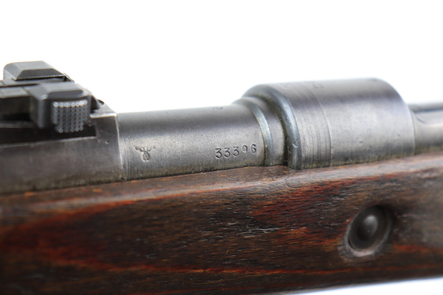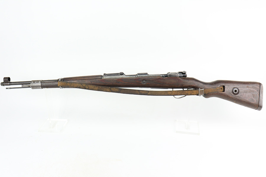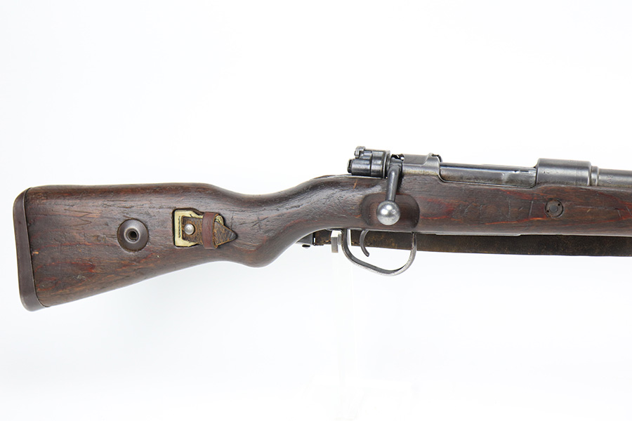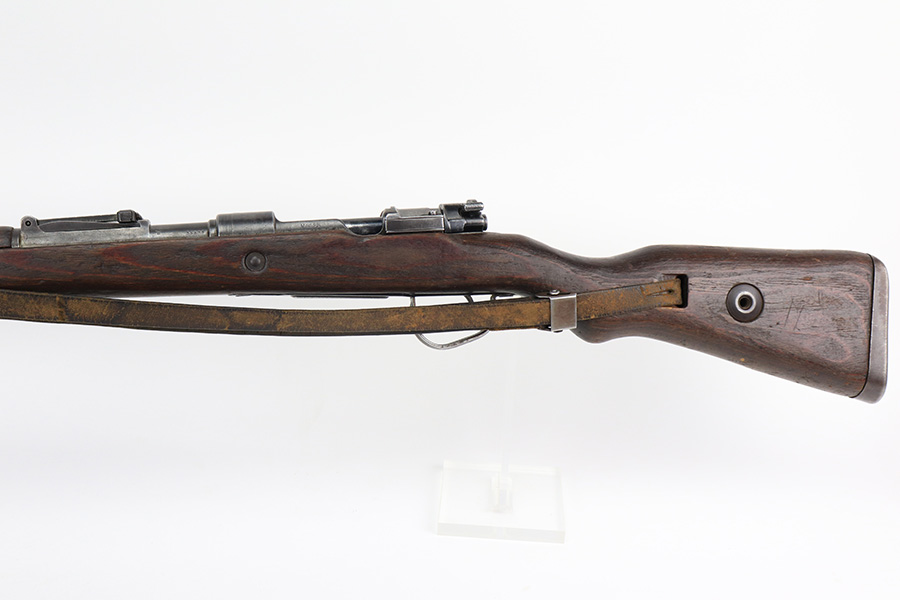 6/14/22 – This is a nice example of a Gustloff Werke K98 issued to the Nazi military in 1944. The gun is mismatched, but in nice condition overall. It comes with an original cleaning rod, leather sling, and rubber muzzle cap. There is noticeable thinning on the receiver, barrel, front barrel band, and floor plate / trigger assembly. Some spotty oxidation and patina here and there. Pitting on the front sight hood and on the rear barrel band. Dark brown patina on the butt plate. Some scratches and minor dings on the stock throughout. There is oxidation and pitting in the bore throughout.