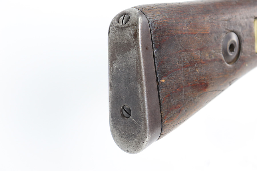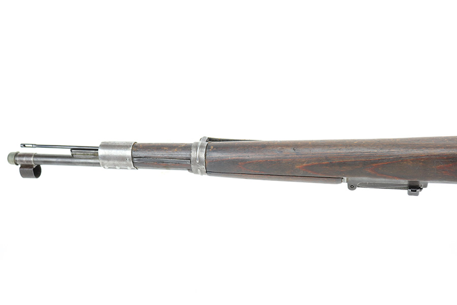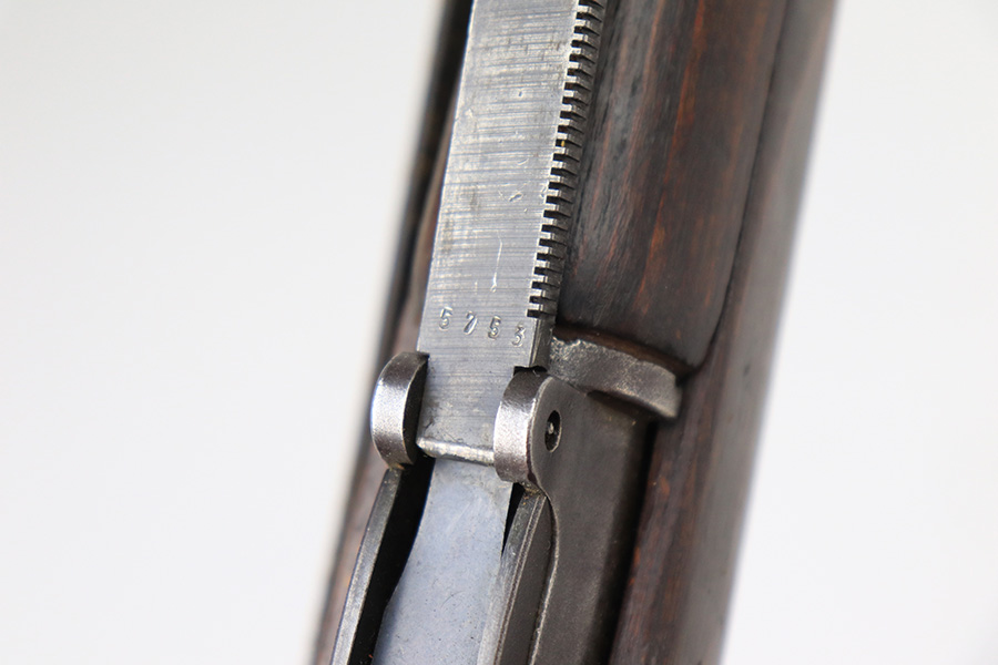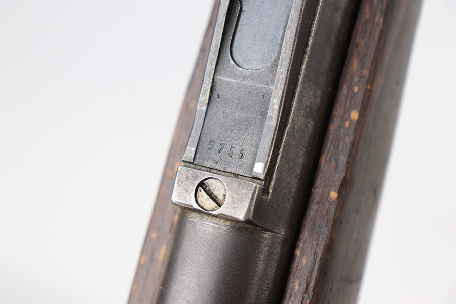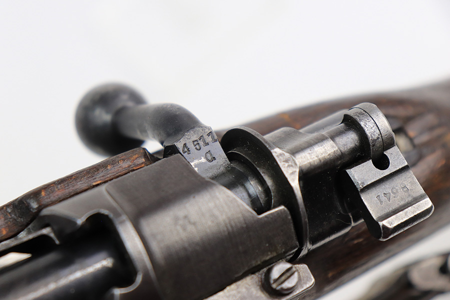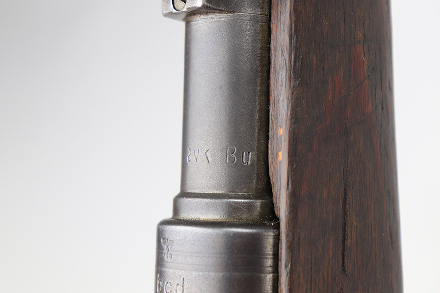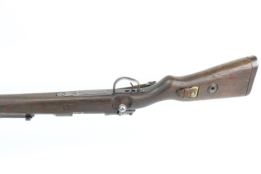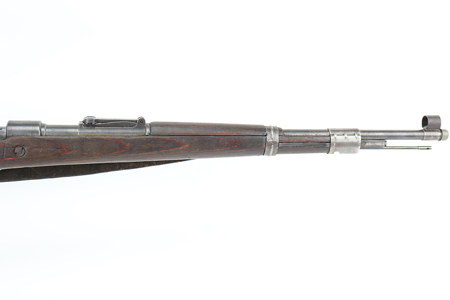 6/14/22 – This is a nice example of a Gustloff Werke K98 issued to the Nazi military in 1944. The gun is mismatched, but in nice condition overall. It comes with an original cleaning rod, leather sling, and rubber muzzle cap. There is noticeable thinning on the receiver, barrel, front barrel band, and floor plate / trigger assembly. Some spotty oxidation and patina here and there. Pitting on the front sight hood and on the rear barrel band. Dark brown patina on the butt plate. Some scratches and minor dings on the stock throughout. There is oxidation and pitting in the bore throughout.