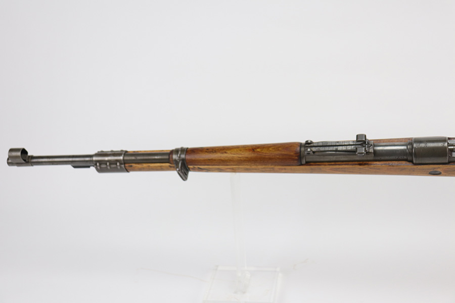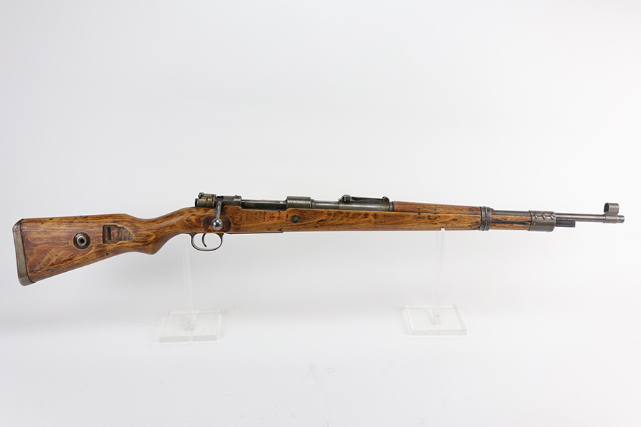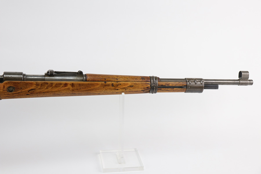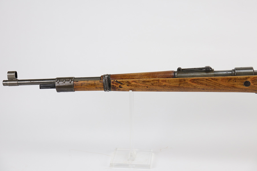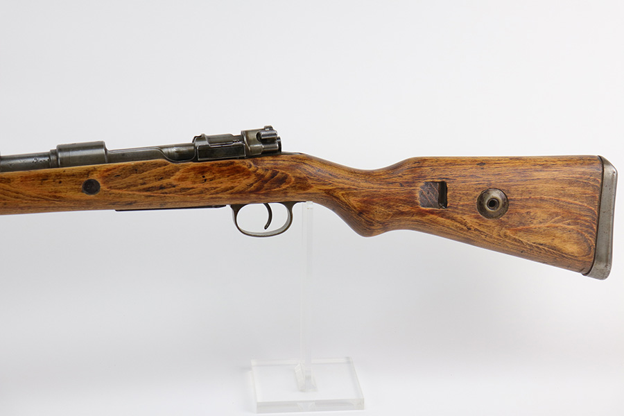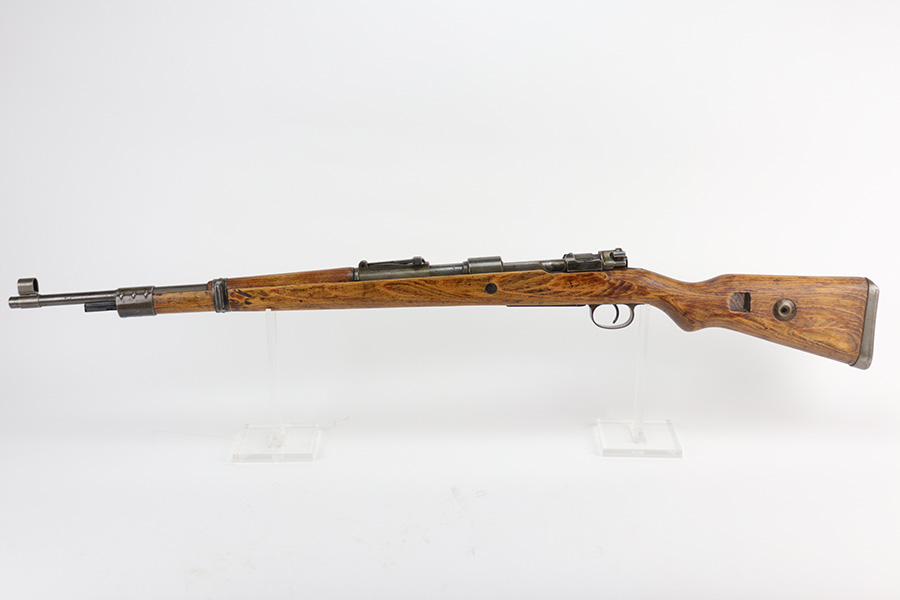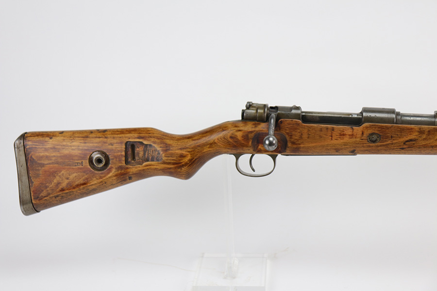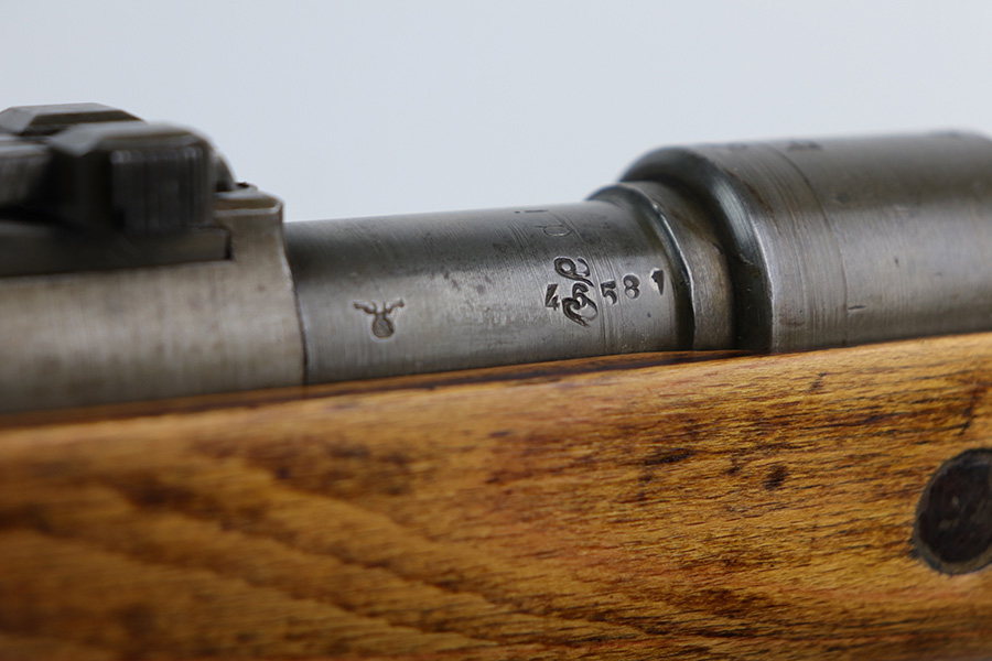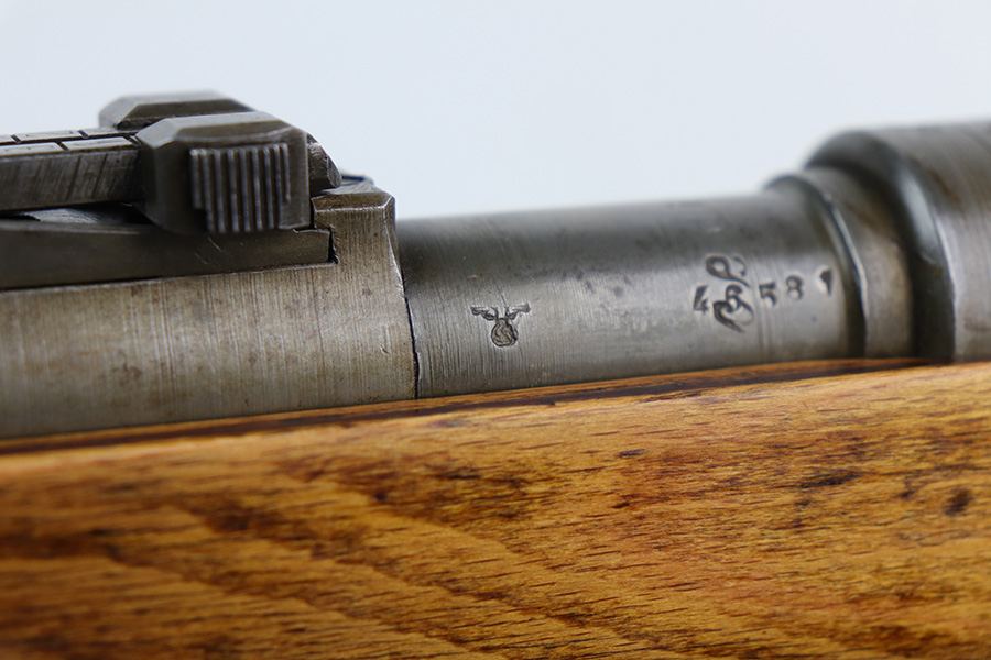 9/2/21 – This is a very nice example of a Gustloff-Werke K98 rifle issued to the Nazi military in 1944. It is all matching and has the proper waffen military proofs throughout. The barrel bands are un-numbered. The stock is not numbered, but has a “Waffen Eagle H” proof. This gun is unique because it has a late-war all-phosphate finish. A few of the small parts are blued. There areas of thinning and spotty oxidation throughout, typical for these finishes. The stock is nice, but appears to have been lightly sanded. Small digs and dents throughout. The bore is near-mint.
