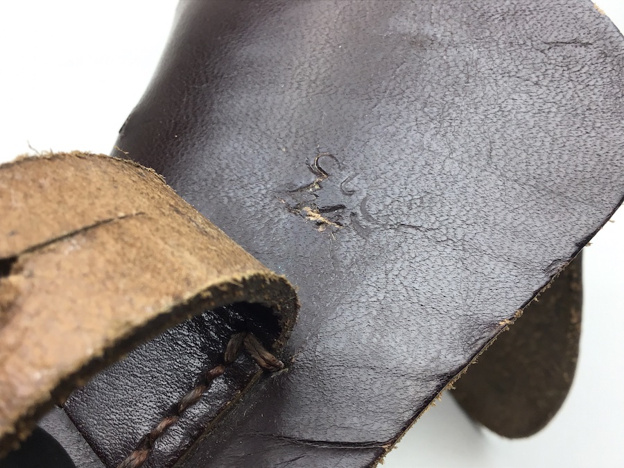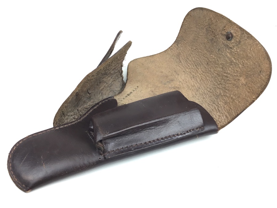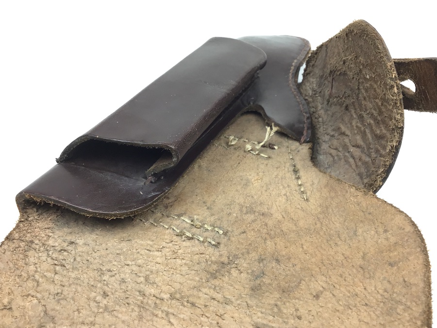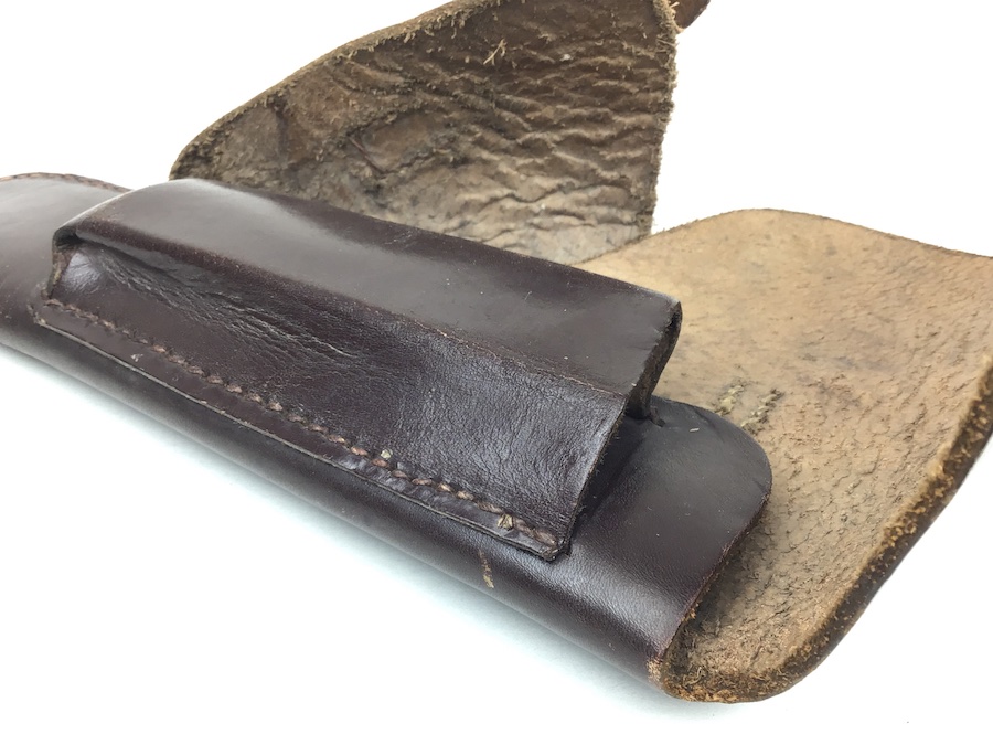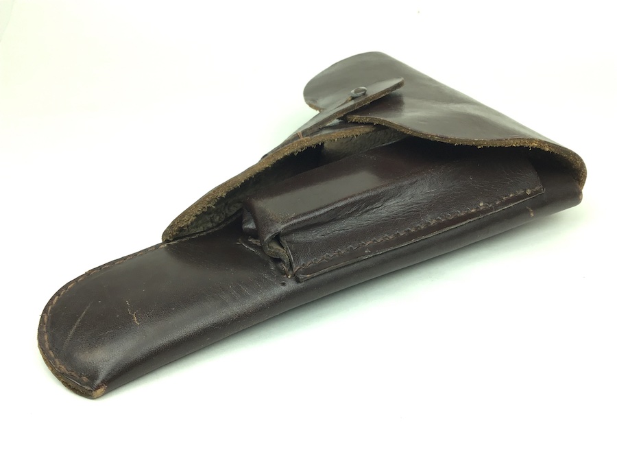 3/26/20 – This is an original 1944 dated High Power holster. The holster is in great shape with nice leather and all original stitching. The interior of the flap is faintly waffen marked, but visible. See photos. Under the closure strap is a “ctg 44” maker code and date. The holster has some very light scuff marks on the exterior leather, but no major damage. Nice holster.