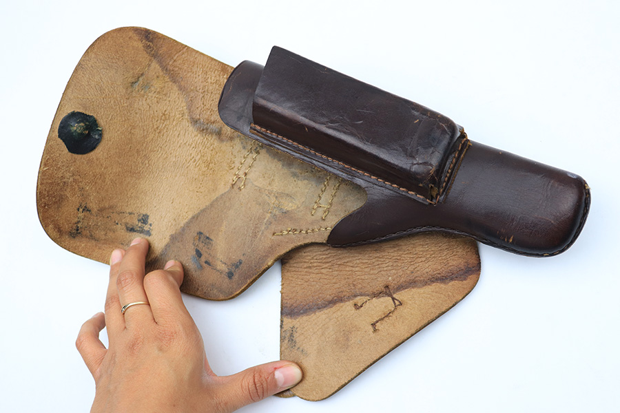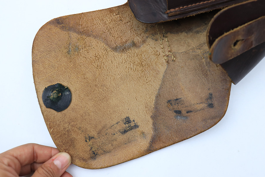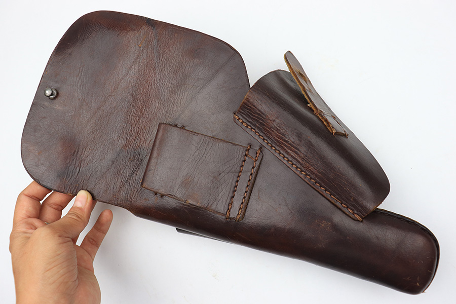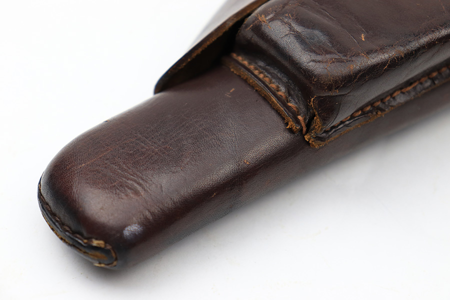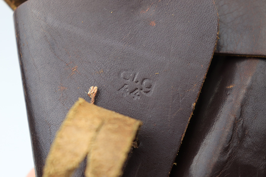 7/19/22 – This is an original High Power holster from WW2. The holster is maker stamped and dated under the closure strap. There’s a military waffen proof stamp on the interior leather. The chocolate brown leather is in great condition with mild surface wrinkling on the front lid and magazine pouch. Typical signs of use and aging throughout with normal pliability. No notable stitching flaws. Great overall condition.