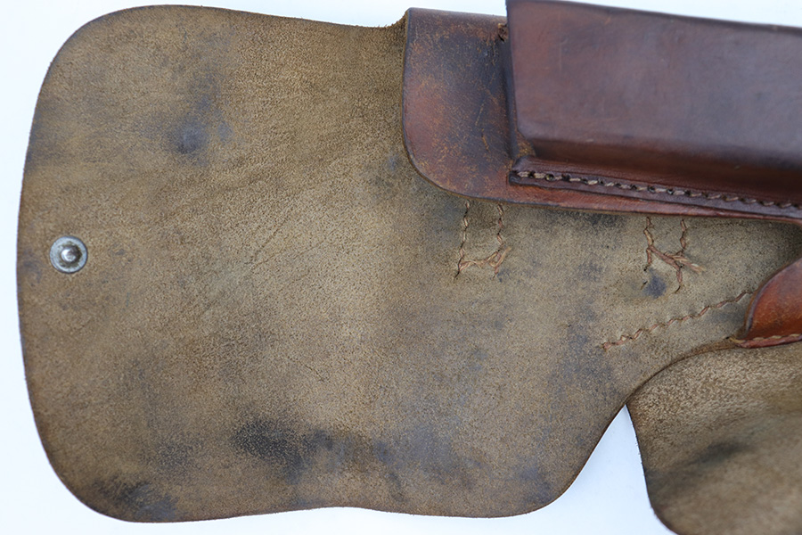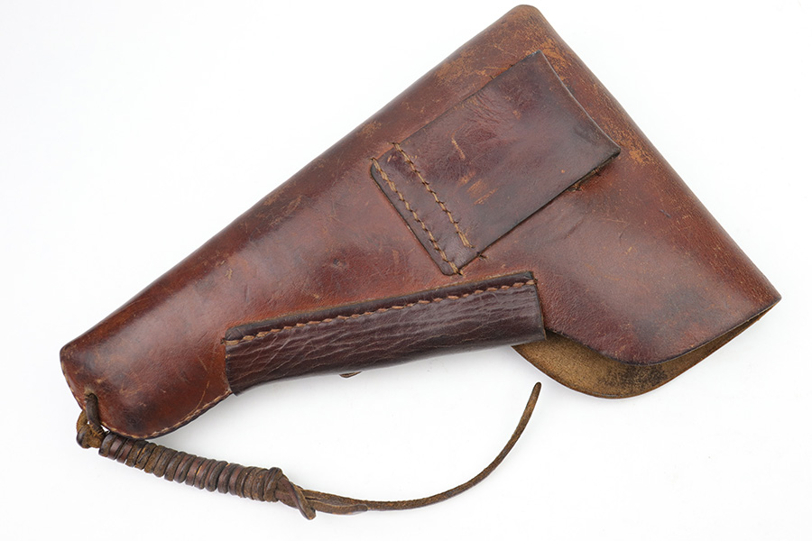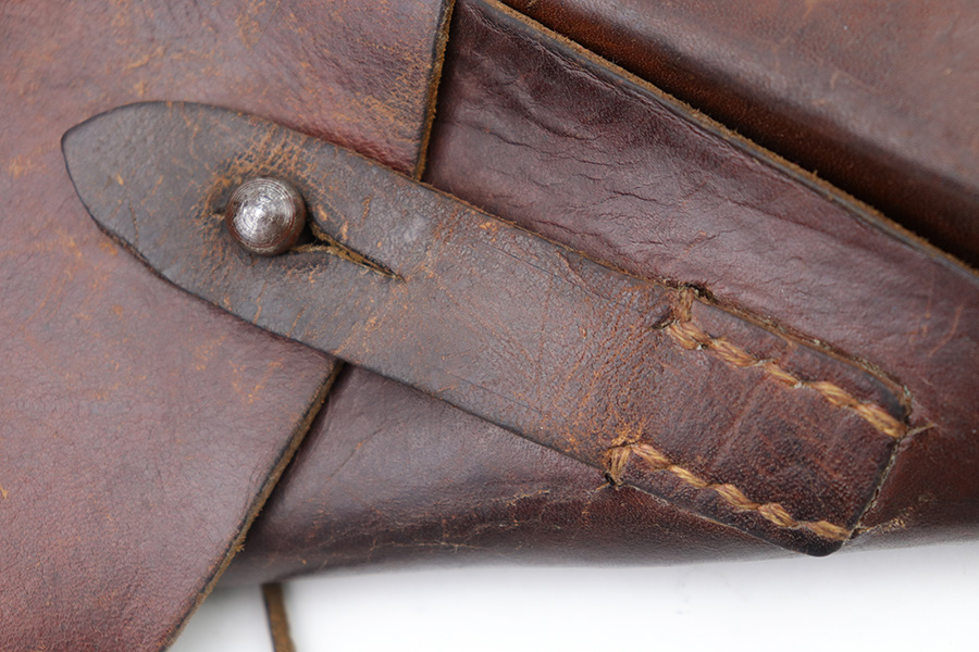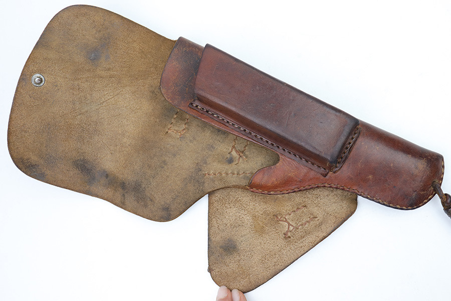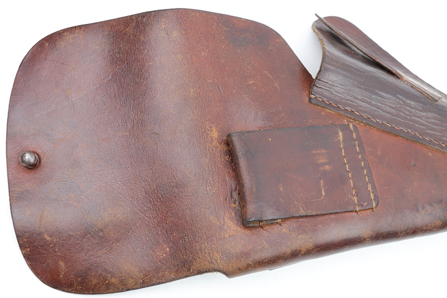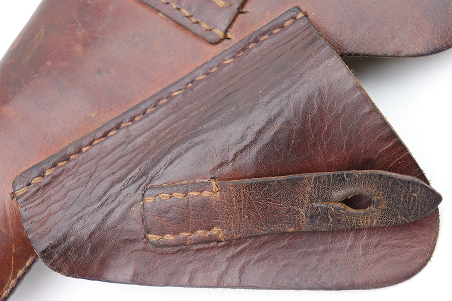 3/9/23 – This is an original 1944 dated High Power holster from WW2. The holster is in very good overall condition with some honest use and aging wear throughout the leather. A lanyard has been added to the toe of the holster, likely from the GI who brought this home. The holster is maker stamped and dated under the closure strap. No waffen proof is visible on the interior leather, as it likely faded out with age. The leather shows surface scuffs and light wear throughout. The leather is soft and pliable from use. No notable stitching flaws with all original stitching.