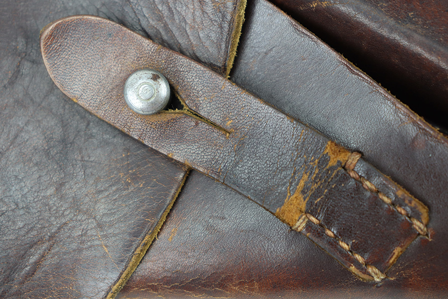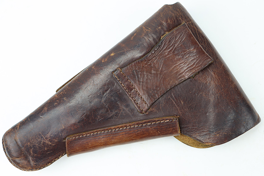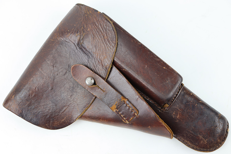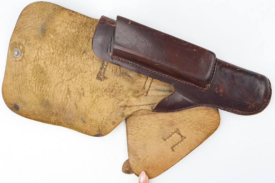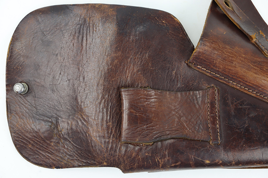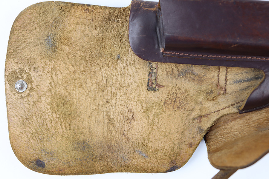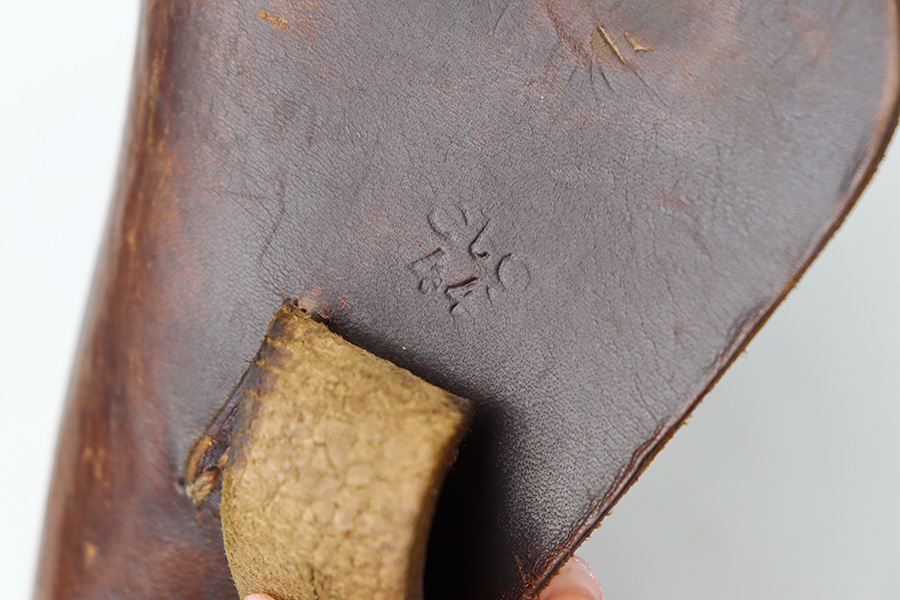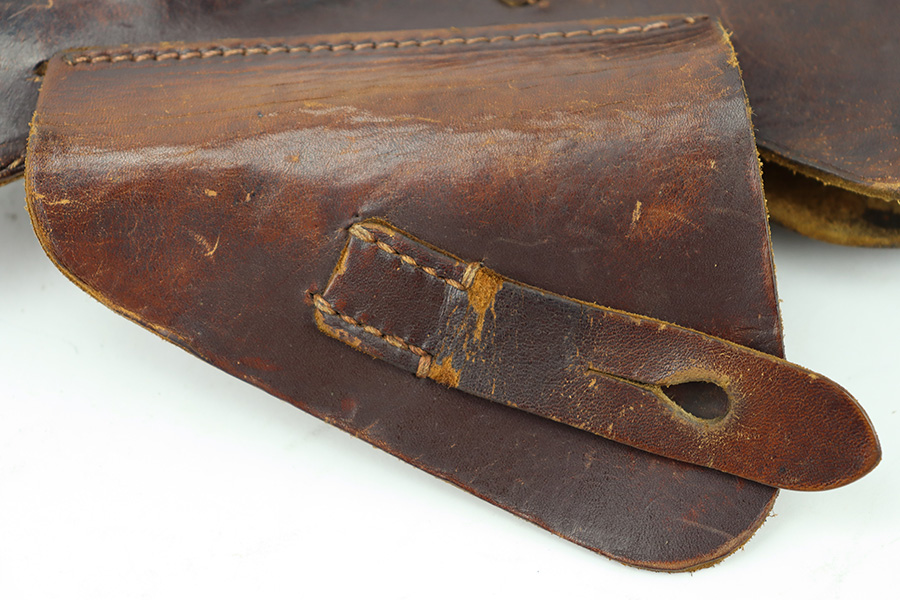 12/20/23 – This is an original 1944 dated High Power holster from WW2. The holster is maker and date stamped under the closure strap, on the side flap of leather. The interior leather has a very faint remnant of the waffen military proof stamp impressed into the leather. This is hard to find and see because of the interior roughness and general use wear present throughout the leather. The leather is soft and pliable with scuffing near the toe, top leather, and side flap. Light surface wear throughout the exterior. The stitching is all original and in great condition, except for 1-2 stitches loose on the side flap, which is a very minor flaw.