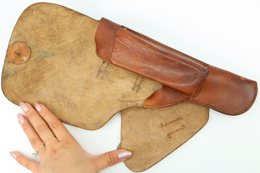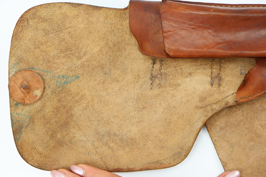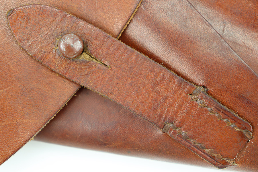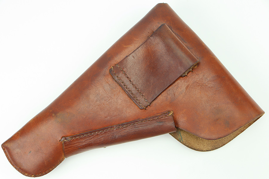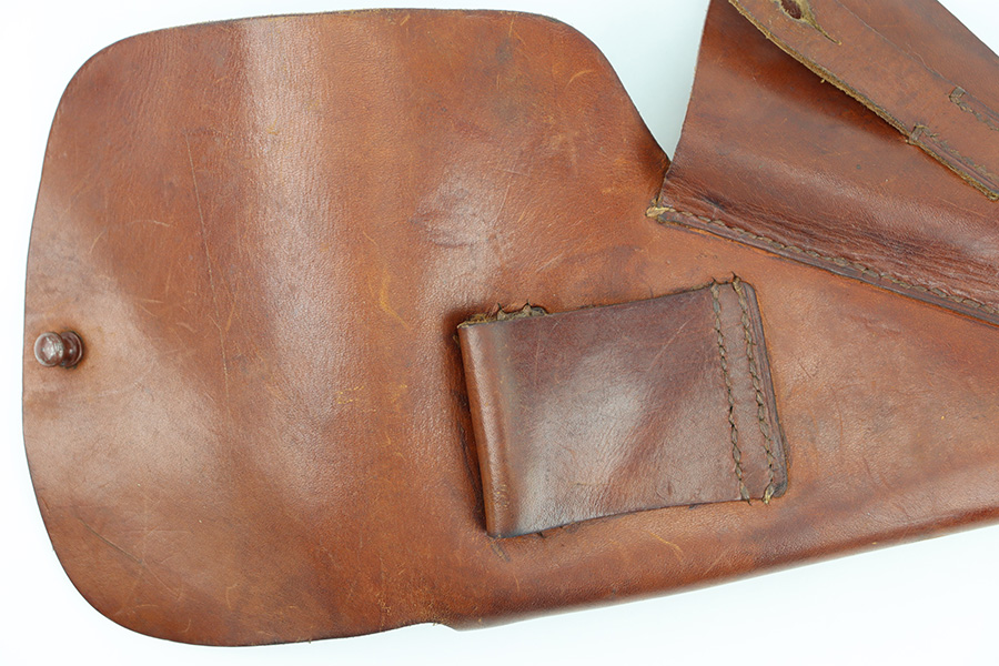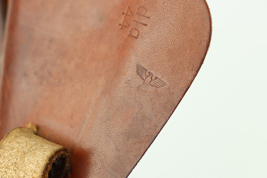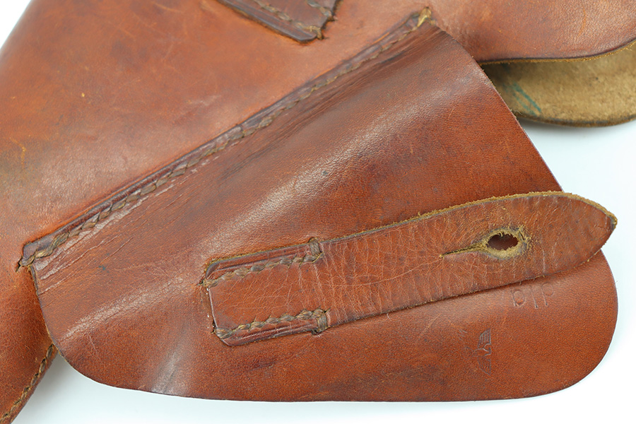 12/21/23 – This is an original, near-excellent condition High Power holster from WW2. The holster is maker code stamped and 1944 date stamped under the closure strap. There’s also a waffen military proof stamp on the side flap near these other markings. The leather is soft and pliable from age and use, but is very clean overall. No major issues or notable flaws. Excellent original stitching throughout. A very nice collectible example.