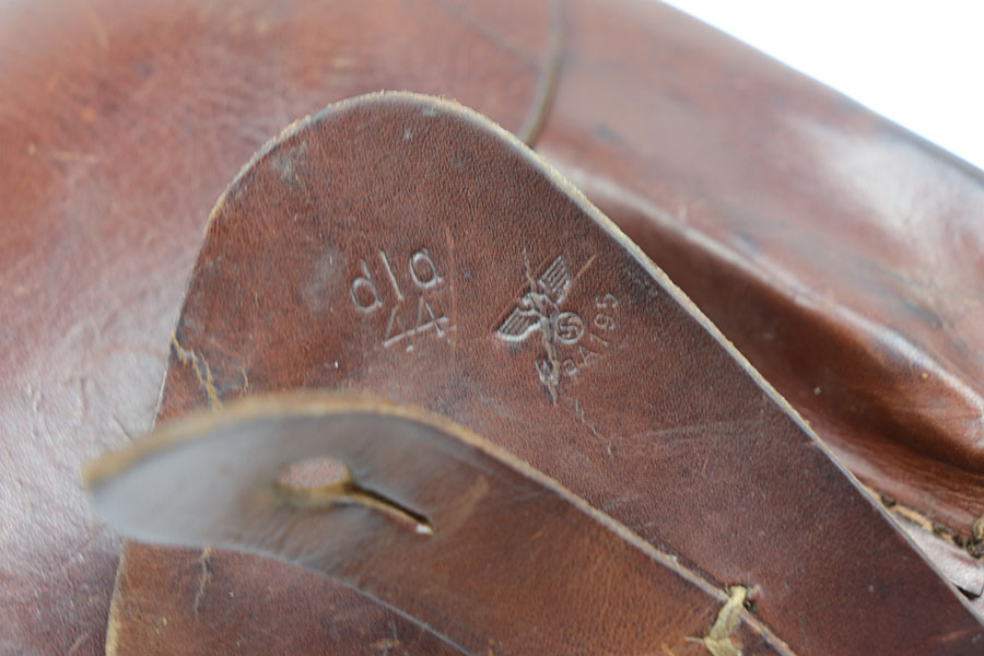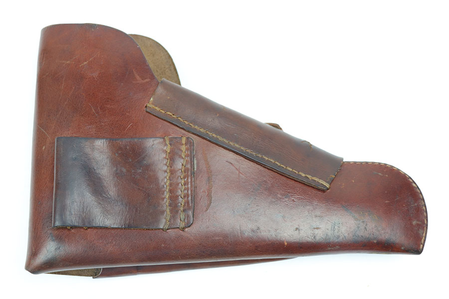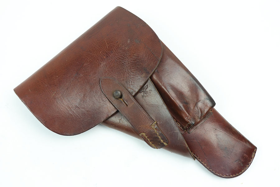 10/27/20 – This is an original 1944 dated High Power holster in great overall condition. The brown leather is all in tact with some light surface wrinkling but no major damage. Normal pliability. All original stitching in tact. Maker stamped, dated, and waffen proofed under the closure strap.