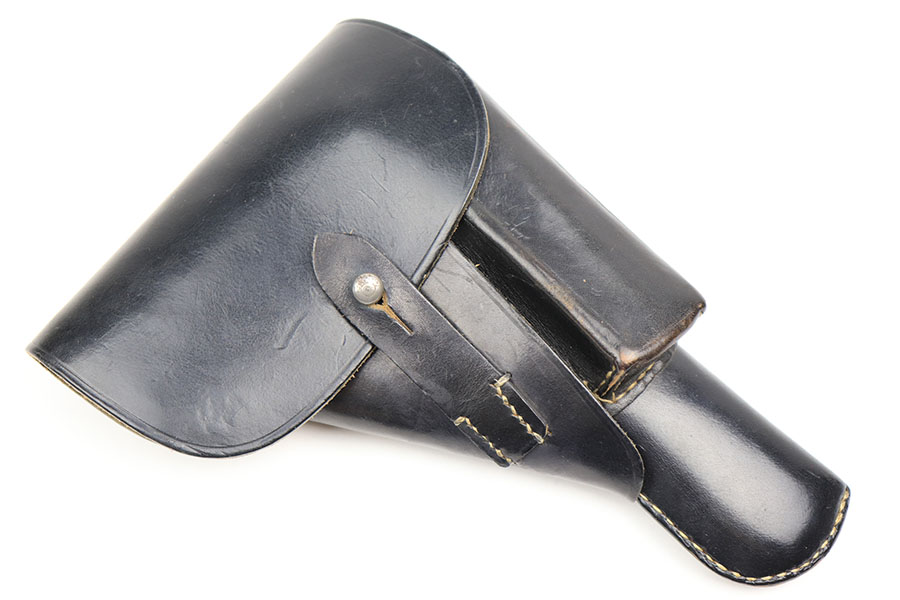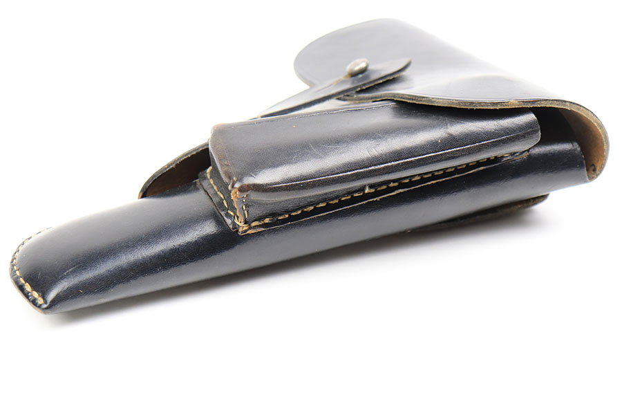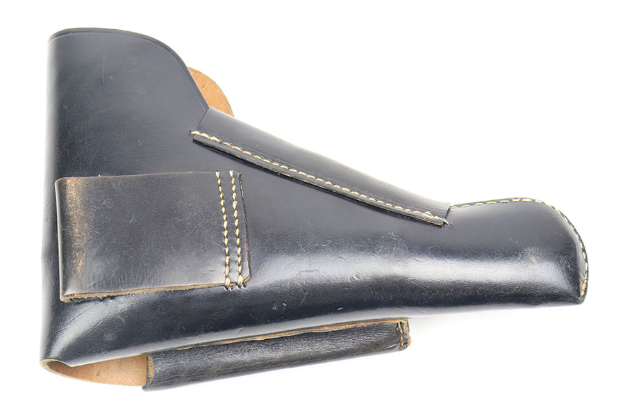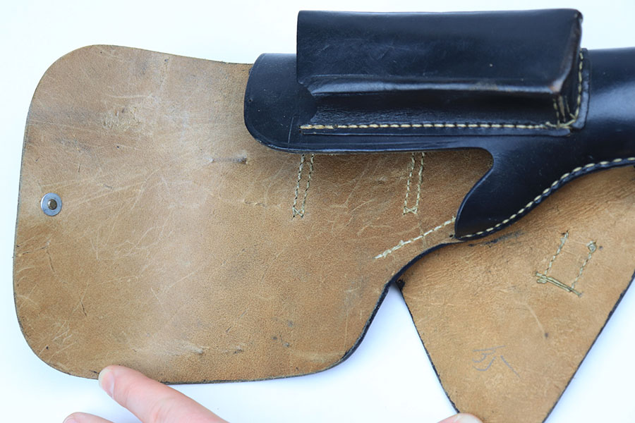 1/20/21 – This is an excellent, original 1944 production High Power holster. The holster has very clean leather both internally and externally. The interior leather is stamped “hlv 4” in the upper left corner. No other visible markings. There are no notable flaws in the leather and the stitching is all original and in tact.