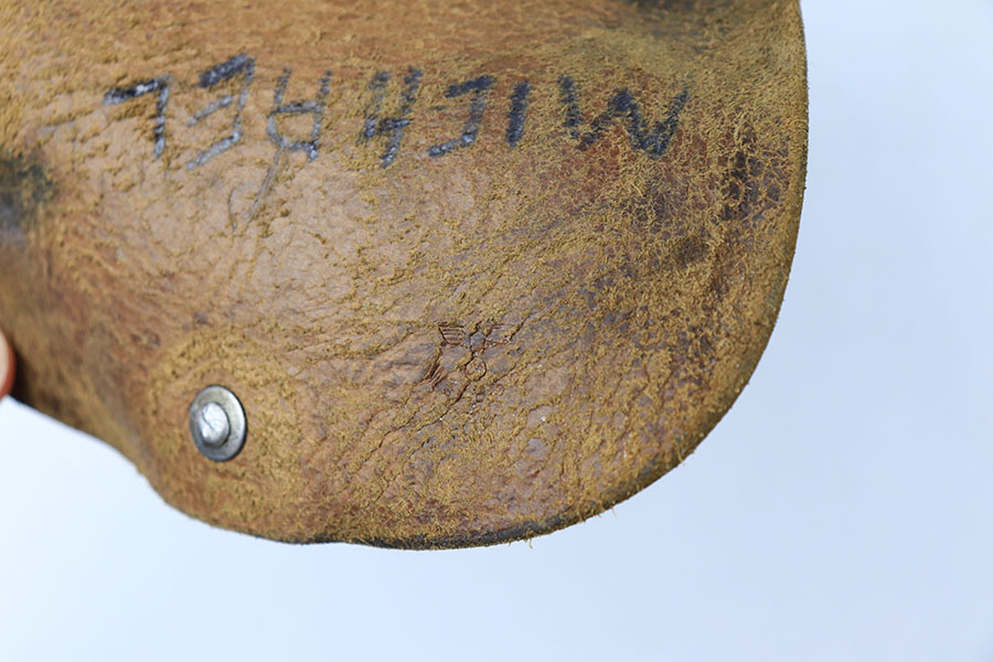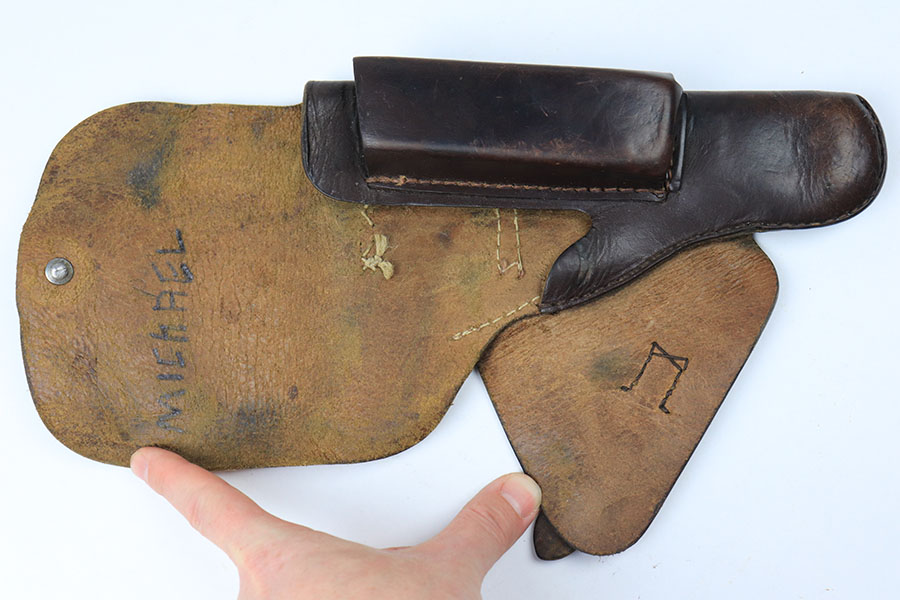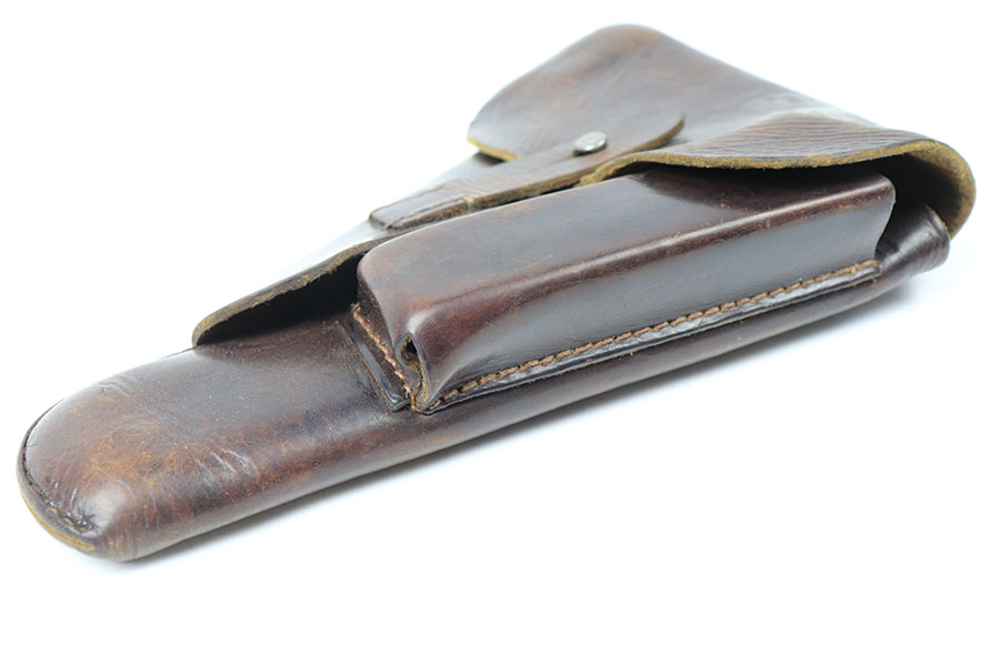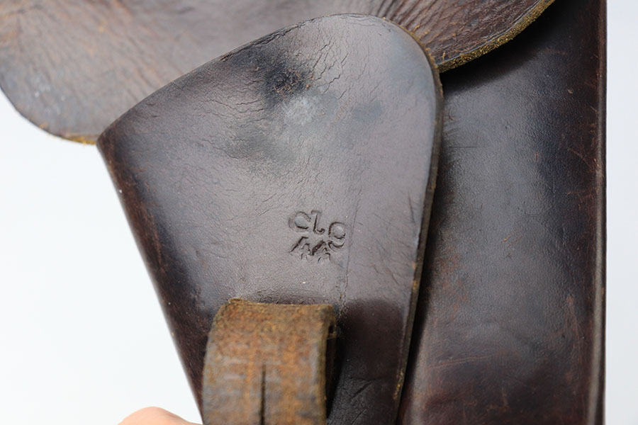 8/24/21 – This is an original 1944 dated High Power Holster from WW2. The holster is maker stamped and dated under the closure strap. The interior leather is waffen proof stamped. The interior leather also has a name “Michael” written in ink. The leather is soft and pliable with light surface wrinkling in a few areas. No stitching issues.