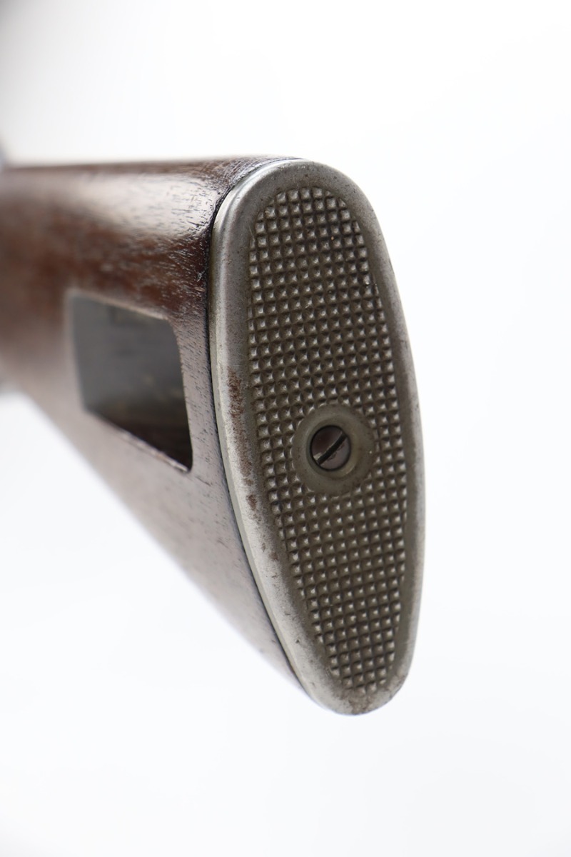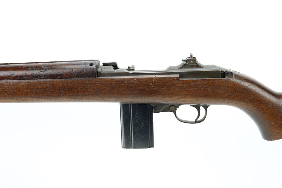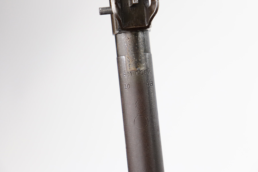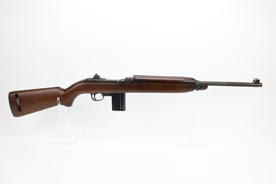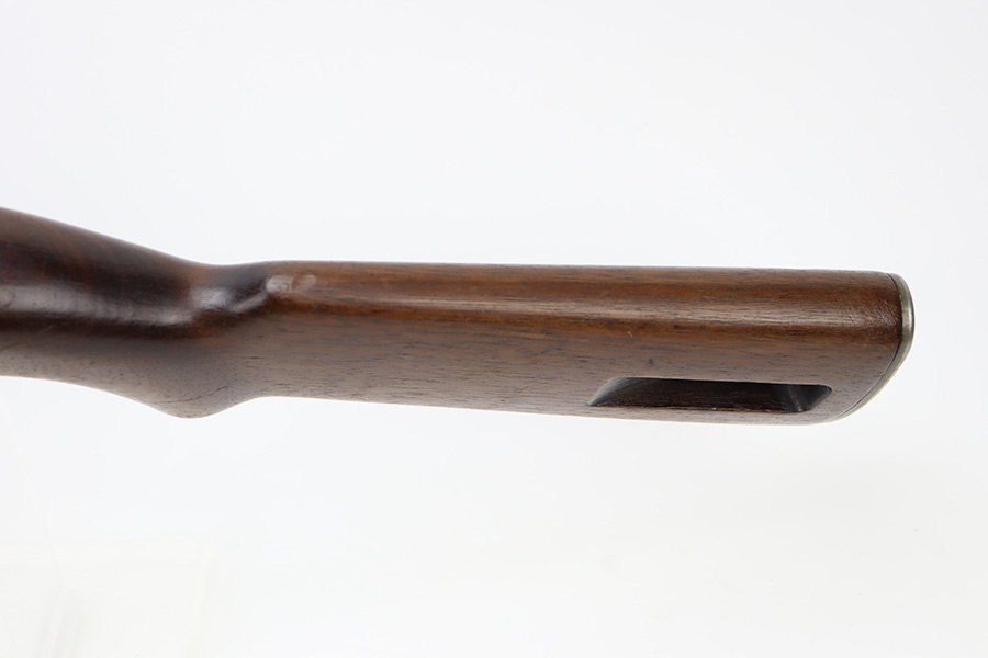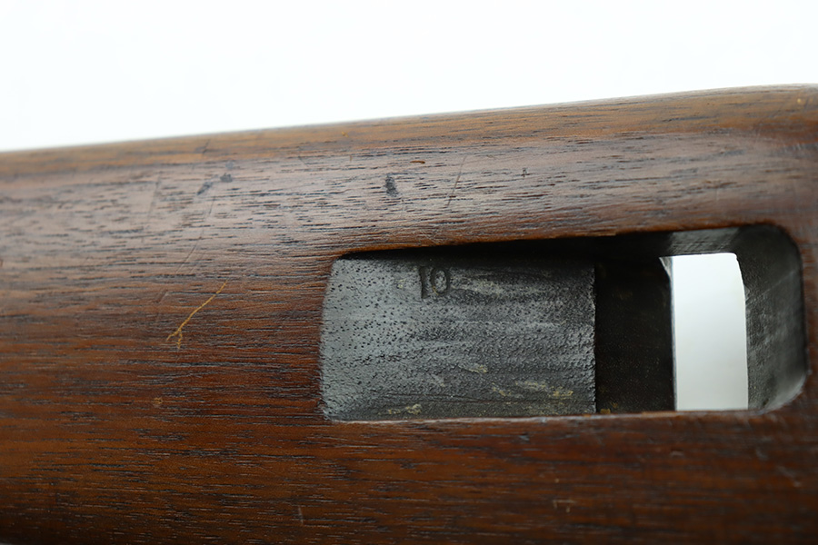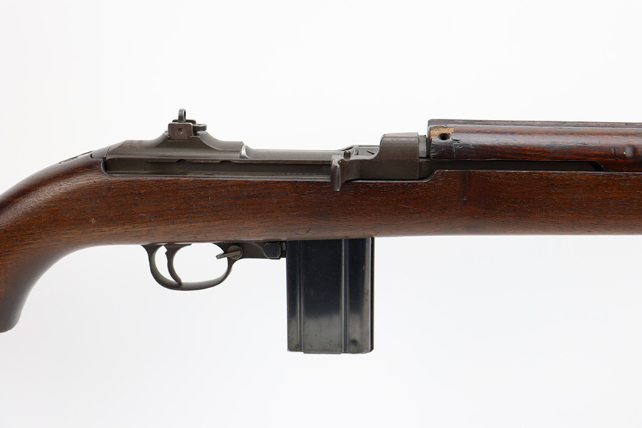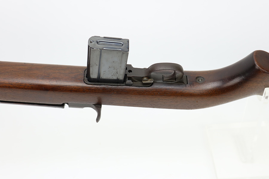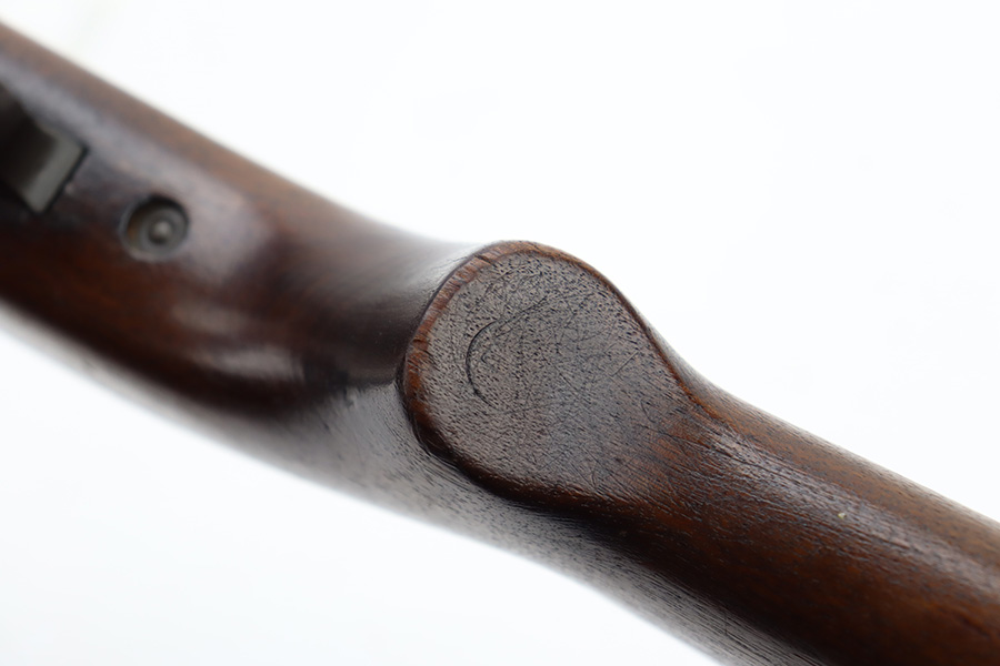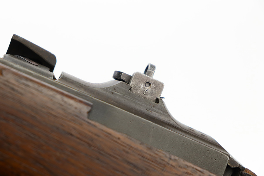 12/7/23 – This is a nice IBM M1 Carbine issued to the US military in 1944. The barrel is IBM-marked and dated 10-43. “IO” marked Inland stock with a cross-canon cartouche and “H” marking on the right side of the butt stock. The top of the barrel near the front sight appears to have been milled. There is very little actual finish loss on the metal parts, but there is brown patina under the finish throughout. Overall, the wood is pretty nice, but there is a small chip in the upper hand guard and a rectangular cut-out on the left side of the stock, up against the receiver. Excellent bore.