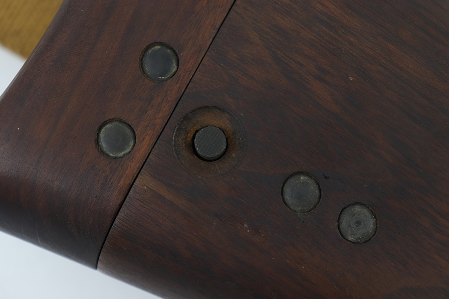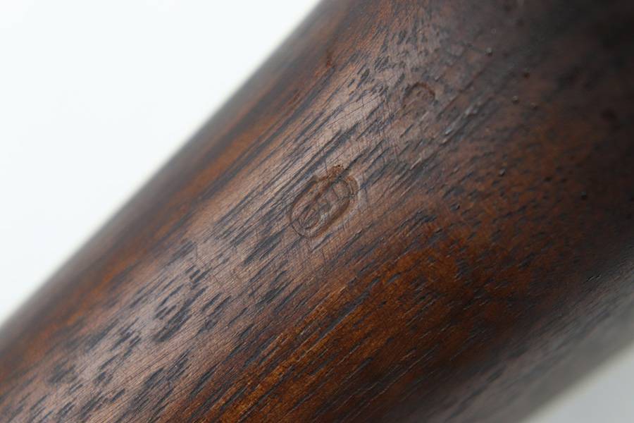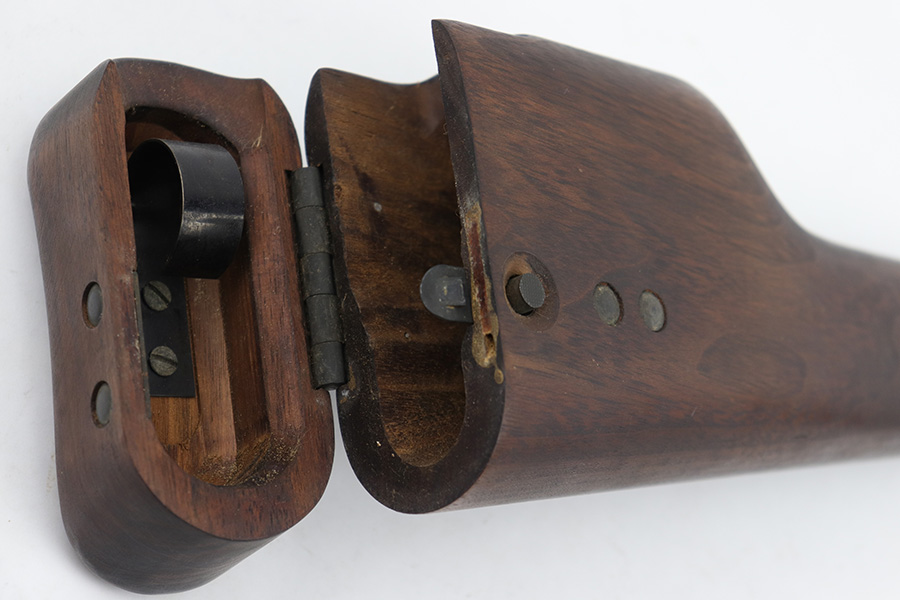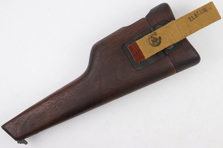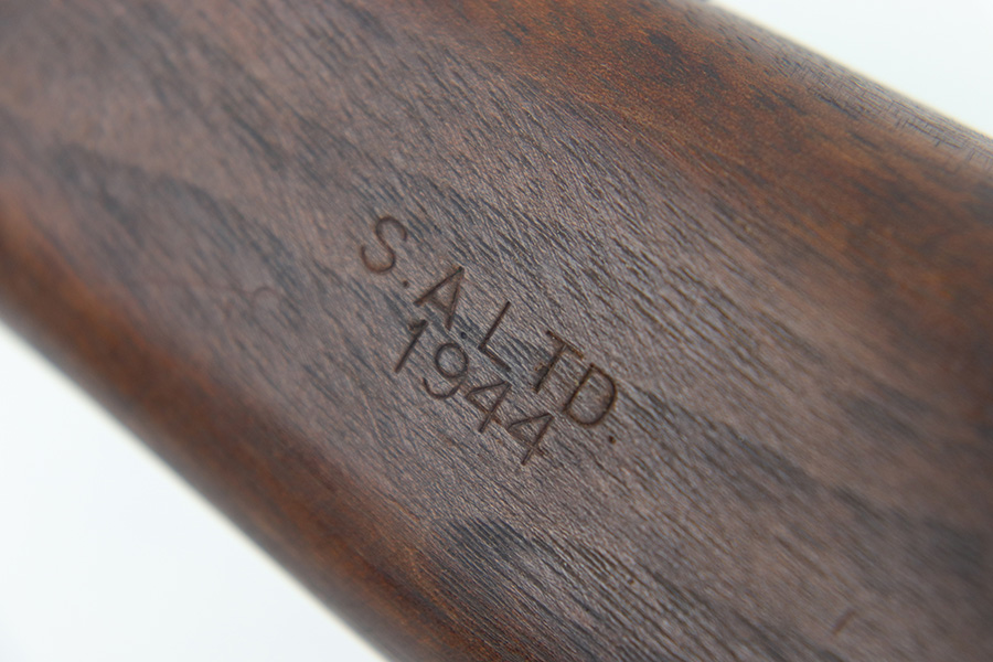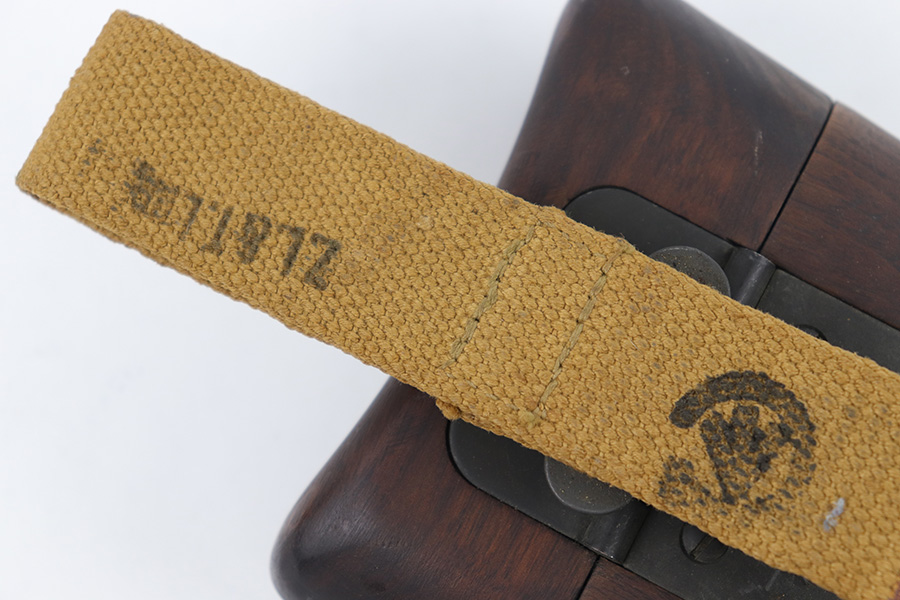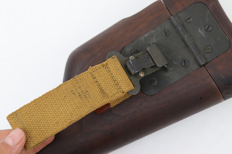 4/19/23 – This is an original 1944 dated Inglis High Power wood stock / holster. The exterior wood is maker and date stamped, “S.A. LTD. 1944”. There’s also a small proof stamp on the exterior wood. No cracks or chips and excellent overall condition. The metal fittings are excellent as well. Comes with an attached canvas hanger with an ink proof stamp.