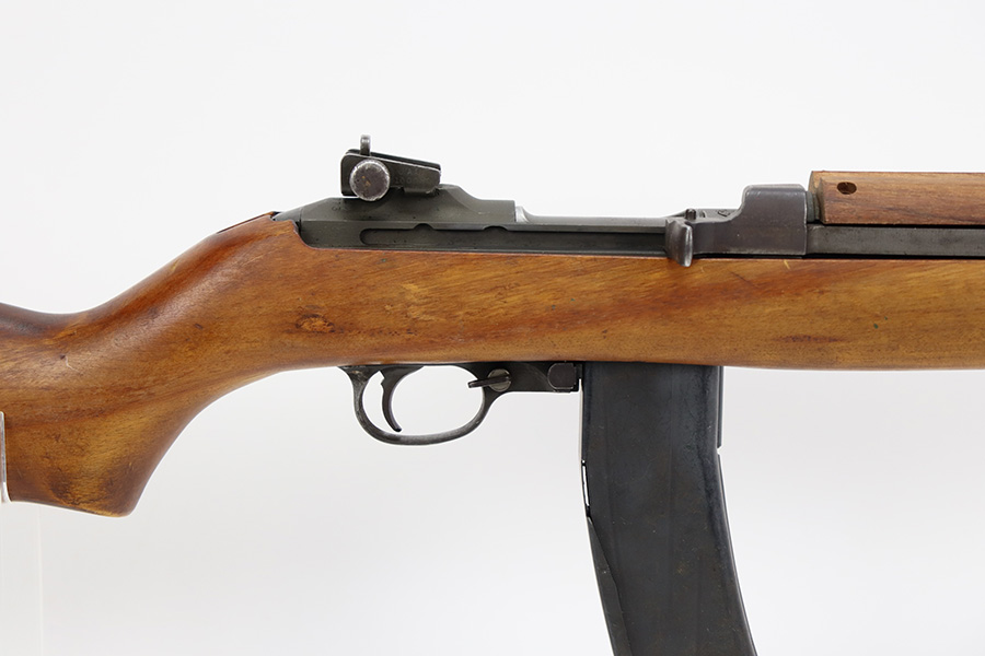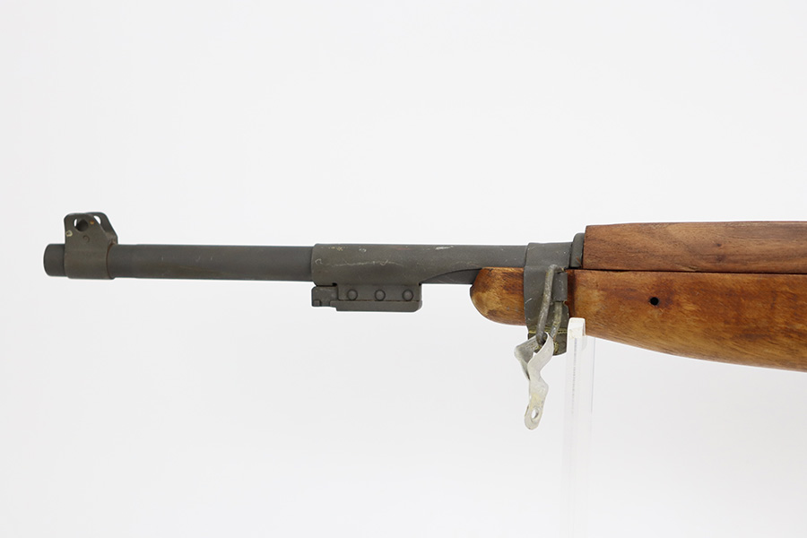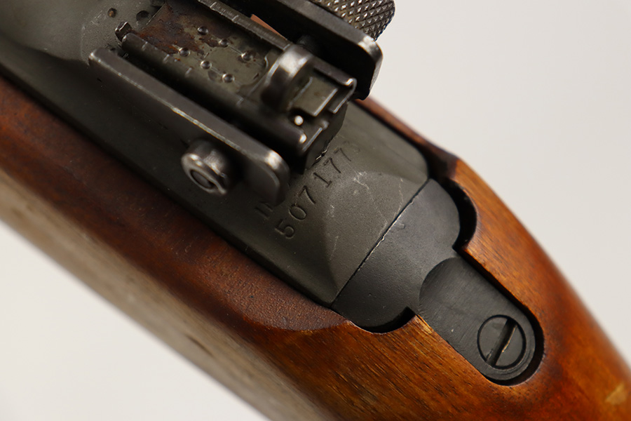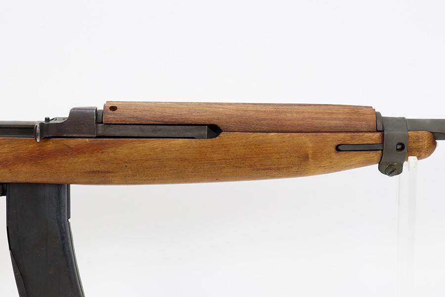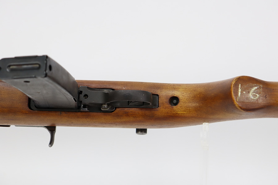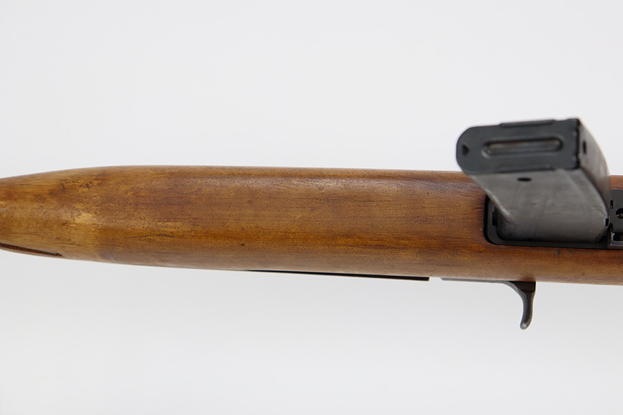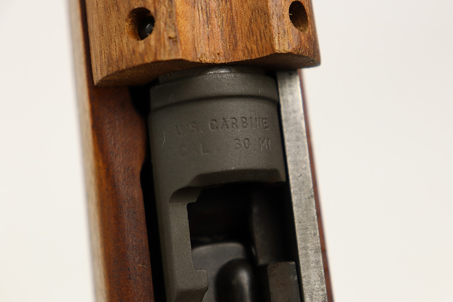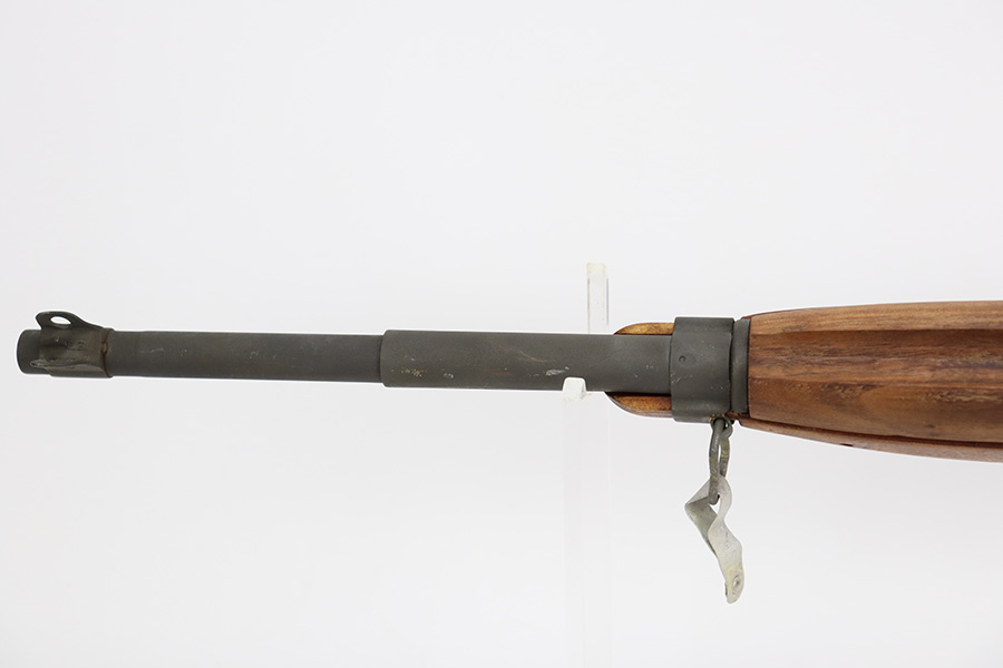 8/30/23 – This is a nice example of an Inland M1 Carbine. The serial number on the receiver dates it to 1944. No visible markings on the barrel. An adjustable rear sight and bayonet lug were added later. The entire gun has been refinished. There is almost no actual finish loss, just a couple of light scuffs on the barrel. Very nice wood stock, but there are a couple of small wood repairs and a noticeable chip around the sling well. Comes with a 30-rd magazine. The bore is mostly shiny with good rifling, but there is some pin-pricking around the muzzle end. There is some sort of metal inventory tag on the sling swivel.