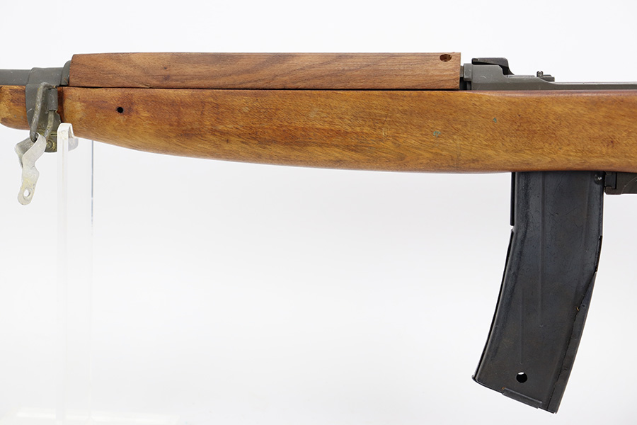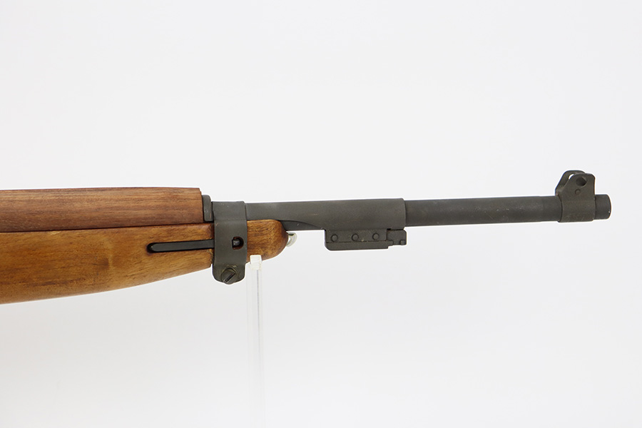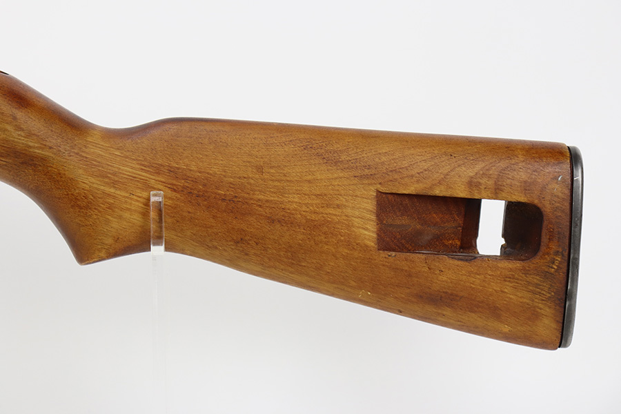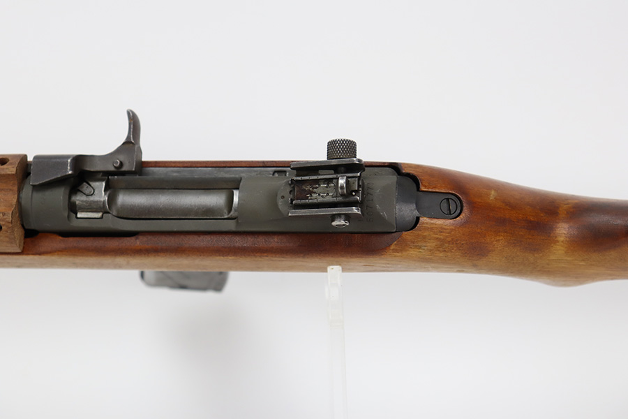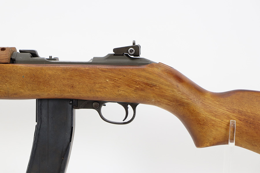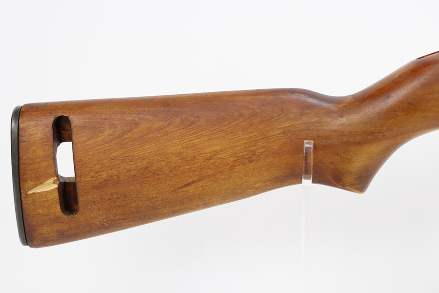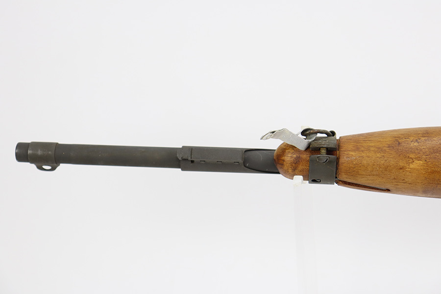 8/30/23 – This is a nice example of an Inland M1 Carbine. The serial number on the receiver dates it to 1944. No visible markings on the barrel. An adjustable rear sight and bayonet lug were added later. The entire gun has been refinished. There is almost no actual finish loss, just a couple of light scuffs on the barrel. Very nice wood stock, but there are a couple of small wood repairs and a noticeable chip around the sling well. Comes with a 30-rd magazine. The bore is mostly shiny with good rifling, but there is some pin-pricking around the muzzle end. There is some sort of metal inventory tag on the sling swivel.