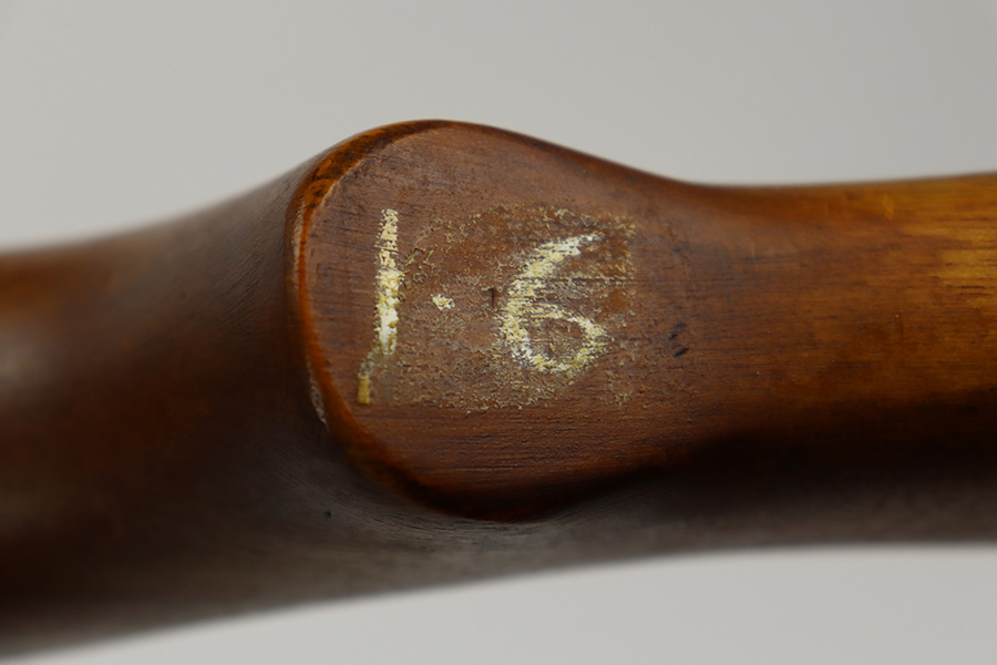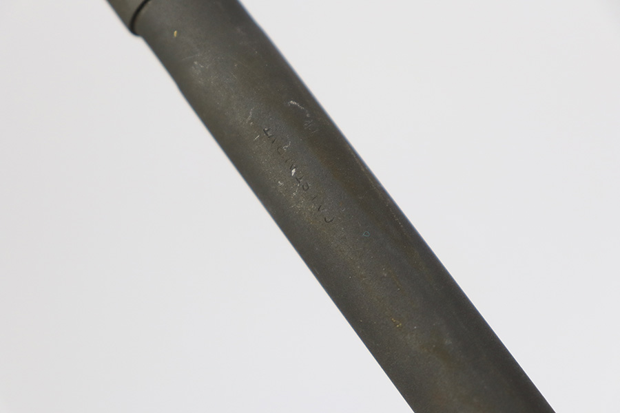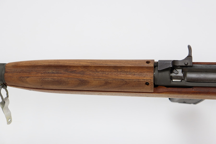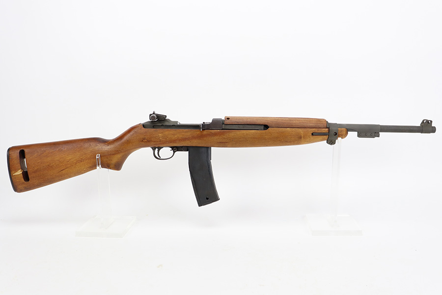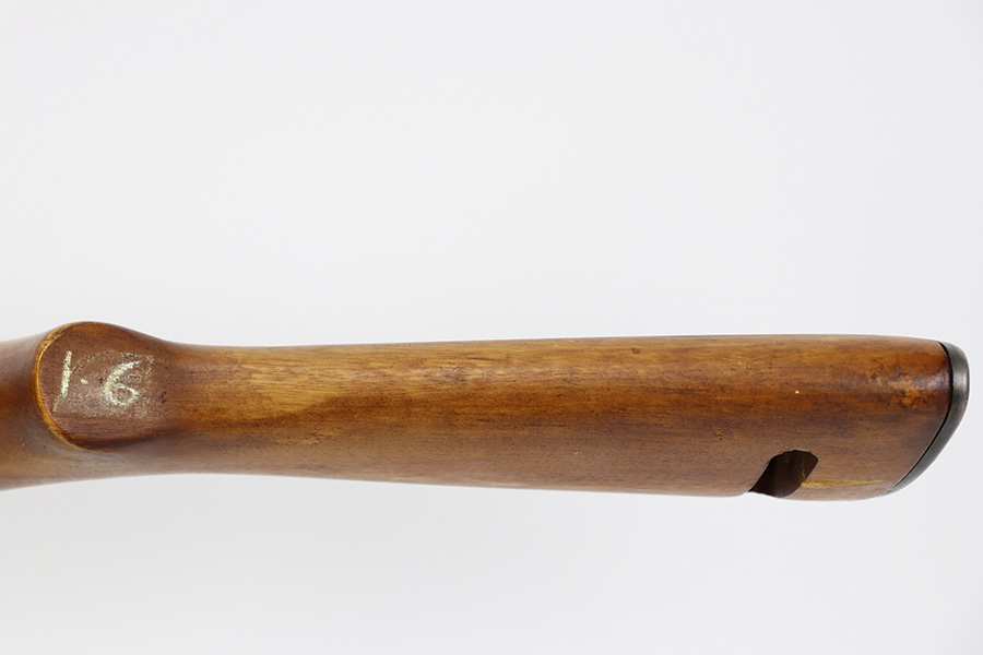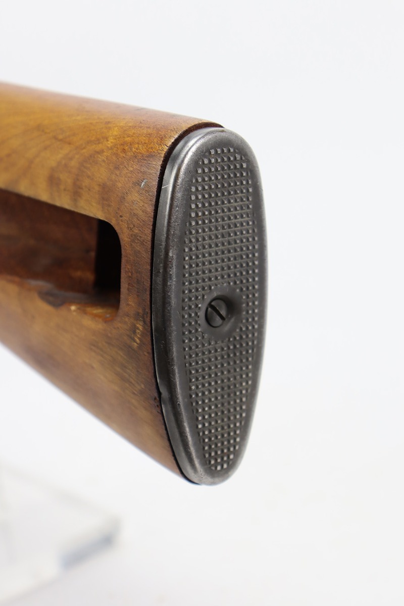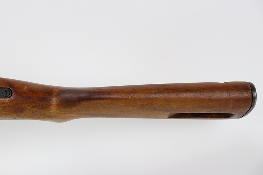 8/30/23 – This is a nice example of an Inland M1 Carbine. The serial number on the receiver dates it to 1944. No visible markings on the barrel. An adjustable rear sight and bayonet lug were added later. The entire gun has been refinished. There is almost no actual finish loss, just a couple of light scuffs on the barrel. Very nice wood stock, but there are a couple of small wood repairs and a noticeable chip around the sling well. Comes with a 30-rd magazine. The bore is mostly shiny with good rifling, but there is some pin-pricking around the muzzle end. There is some sort of metal inventory tag on the sling swivel.