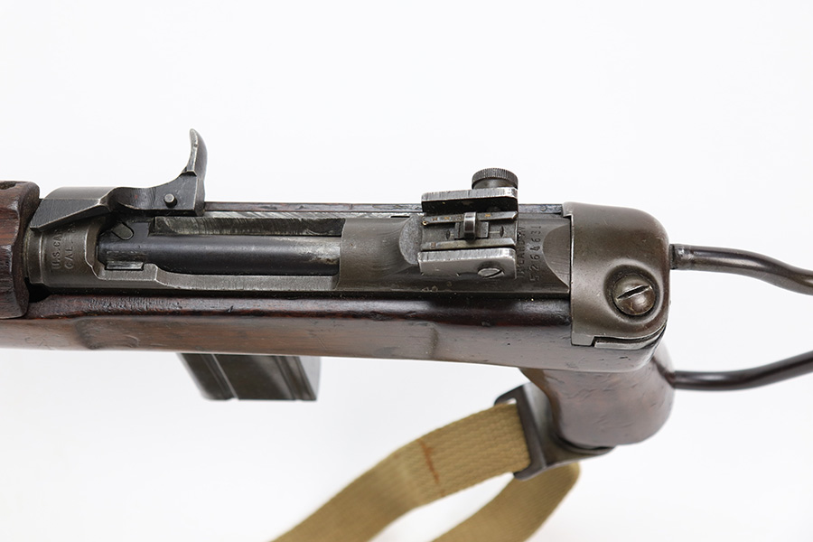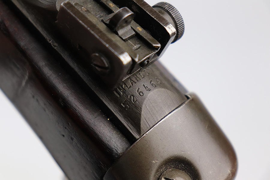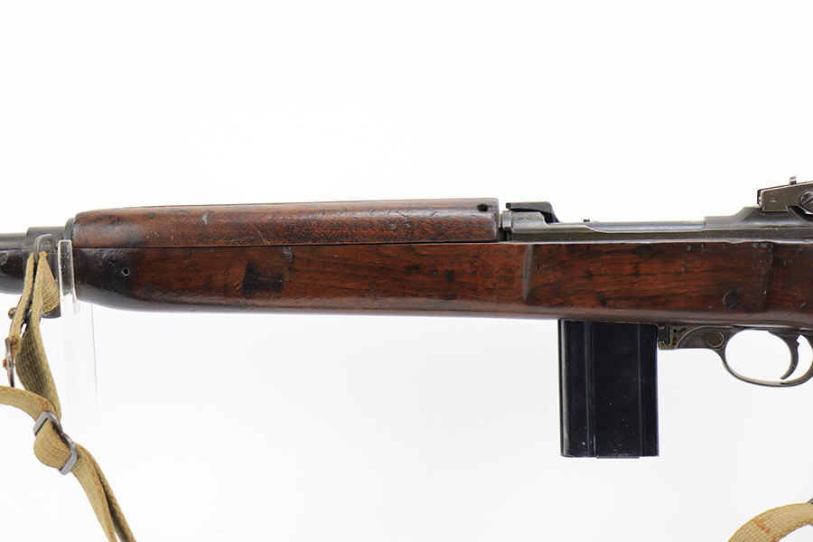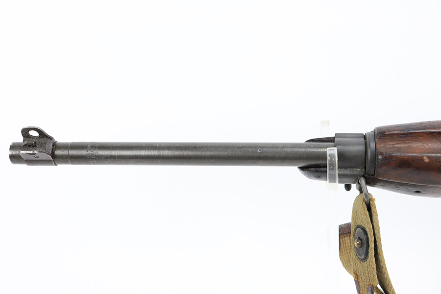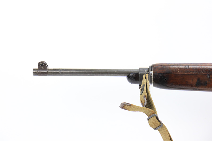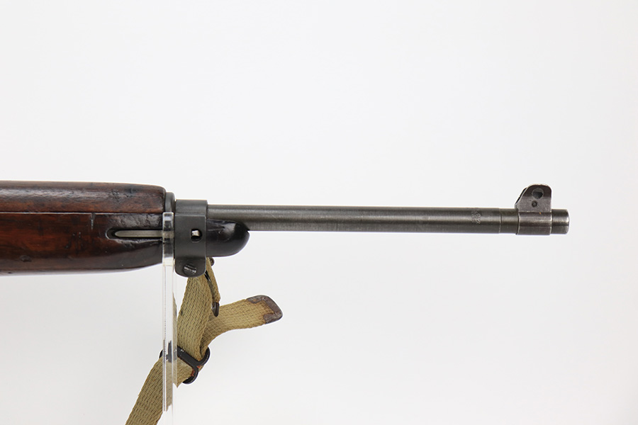 12/6/23 – This is a nice example of a late-war Inland M1 Carbine from 1944. It has an adjustable rear sight, which could be correct for a gun this late. No bayonet lug. The barrel is Inland and is dated June of 1944. The stock appears to be correct, but there are no “P” or cross-canon proofs on the grip. The finish on the metal parts rates somewhere between 85-90% with general high edge wear and some minor thinning along the barrel. The wood shows small dings and bruises throughout. Mint bore. Comes with one proper magazine and a nice canvas sling.