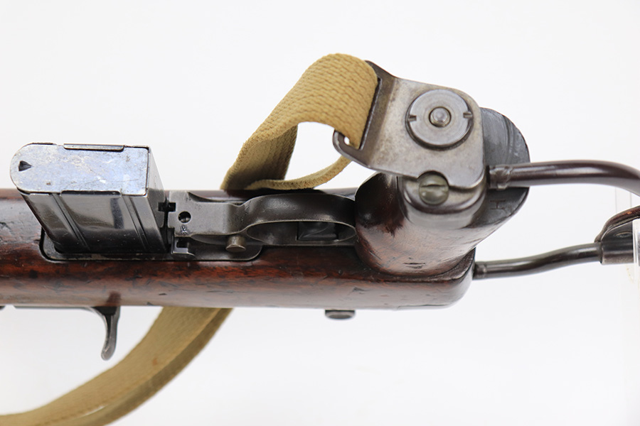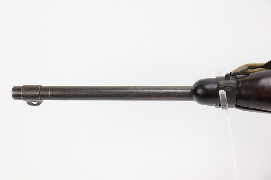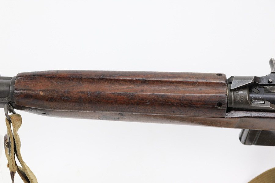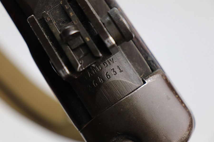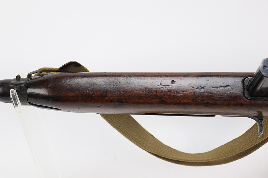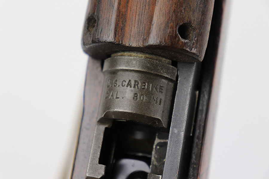 12/6/23 – This is a nice example of a late-war Inland M1 Carbine from 1944. It has an adjustable rear sight, which could be correct for a gun this late. No bayonet lug. The barrel is Inland and is dated June of 1944. The stock appears to be correct, but there are no “P” or cross-canon proofs on the grip. The finish on the metal parts rates somewhere between 85-90% with general high edge wear and some minor thinning along the barrel. The wood shows small dings and bruises throughout. Mint bore. Comes with one proper magazine and a nice canvas sling.
