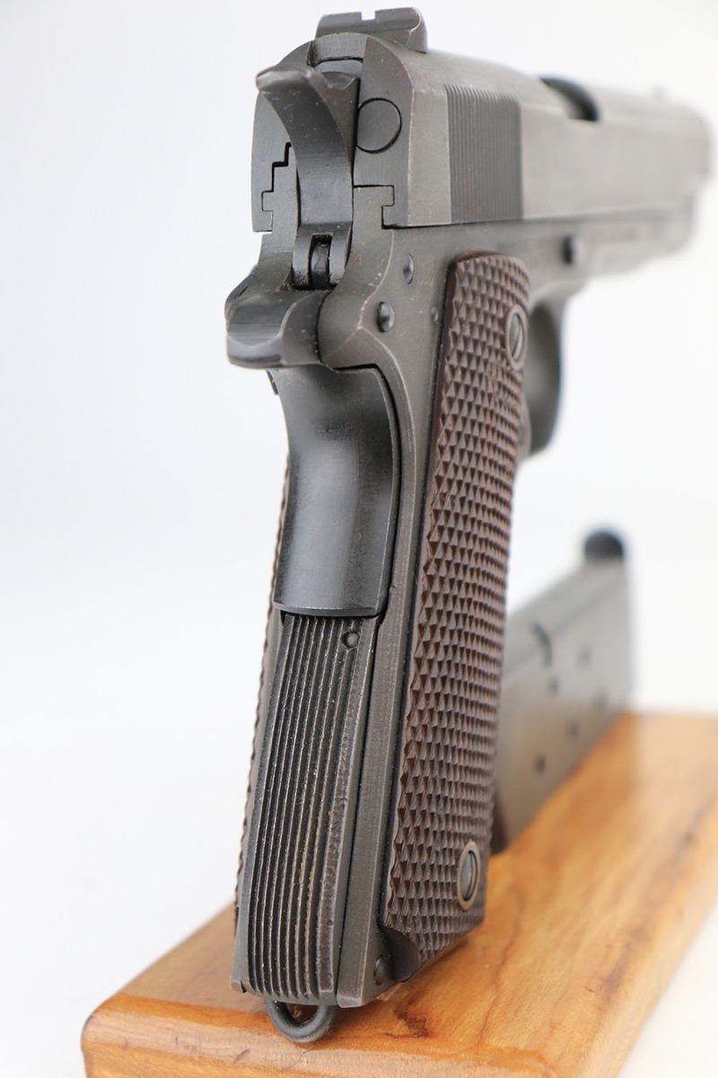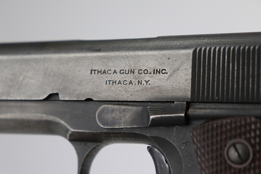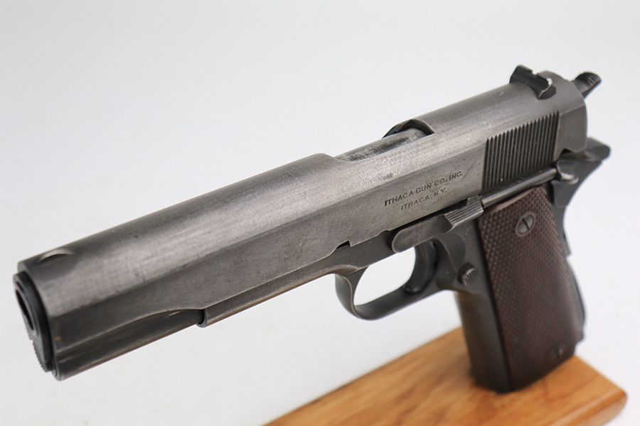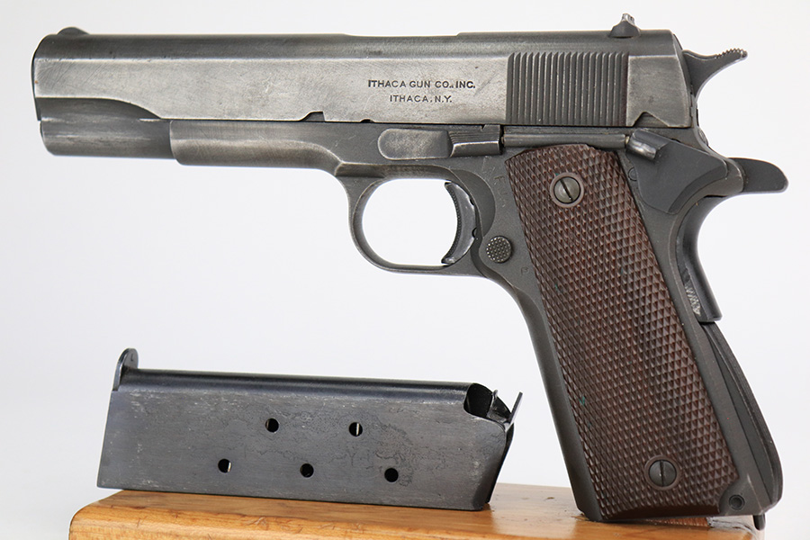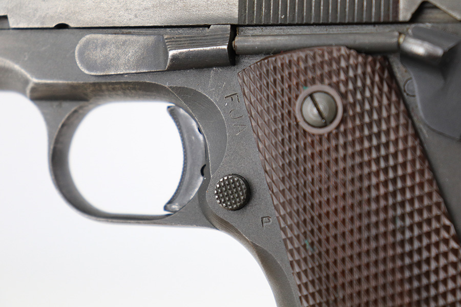 4/26/22 – This is a nice example of an Ithaca Model 1911A1 issued to the US military in 1944. It is “United States Property” marked, has the proper “FJA” inspection initials, and has a cross-canon military cartouche on the left side of the frame. The barrel was made by Flannery. This particular gun has retained roughly 65% of its parkerized finish. There are areas of thinning throughout, most noticeable on both sides of the slide. Minor wear on the high edges in general and around the muzzle. A few tiny dots of oxidation here and there. Comes with excellent period-correct plastic grips and a period-correct “L” marked magazine. Very nice bore with strong rifling and just hints of frosting in the grooves.