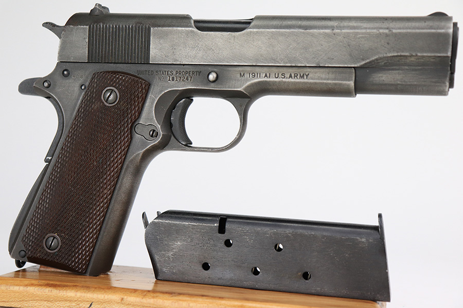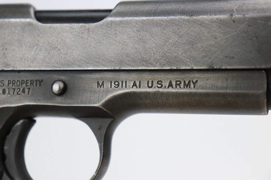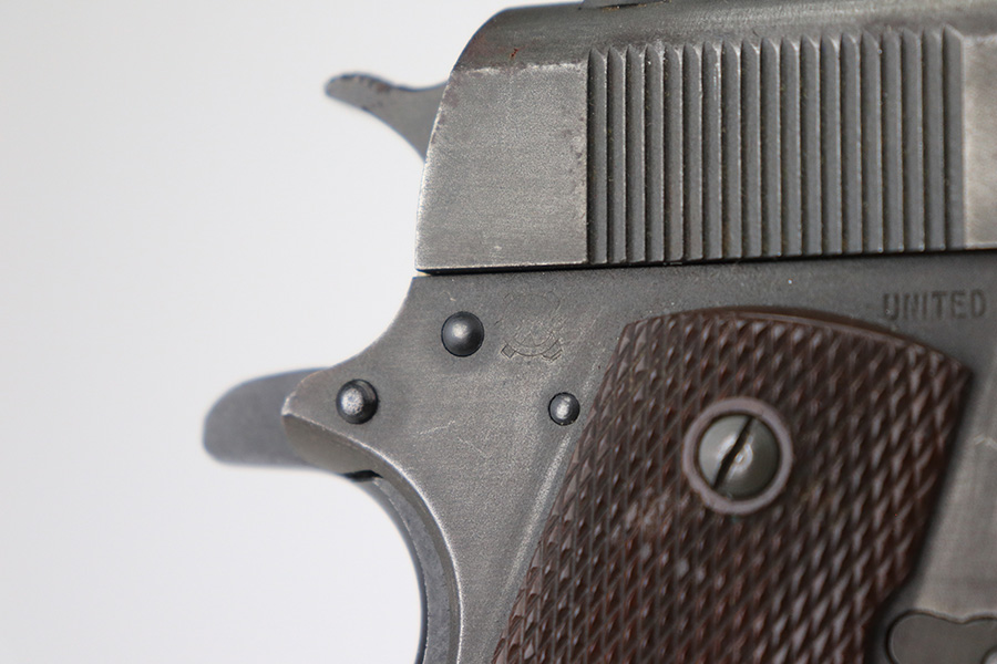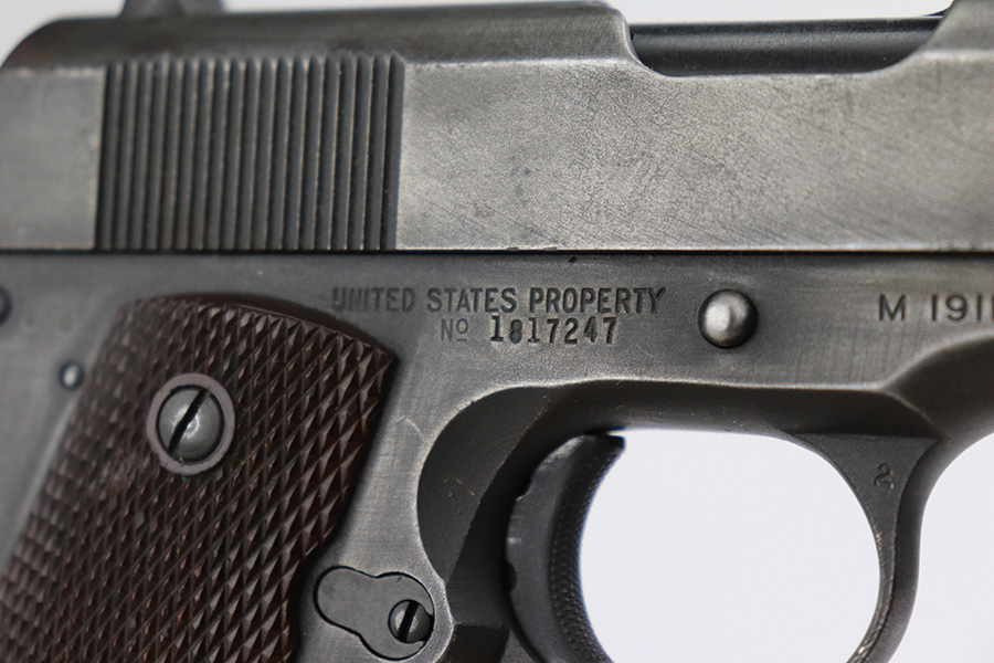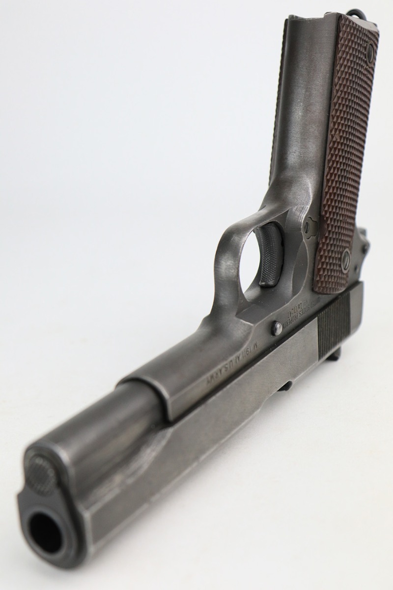4/26/22 – This is a nice example of an Ithaca Model 1911A1 issued to the US military in 1944. It is “United States Property” marked, has the proper “FJA” inspection initials, and has a cross-canon military cartouche on the left side of the frame. The barrel was made by Flannery. This particular gun has retained roughly 65% of its parkerized finish. There are areas of thinning throughout, most noticeable on both sides of the slide. Minor wear on the high edges in general and around the muzzle. A few tiny dots of oxidation here and there. Comes with excellent period-correct plastic grips and a period-correct “L” marked magazine. Very nice bore with strong rifling and just hints of frosting in the grooves.