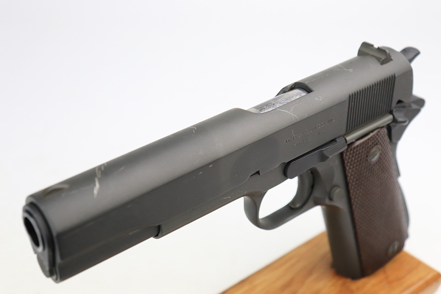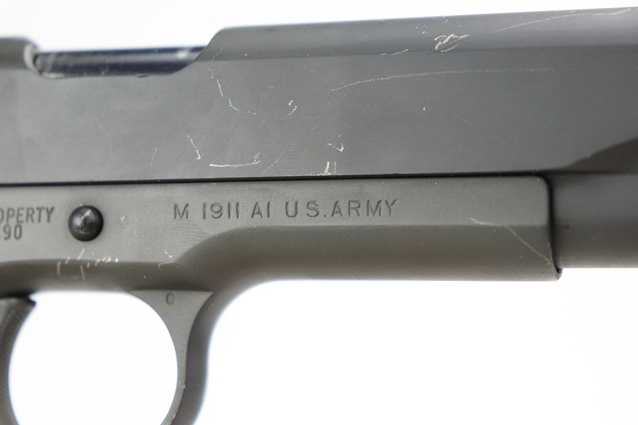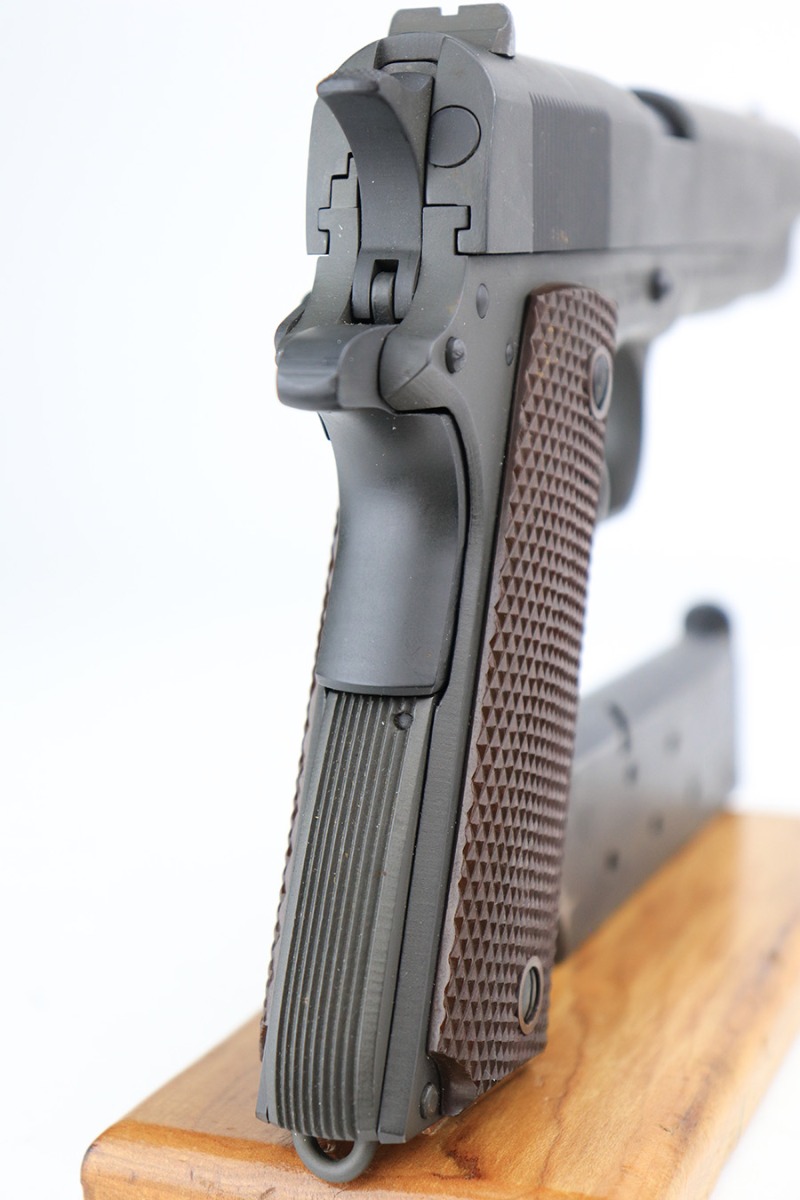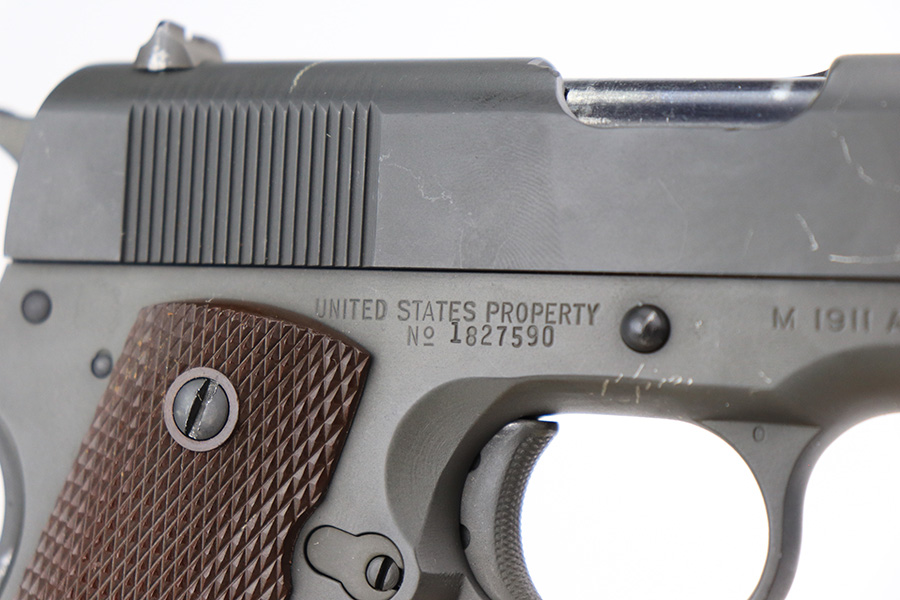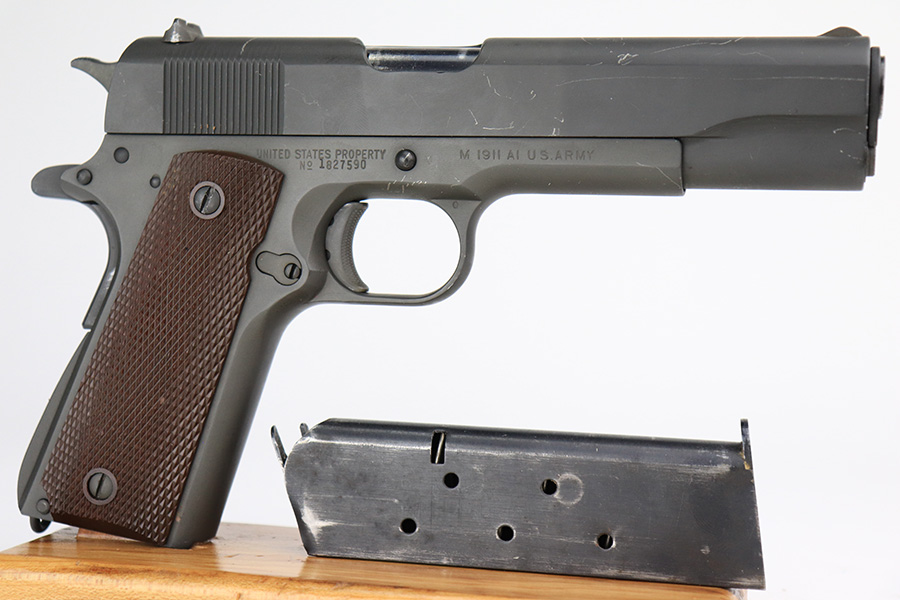 4/26/22 – This is an excellent example of a Colt Model 1911A1 issued to the US military in 1944. The gun is “United States Property” marked, has the appropriate “FJA” military inspection initials, and has the proper cross-canon military cartouche. High Standard barrel. This entire gun has been professionally restored and re-parkerized. There is very little actual finish loss, but unfortunately there are a few noticeable scratches on the slide and frame. Comes with excellent plastic grips and a period-correct “R” marked magazine. Minty bore.
