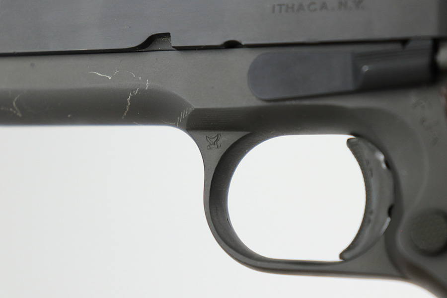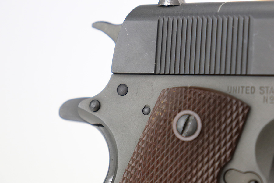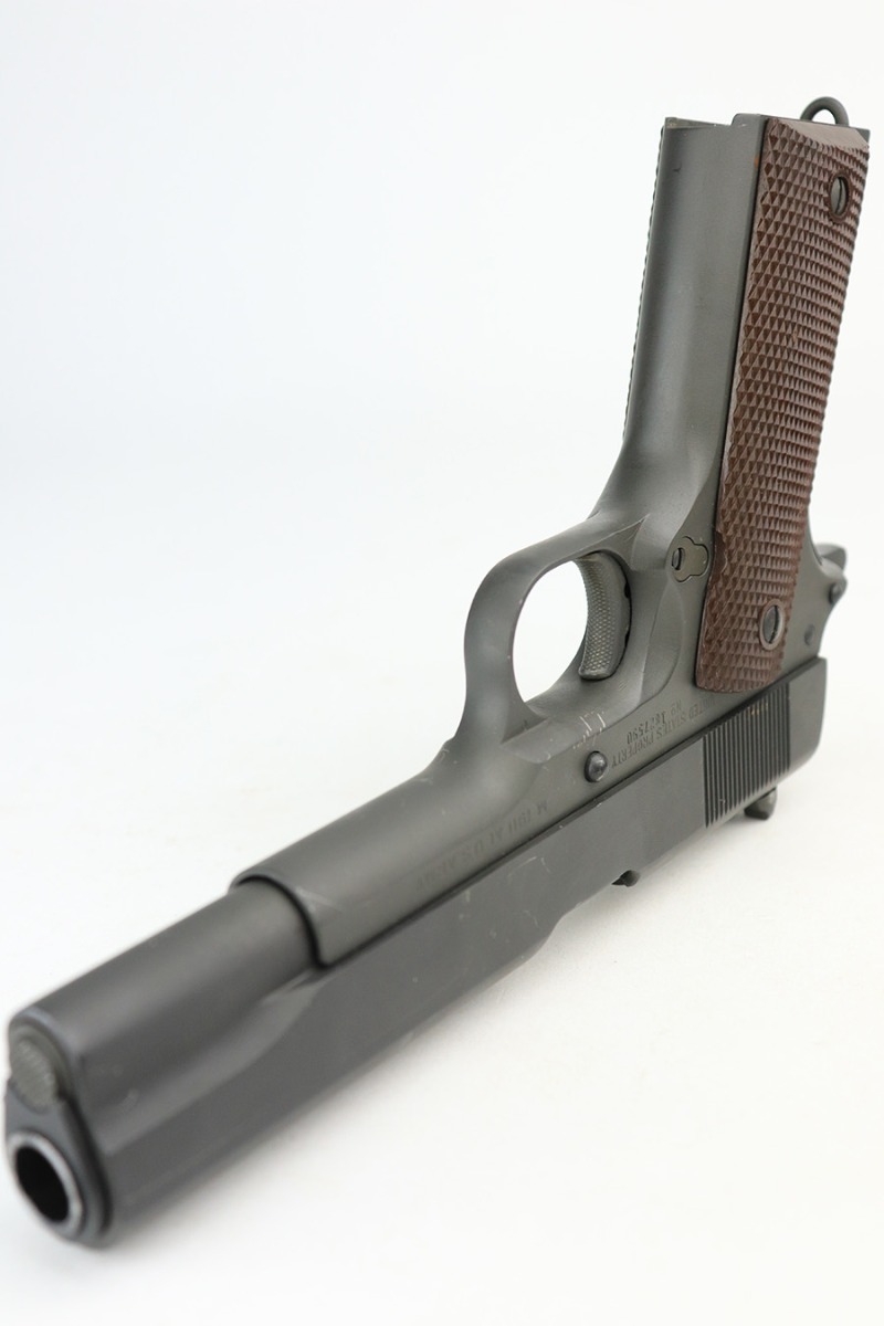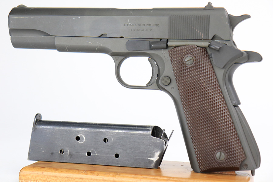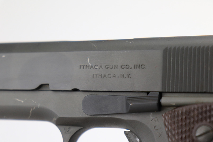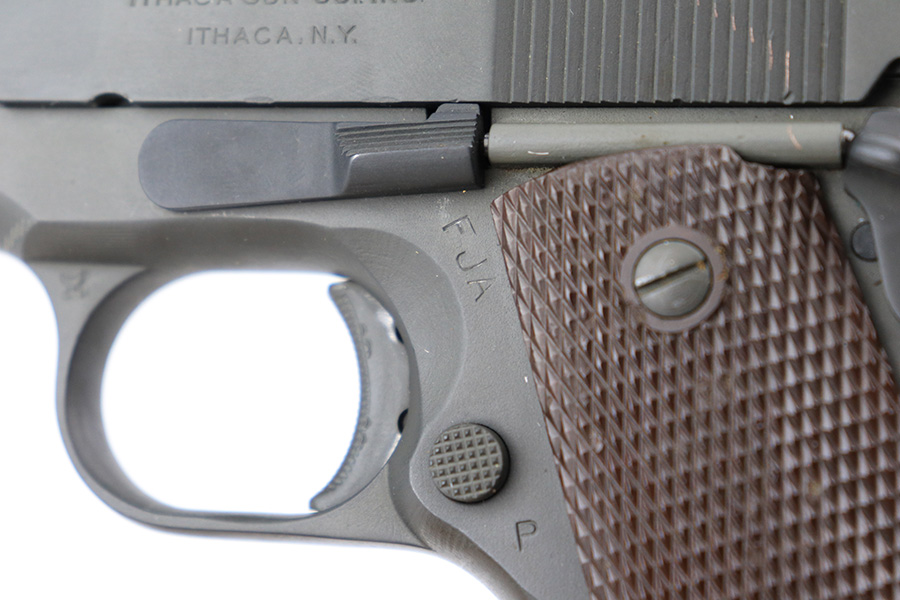 4/26/22 – This is an excellent example of a Colt Model 1911A1 issued to the US military in 1944. The gun is “United States Property” marked, has the appropriate “FJA” military inspection initials, and has the proper cross-canon military cartouche. High Standard barrel. This entire gun has been professionally restored and re-parkerized. There is very little actual finish loss, but unfortunately there are a few noticeable scratches on the slide and frame. Comes with excellent plastic grips and a period-correct “R” marked magazine. Minty bore.