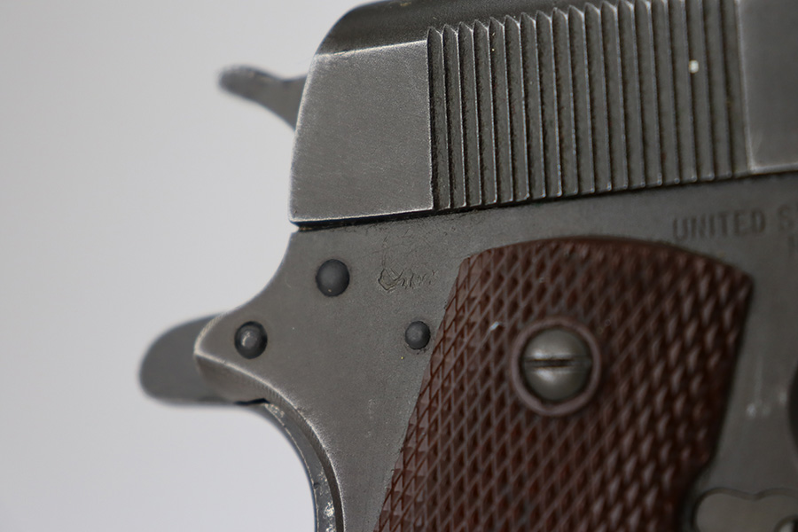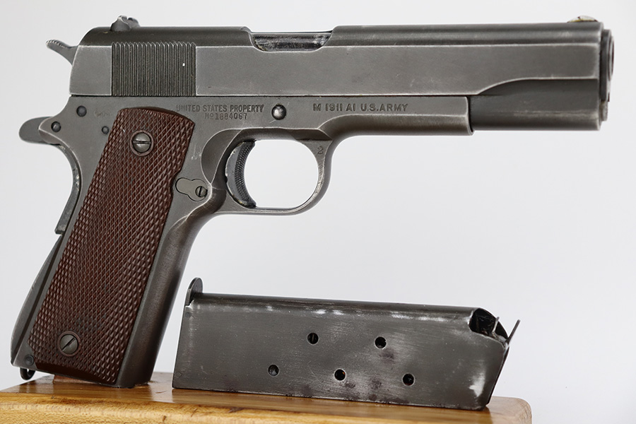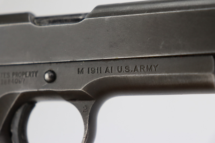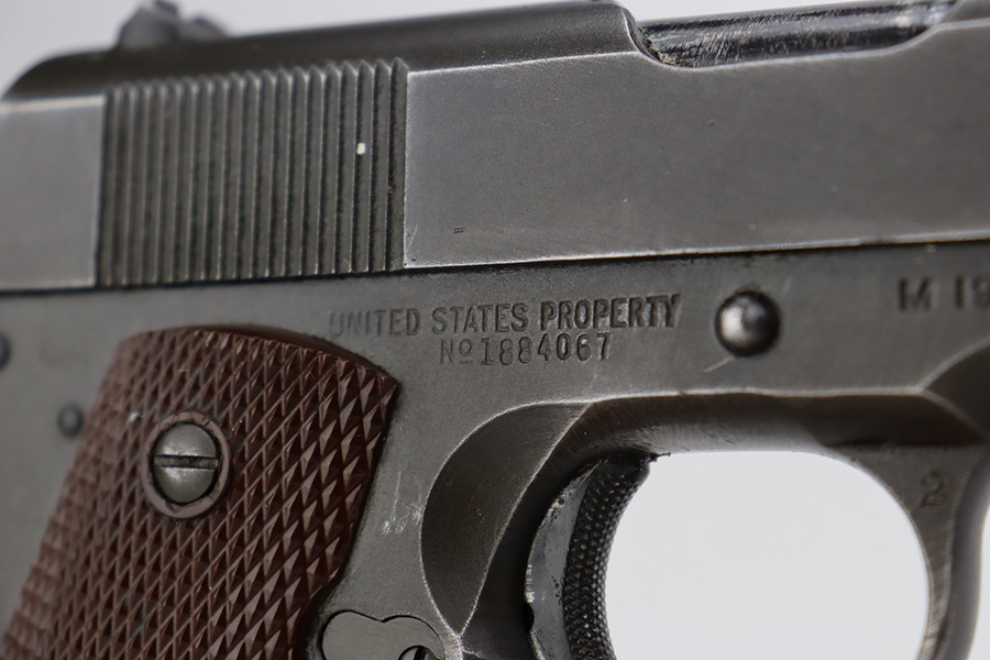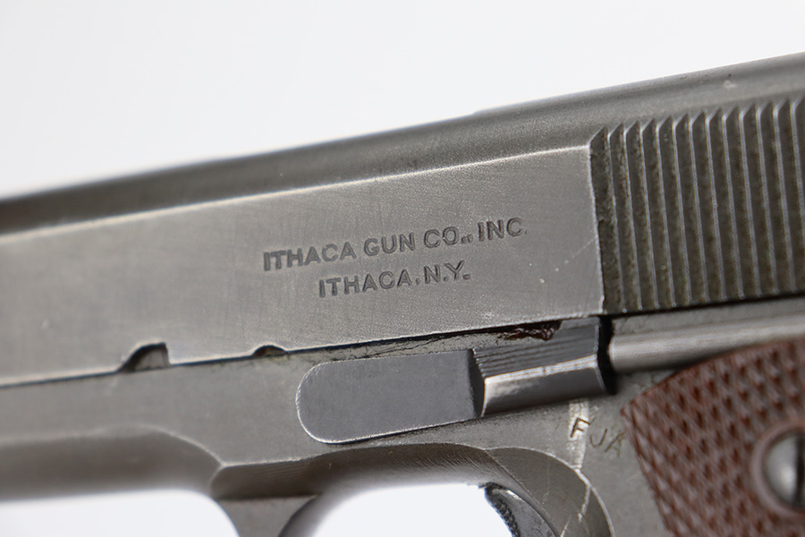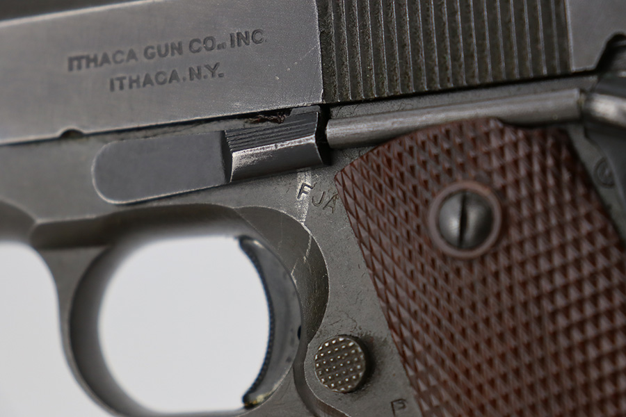 8/18/23 – This is a very nice example of an Ithaca Model 1911A1 issued to the US military in 1944. It is “United States Property” marked, has a cross-canon cartouche on the right side of the frame, and has the proper “FJA” inspector initials. Flannery barrel. It has retained roughly 80-85% of its original parkerized finish. The majority of the finish loss is on the front strap, but there is also minor wear around the muzzle and on the high edges in general. Fitted with period-correct reddish plastic grips and comes with one proper magazine. Minty bore.