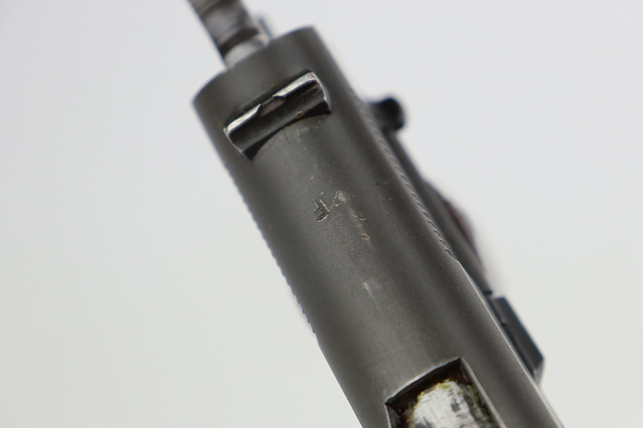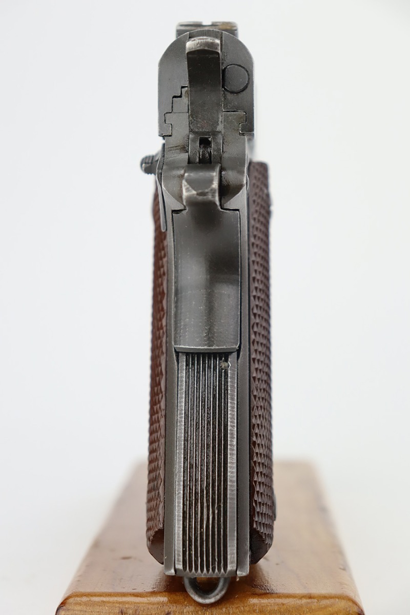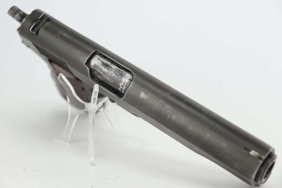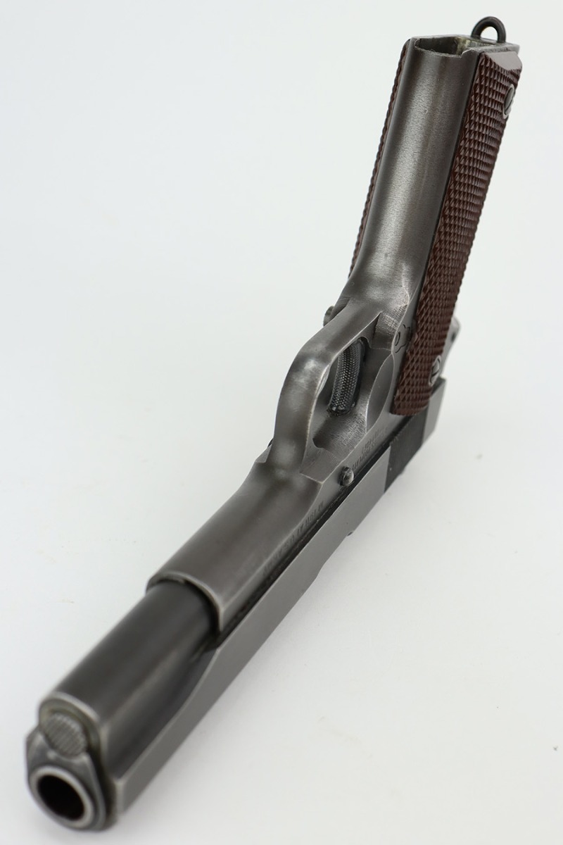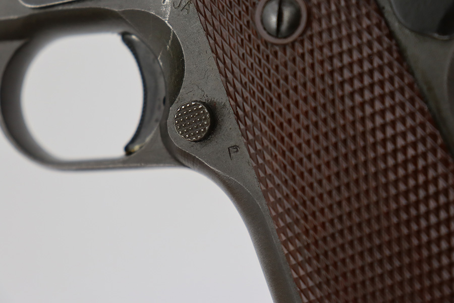 8/18/23 – This is a very nice example of an Ithaca Model 1911A1 issued to the US military in 1944. It is “United States Property” marked, has a cross-canon cartouche on the right side of the frame, and has the proper “FJA” inspector initials. Flannery barrel. It has retained roughly 80-85% of its original parkerized finish. The majority of the finish loss is on the front strap, but there is also minor wear around the muzzle and on the high edges in general. Fitted with period-correct reddish plastic grips and comes with one proper magazine. Minty bore.