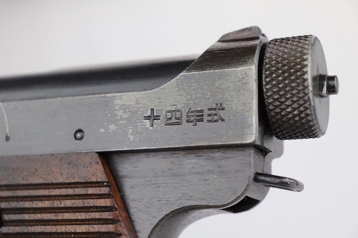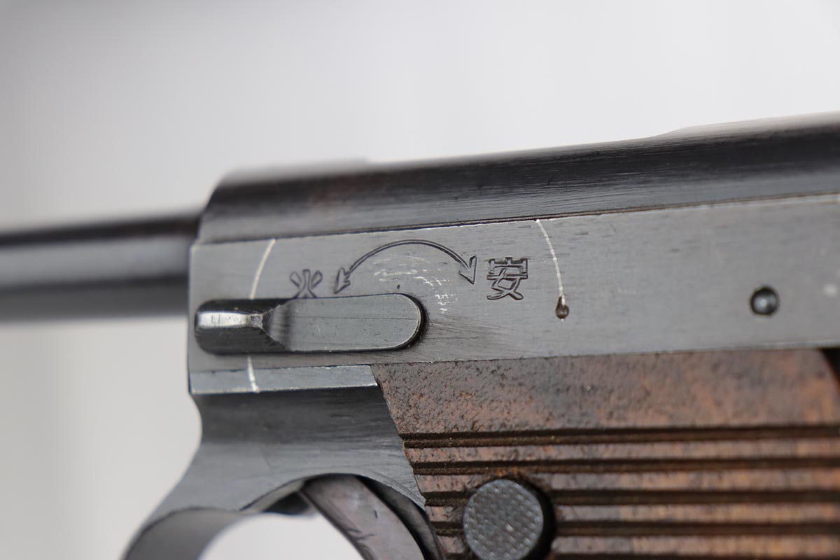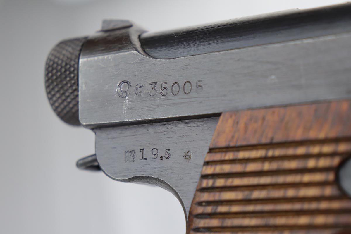 11/6/19 – This is an all matching and original Nambu Type 14, including the grips and magazine. The pistol was made at the Toriimatsu branch of the Nagoya Arsenal in May of 1944. This is a second series or ‘Series B’ pistol. The bluing rates at about 92-93% with the vast majority of finish loss on the left side of the frame, on the rear portion. Excellent grips without defect. Minty bore.