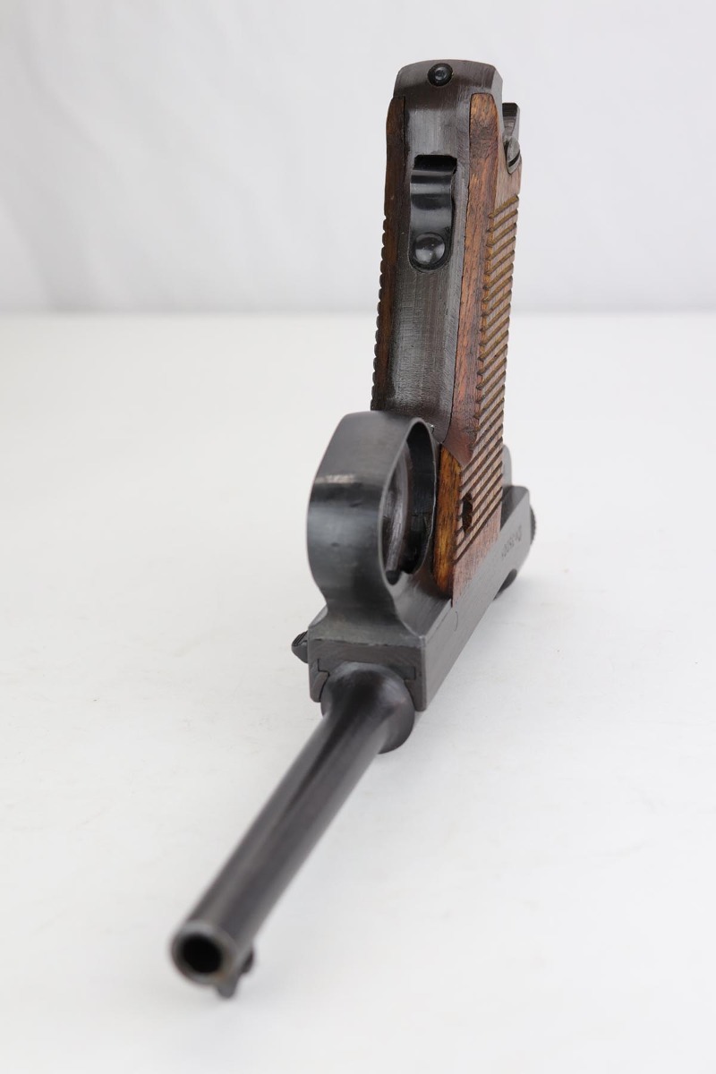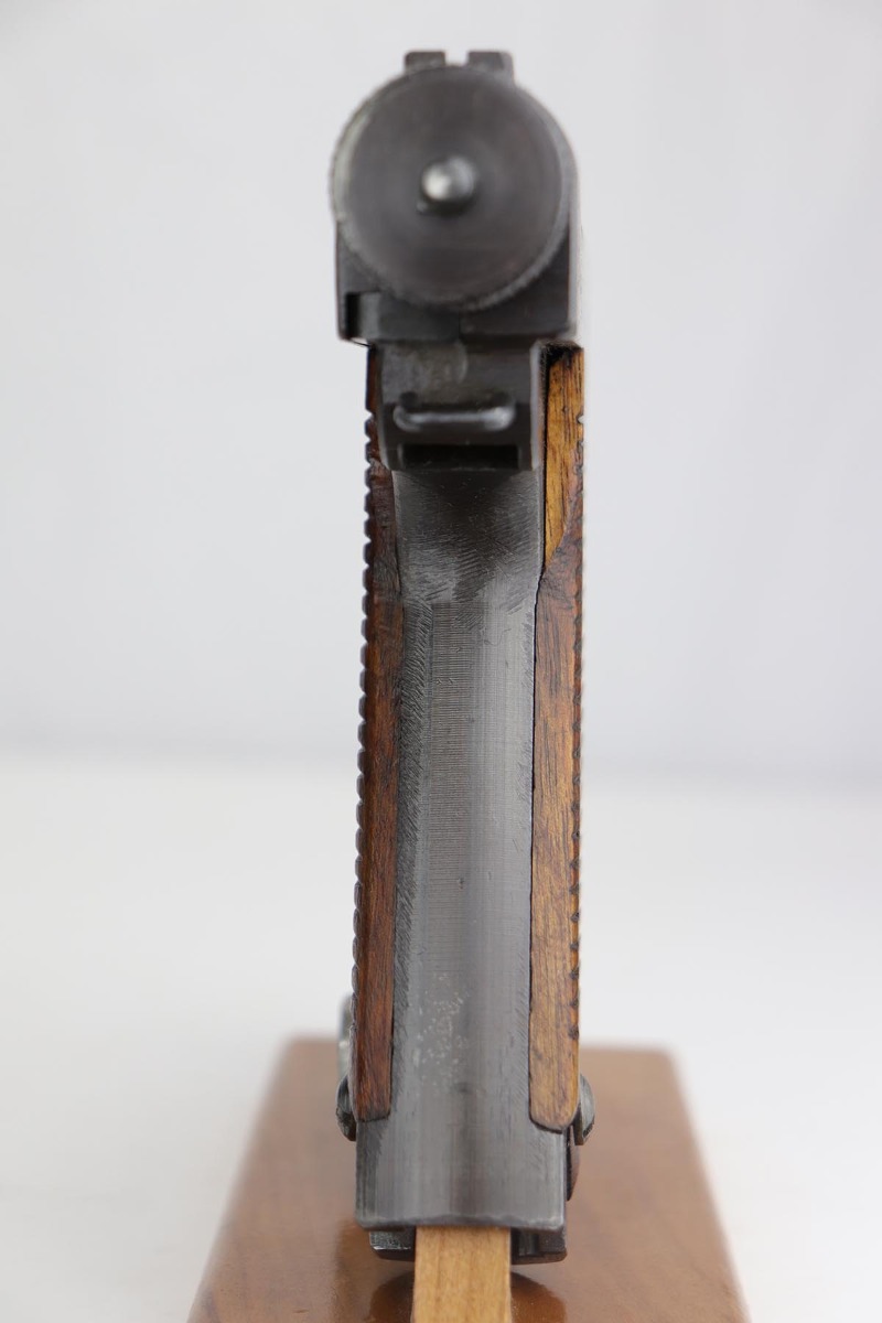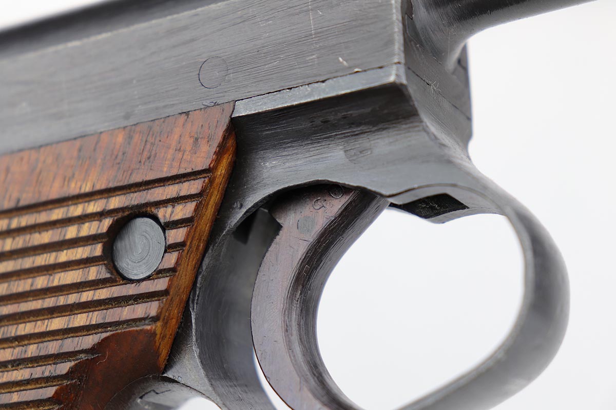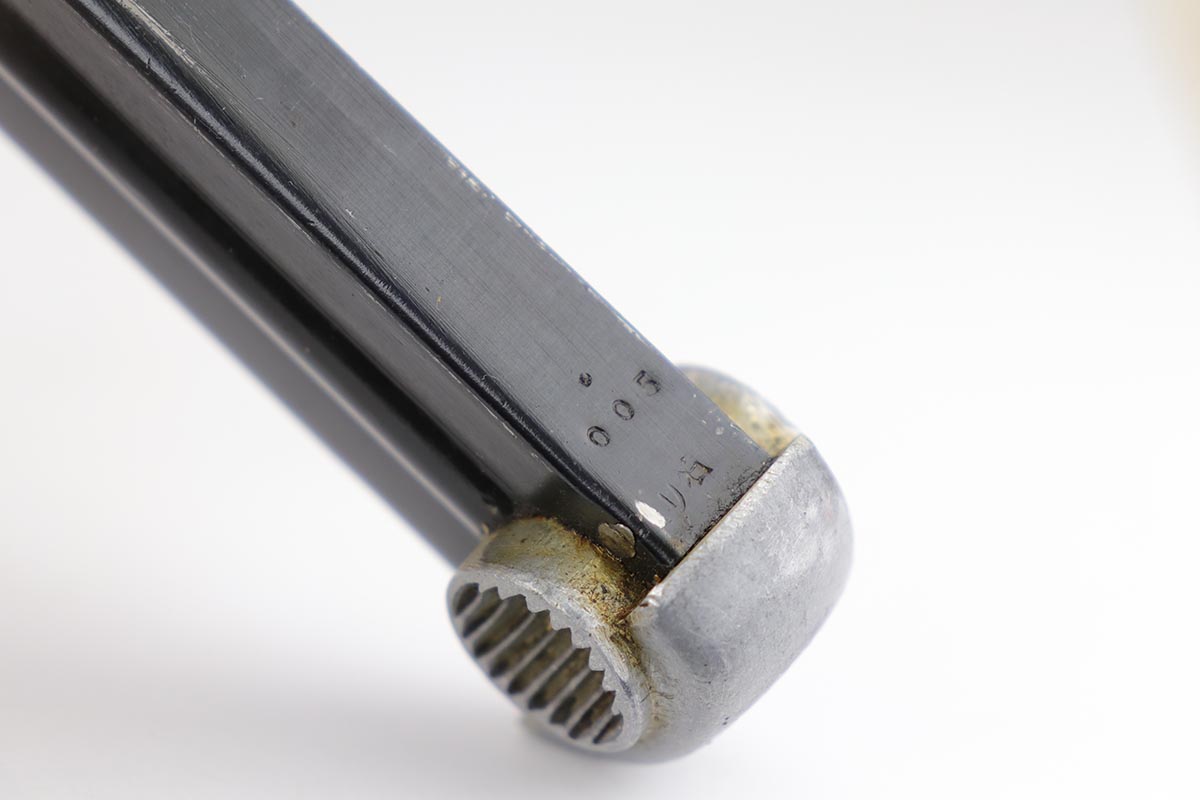 11/6/19 – This is an all matching and original Nambu Type 14, including the grips and magazine. The pistol was made at the Toriimatsu branch of the Nagoya Arsenal in May of 1944. This is a second series or ‘Series B’ pistol. The bluing rates at about 92-93% with the vast majority of finish loss on the left side of the frame, on the rear portion. Excellent grips without defect. Minty bore.