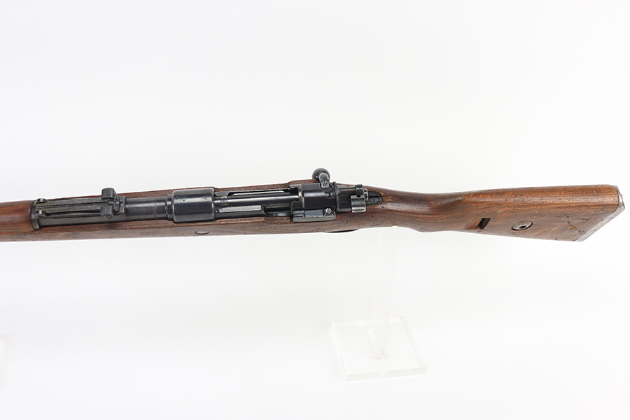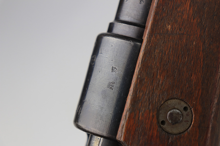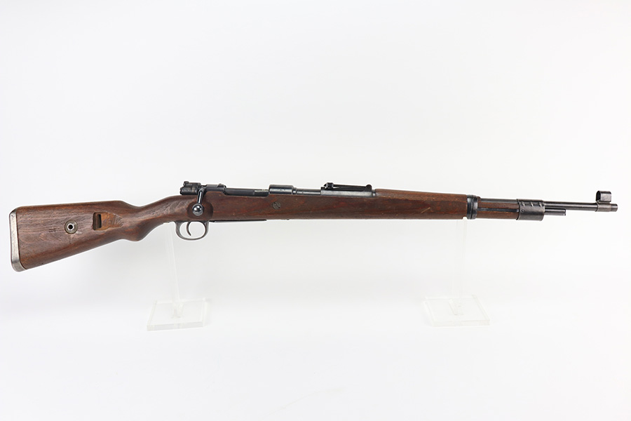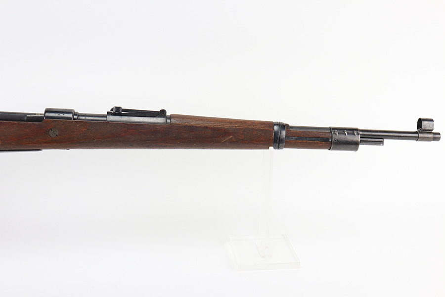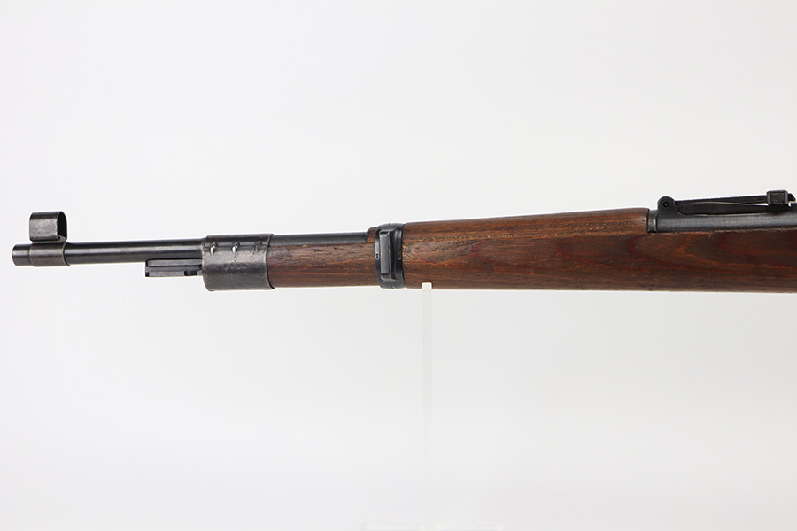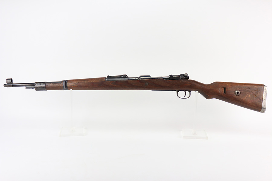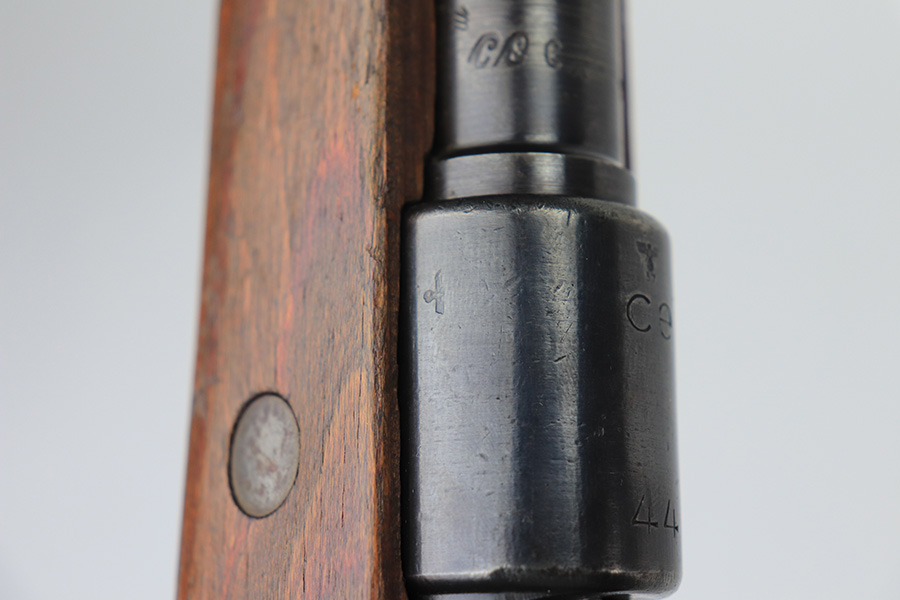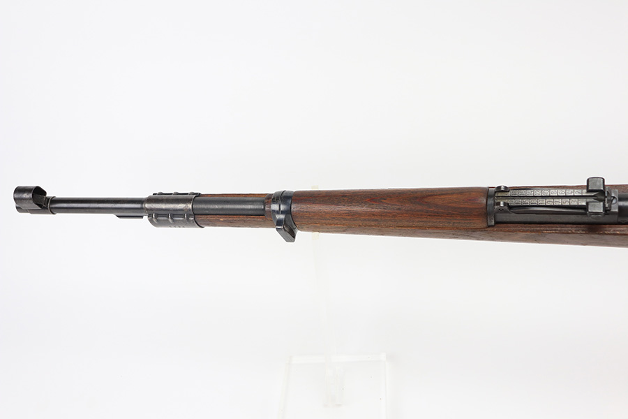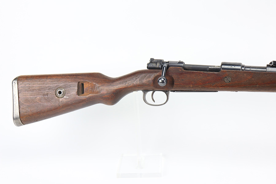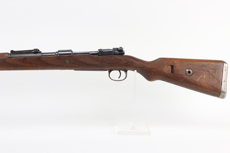 2/2/22 – This is a very nice example of a JP Sauer K98 issued to the Nazi military in 1944. All numbered parts are matching, but the bolt is mismatched. The follower, trigger group, bolt release lever, and stock are not numbered. The stock does have faint but visible Nazi waffen proofs. There is some light scratchy wear around the muzzle and barrel bands. Areas of spotty discoloration on both sides of the barrel near the rear sight and on the floor plate/trigger group. On the butt plate, there is spotty oxidation and what looks like dried old tape adhesive. The stock is very nice with minor dings and scratches here and there. The bore is near-mint.