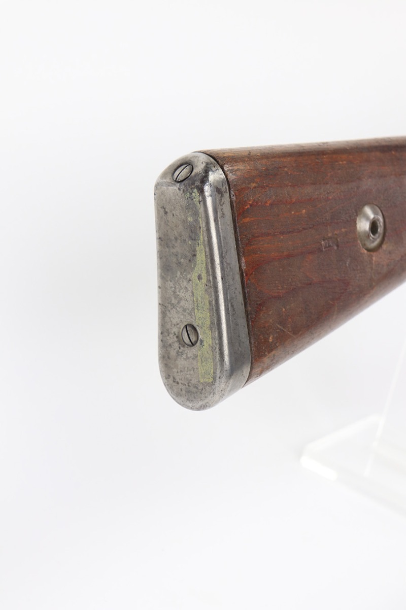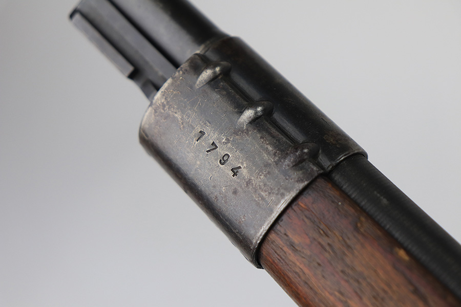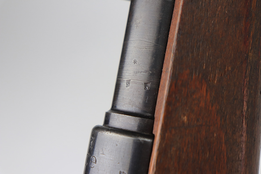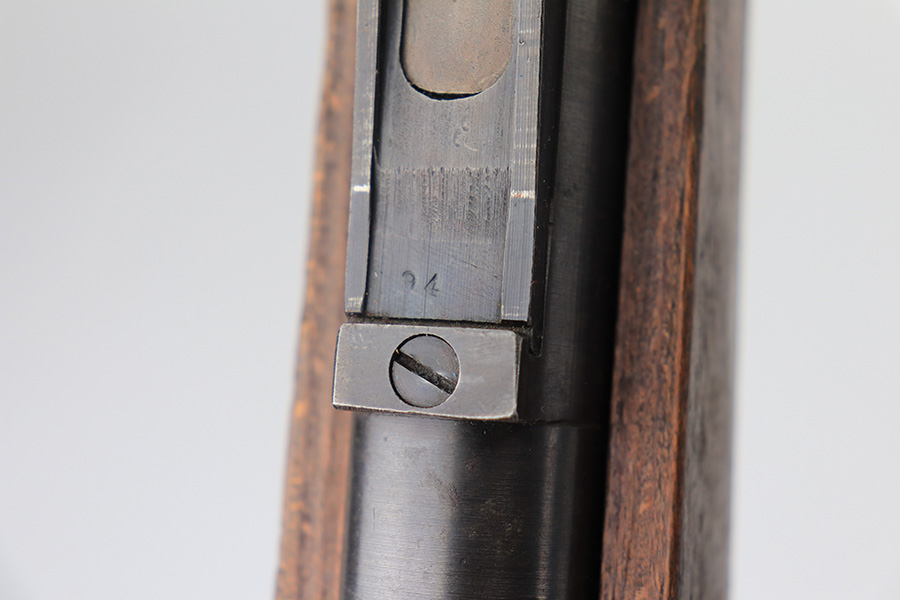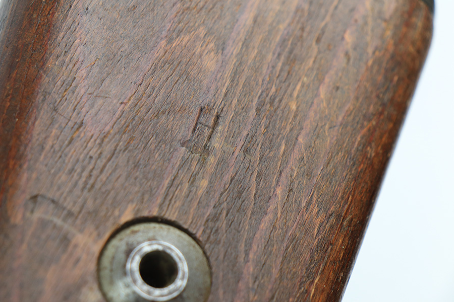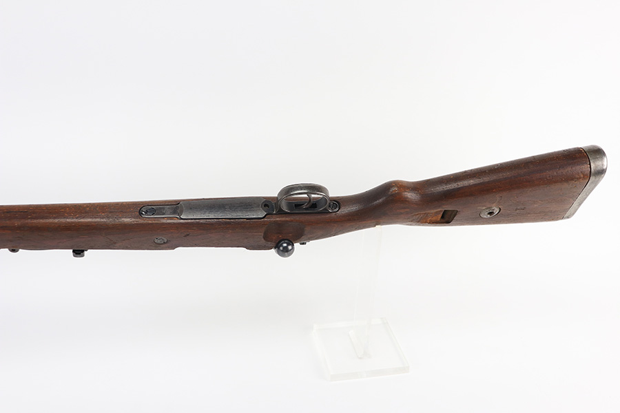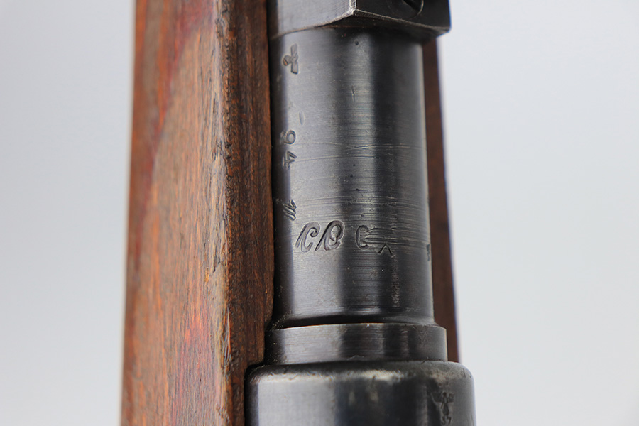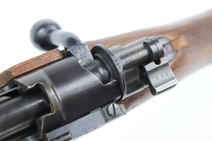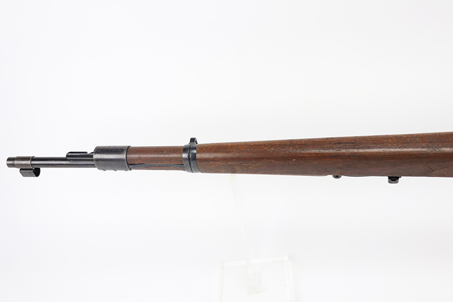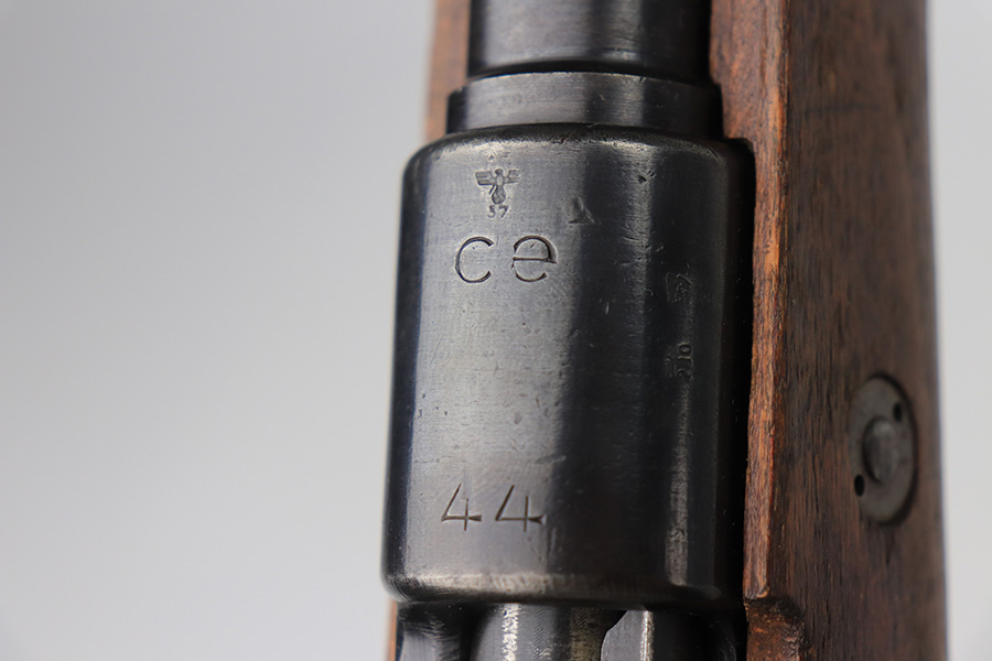2/2/22 – This is a very nice example of a JP Sauer K98 issued to the Nazi military in 1944. All numbered parts are matching, but the bolt is mismatched. The follower, trigger group, bolt release lever, and stock are not numbered. The stock does have faint but visible Nazi waffen proofs. There is some light scratchy wear around the muzzle and barrel bands. Areas of spotty discoloration on both sides of the barrel near the rear sight and on the floor plate/trigger group. On the butt plate, there is spotty oxidation and what looks like dried old tape adhesive. The stock is very nice with minor dings and scratches here and there. The bore is near-mint.