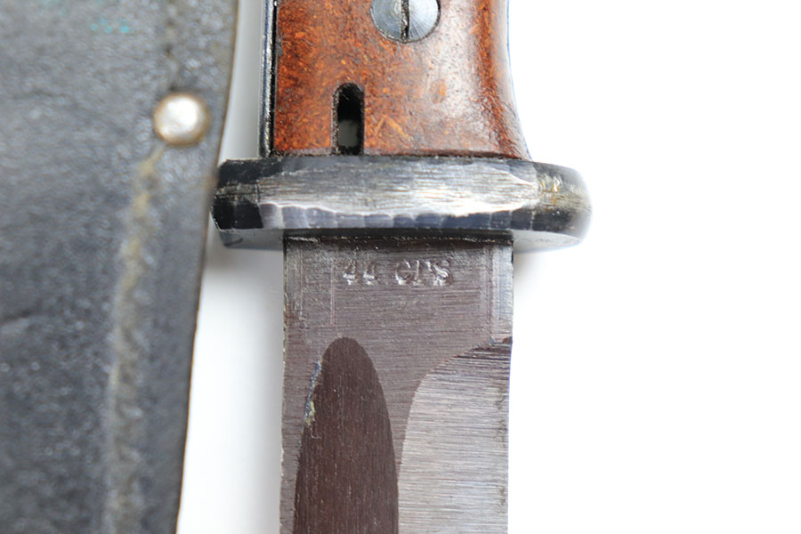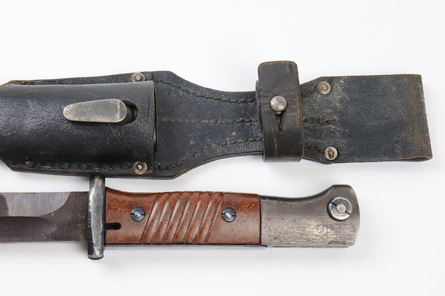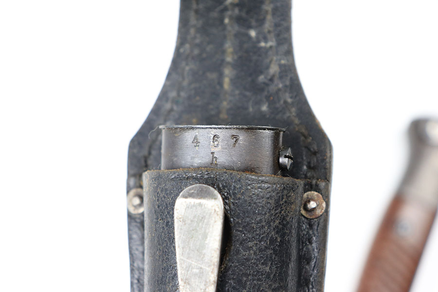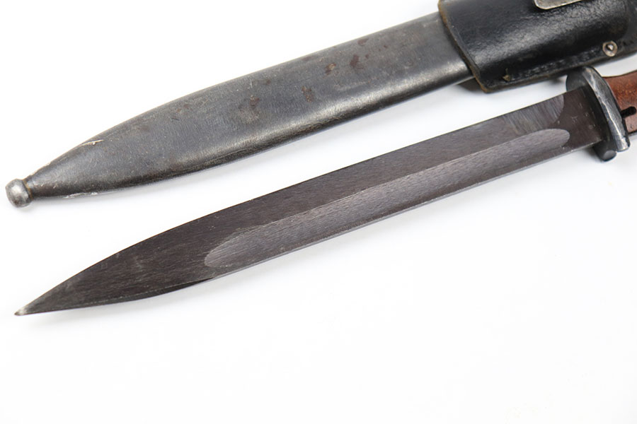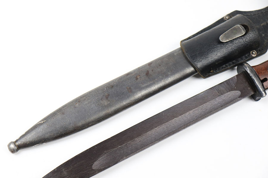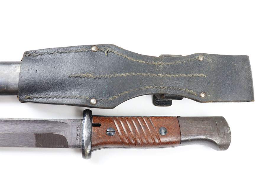 9/3/21 – This is an original 1944 K98 bayonet with a matching numbered scabbard and a leather frog. The bayonet blade is serial numbered on one side and maker stamped / dated on the reverse. Excellent, semi-plumb colored finish throughout the blade and no signs of sharpening. The scabbard has some finish loss and dark brown patina throughout but no major dents or issues. The black leather frog is unmarked but also in great shape.