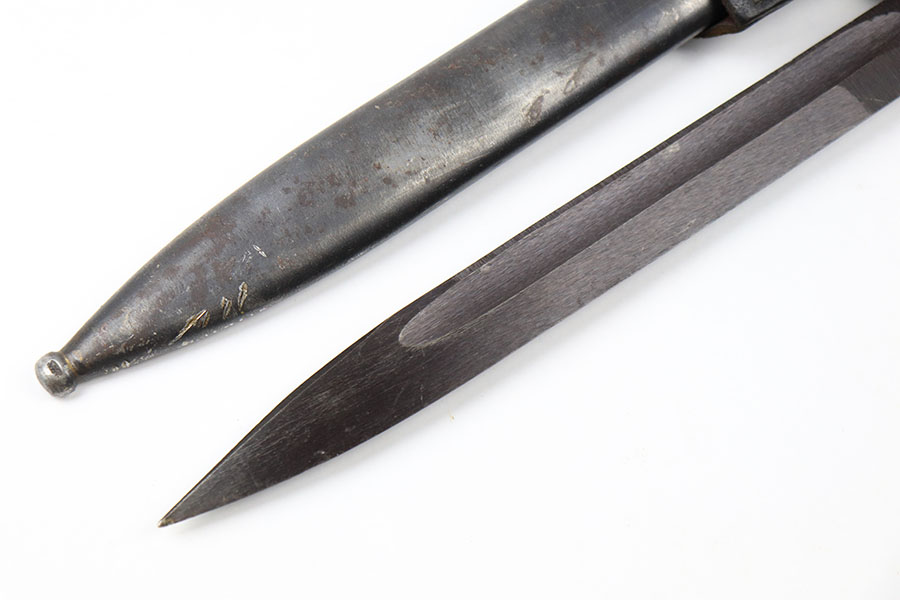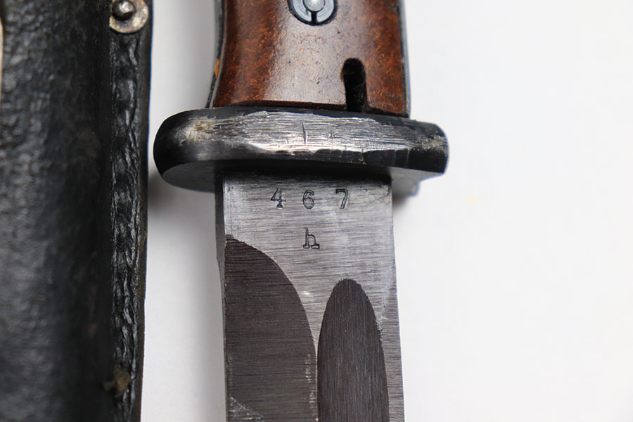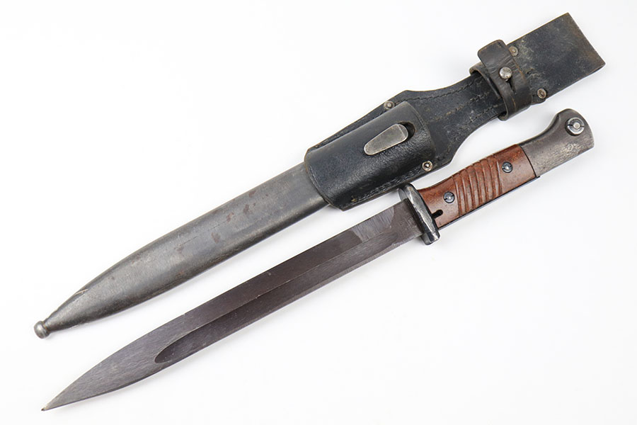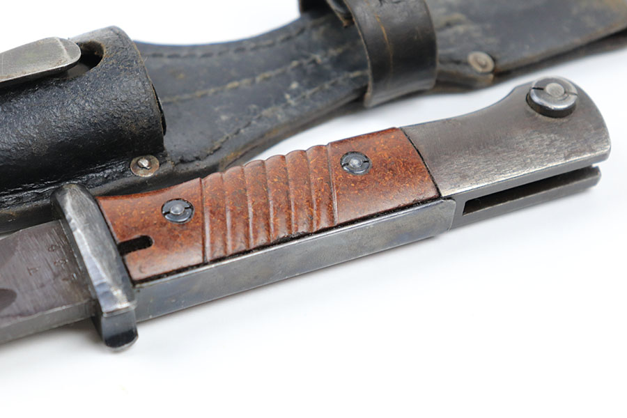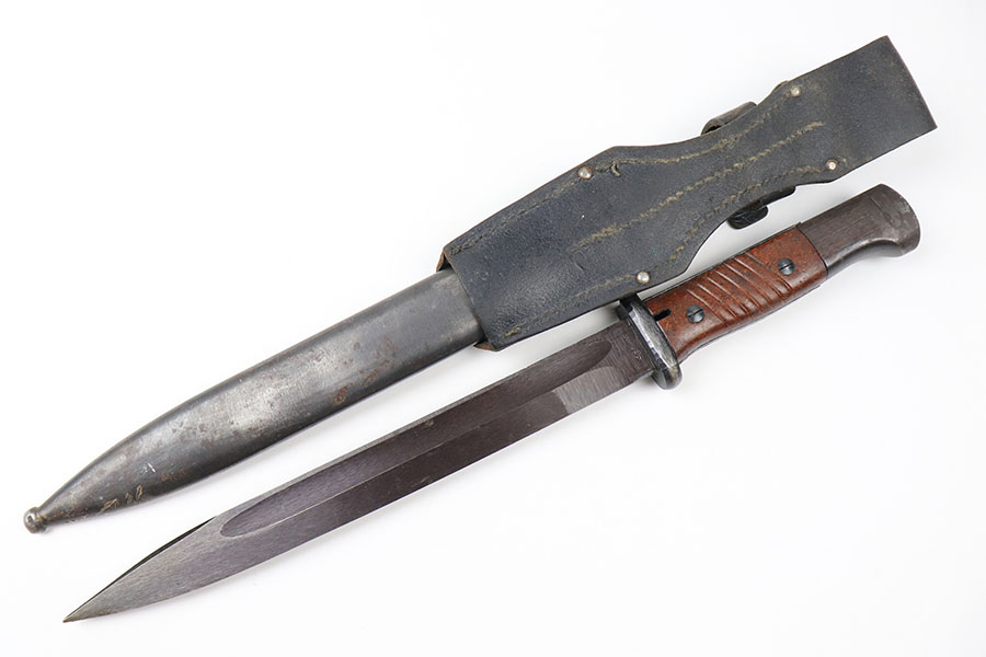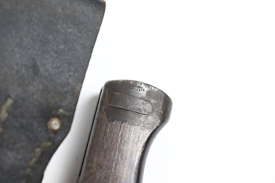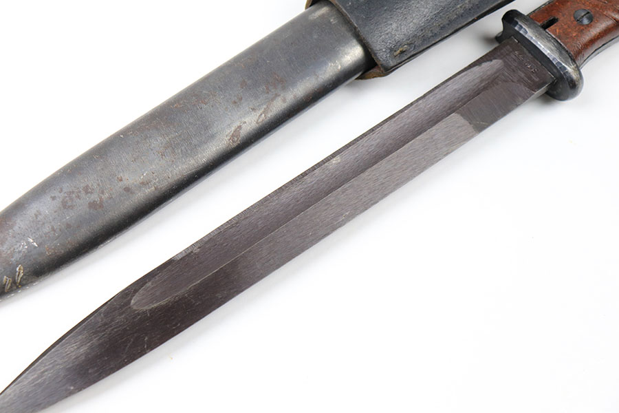 9/3/21 – This is an original 1944 K98 bayonet with a matching numbered scabbard and a leather frog. The bayonet blade is serial numbered on one side and maker stamped / dated on the reverse. Excellent, semi-plumb colored finish throughout the blade and no signs of sharpening. The scabbard has some finish loss and dark brown patina throughout but no major dents or issues. The black leather frog is unmarked but also in great shape.