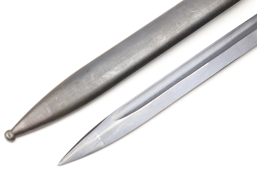 3/22/22 – This is an original, late WW2 production K98 bayonet with a matching serial numbered scabbard. The bayonet is in excellent condition with a beautifully blued blade. There are a few light surface scratches and normal scabbard wear but no significant issues on the blade. No signs of sharpening. The scabbard is in similar condition and has no dents. Very nice wood grips and the metal is excellent throughout the handle.