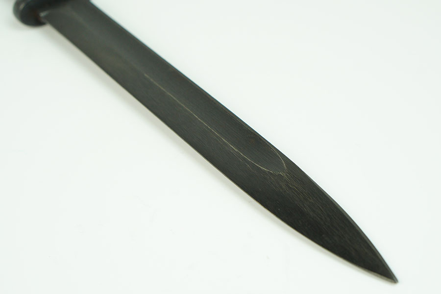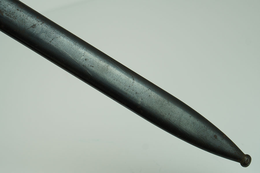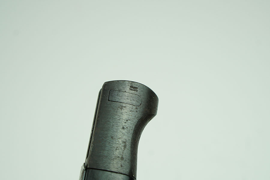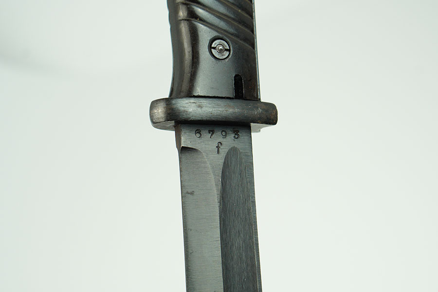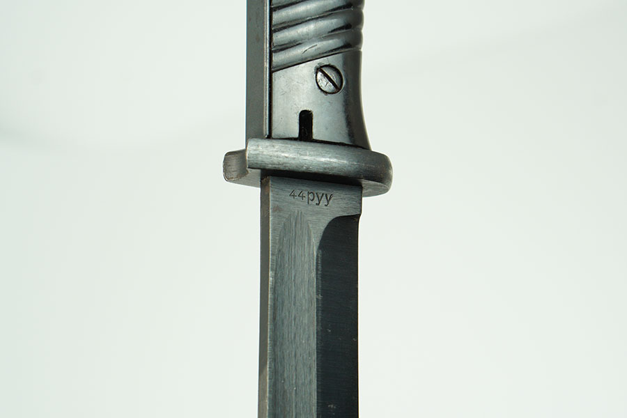1/18/24 – This is an original 1944 dated K98 bayonet with an original matching numbered scabbard. The bayonet is in great overall condition, with an minty condition blade. The blade retains most of the original finish with some light scabbard rub wear and no signs of sharpening along the edge. The base of the blade and scabbard are marked “44pyy” and “6793f”. Light patina on the pommel and hand guard, and a nice original grip. The scabbard has light scratches and patina throughout, but no dents, most of its bluing remains, and fits the blade nicely. Both the tip of the scabbard and pommel at inspector marked “WaA519.” Overall this is an excellent example.