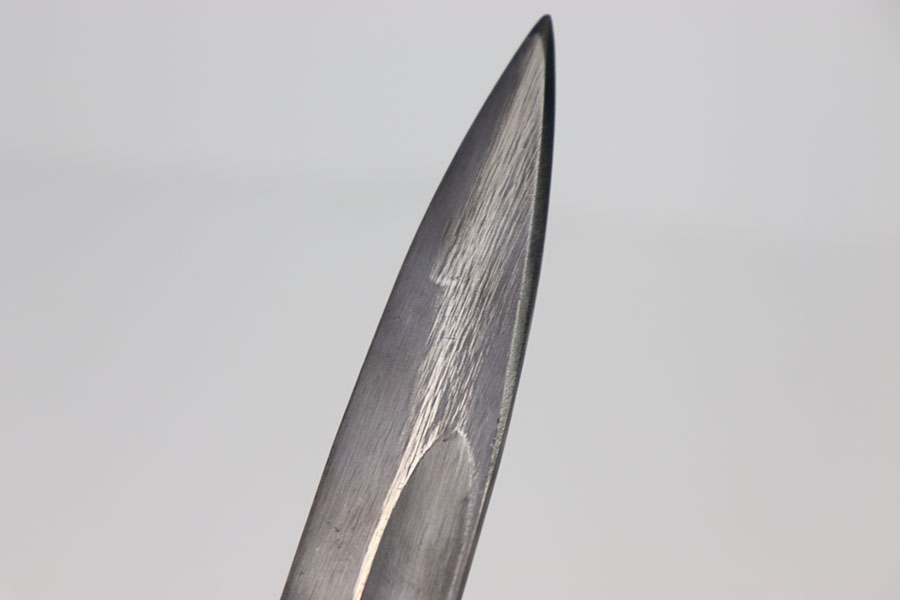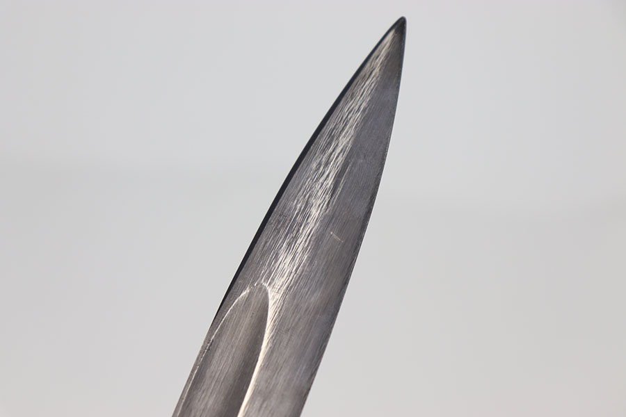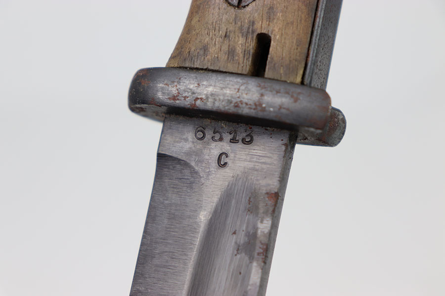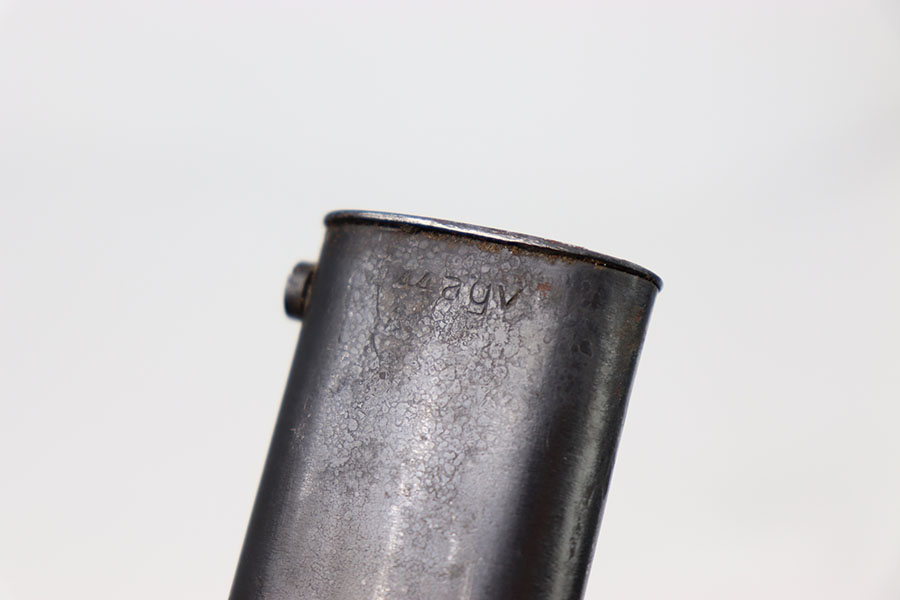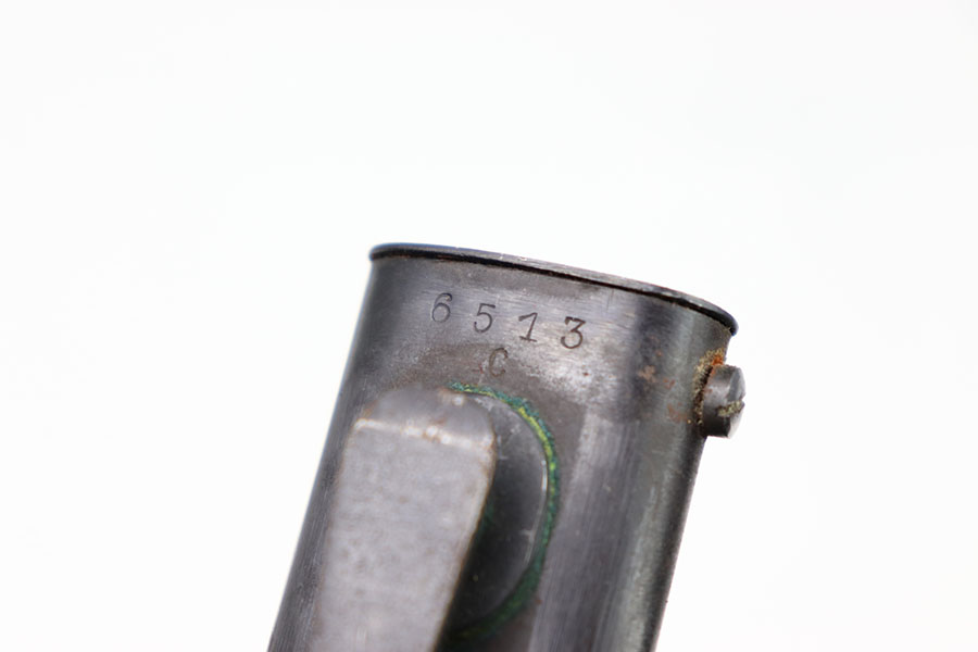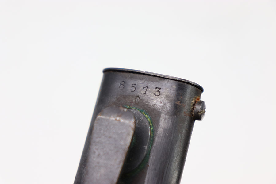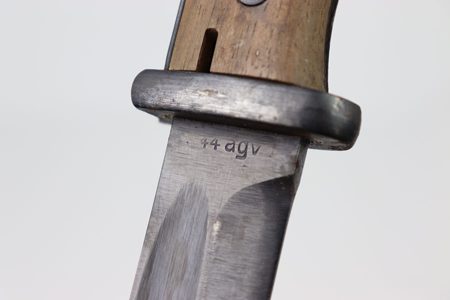 3/4/24 – This is an original 1944 dated K98 bayonet with an original matching numbered scabbard. The bayonet is in great overall condition, with an excellent condition blade. The blade retains most of the original finish with some light scabbard rub wear that favors the front half of the blade. This blade shows no signs of sharpening along the edge. The base of the blade and scabbard are marked “44agv” and “6513c”. Light patina on the pommel and hand guard, and a nice original grip. The scabbard has light scratches and patina throughout. There are no significant dents that are noticeable, most of its bluing remains, and fits the blade nicely. Both the tip of the scabbard and pommel are inspector marked “WaA519.” Overall this is an excellent example.
