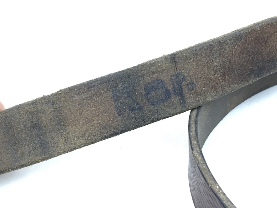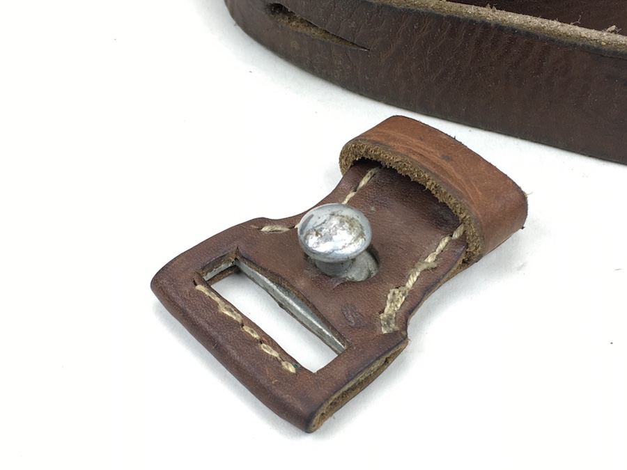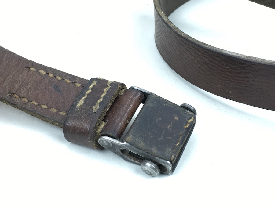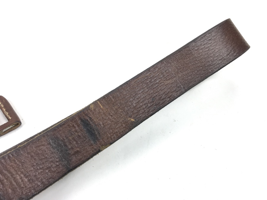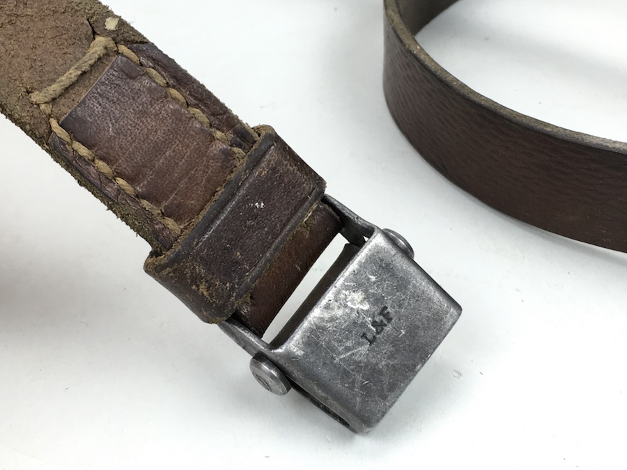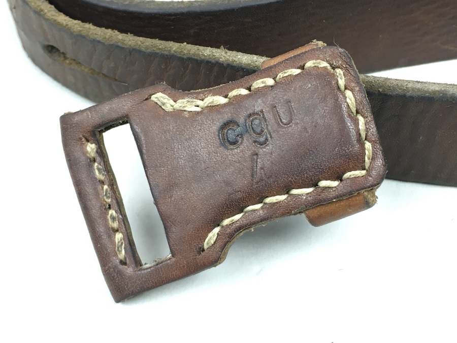 7/25/19 – This is an original leather strap for a K98 rifle manufactured late in WWII. Maker stamped “cgu” and “4” on the rear of the keeper stud. Ink stamped “kar” on the rear of the sling. This is short for “Karabinerriemen”, and presumably put on to differentiate it from the “MP38 u. 40” sling which was slightly different. The leather is excellent and completely in tact with no notable flaws. The interesting feature of this sling is the surface is not the typical herringbone pattern, but sort of a elongated pebble grain. The buckle is maker stamped “L&F”. The stitching is all original as well without issues. Guaranteed original.