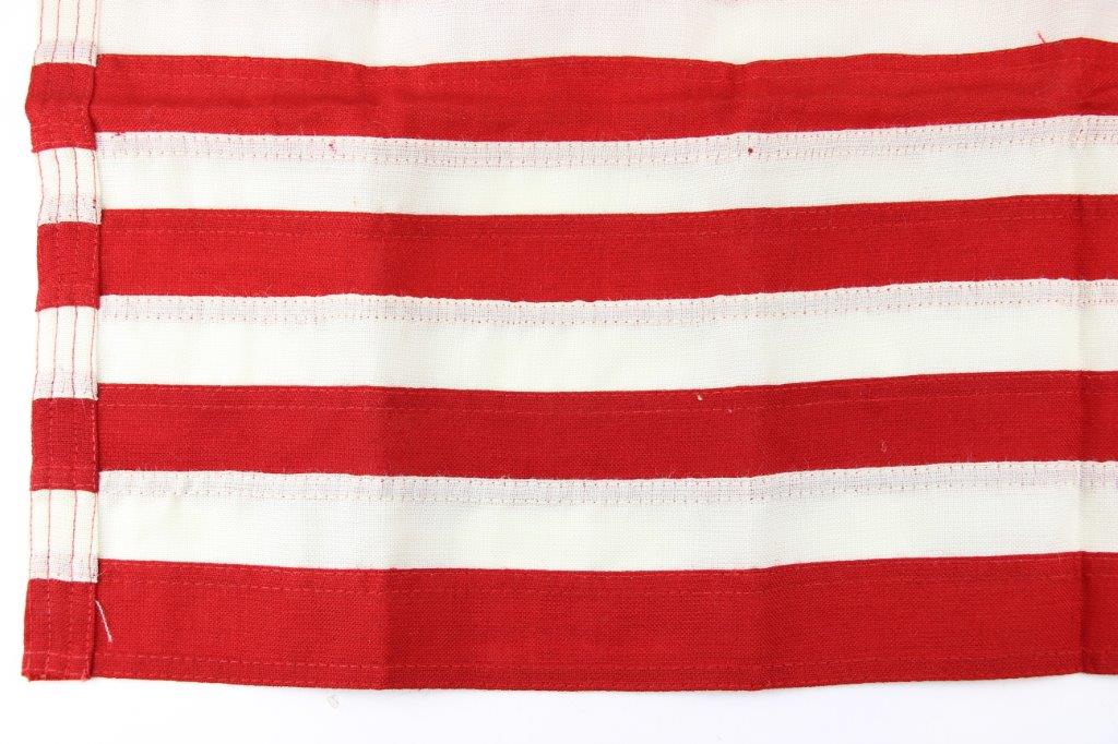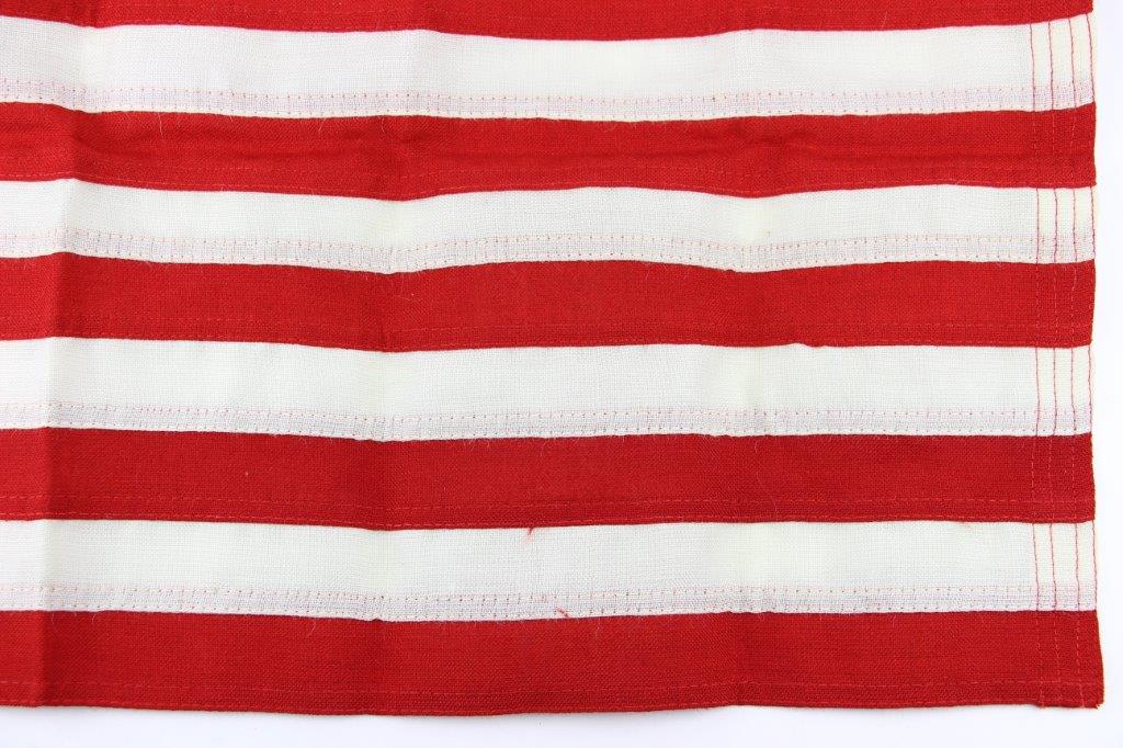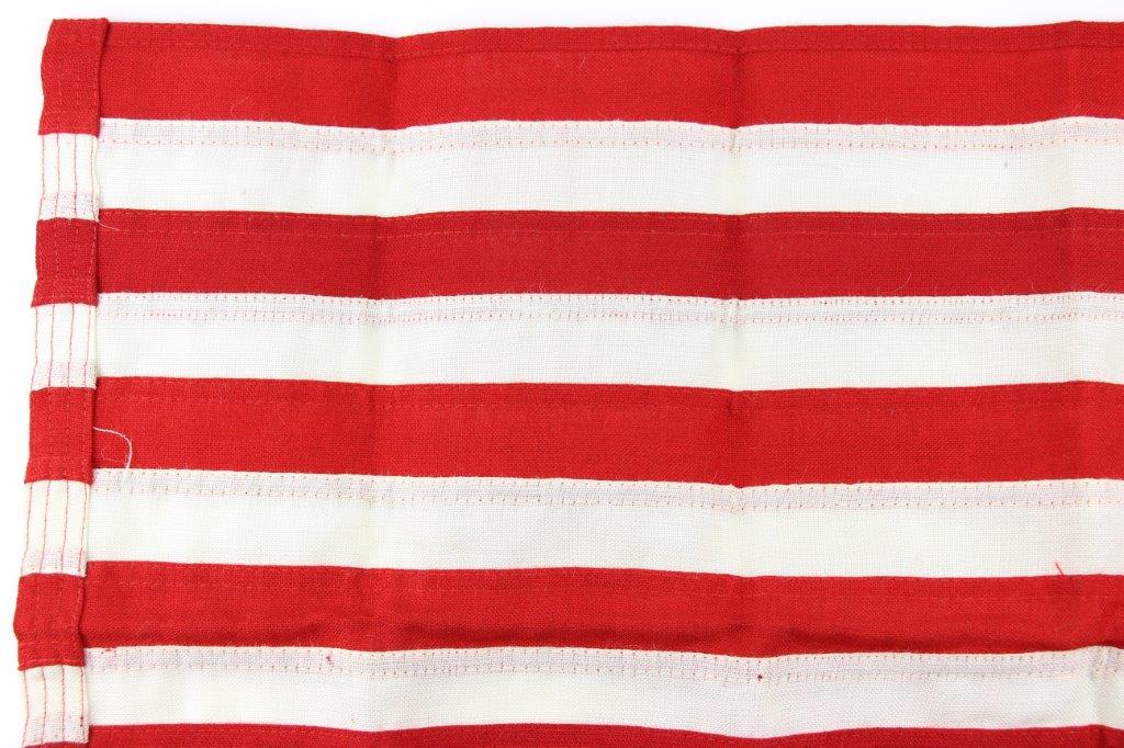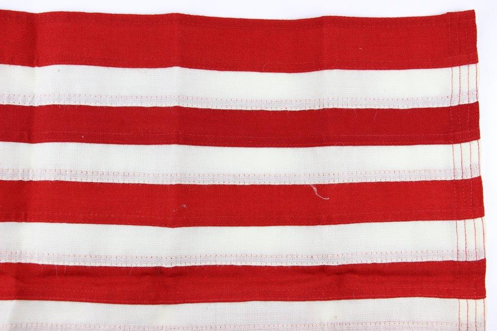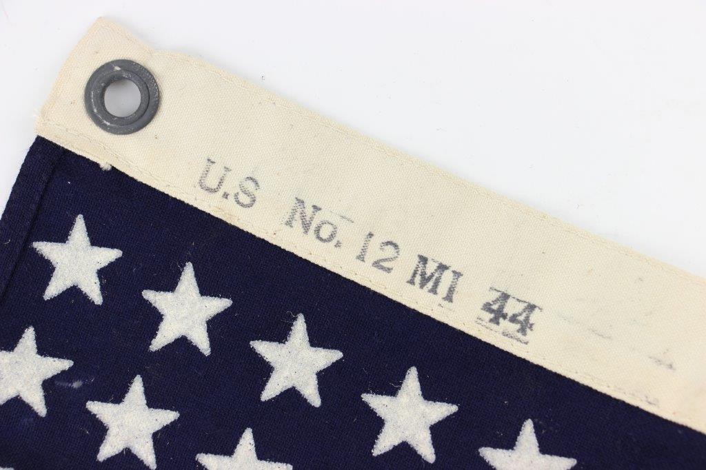6/13/24 – This is a 31.5 x 16.5 inch 48 star US Mare Island Flag. The flag is linen with excellent stitching and clean stars, colors, and markings. The hoist is ink stamped, “U.S. No. 12 MI 44” which indicates this was made on Mare Island in 1944 for use during WW2. The 2 hanging rings show mild age but are in great overall condition. Makes and excellent historical display.