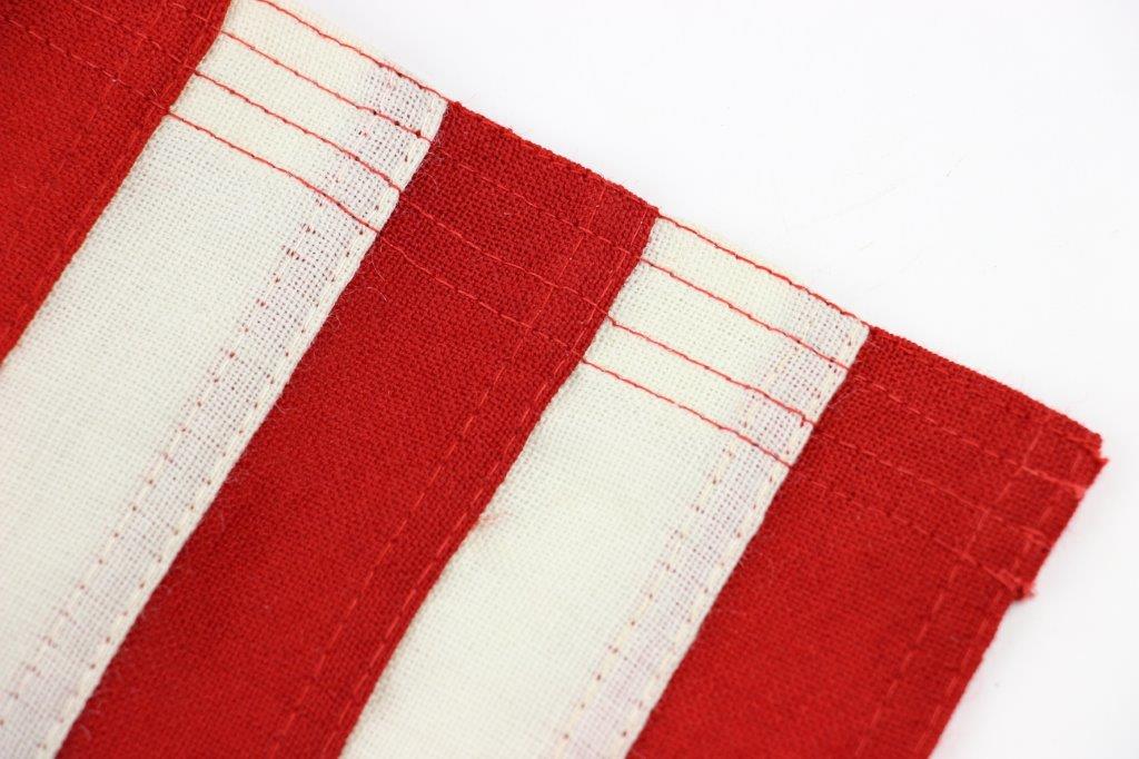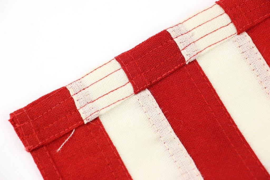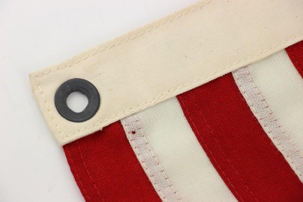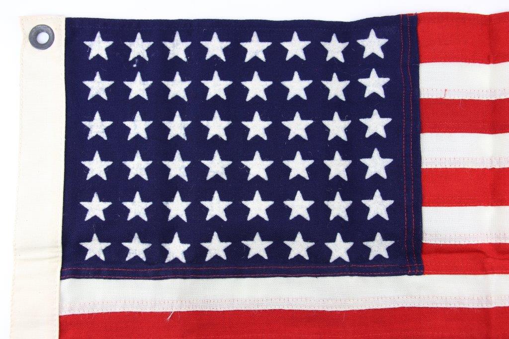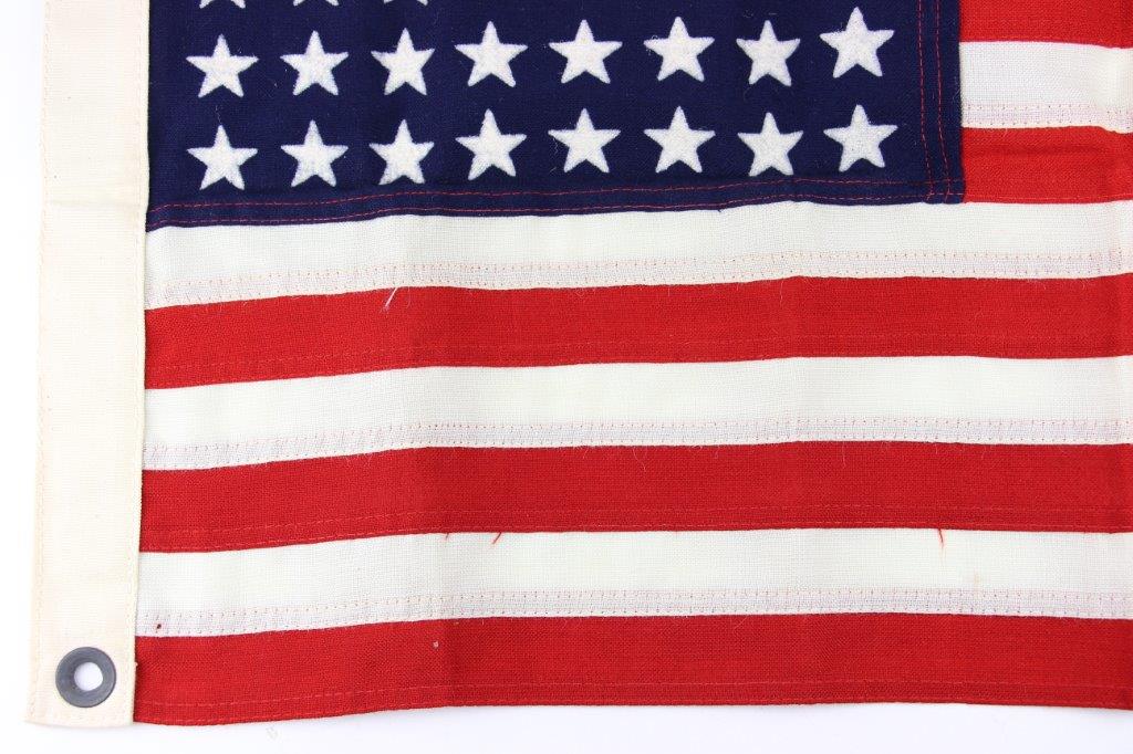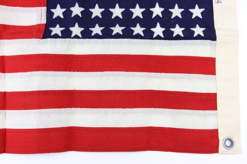 6/13/24 – This is a 31.5 x 16.5 inch 48 star US Mare Island Flag. The flag is linen with excellent stitching and clean stars, colors, and markings. The hoist is ink stamped, “U.S. No. 12 MI 44” which indicates this was made on Mare Island in 1944 for use during WW2. The 2 hanging rings show mild age but are in great overall condition. Makes and excellent historical display.