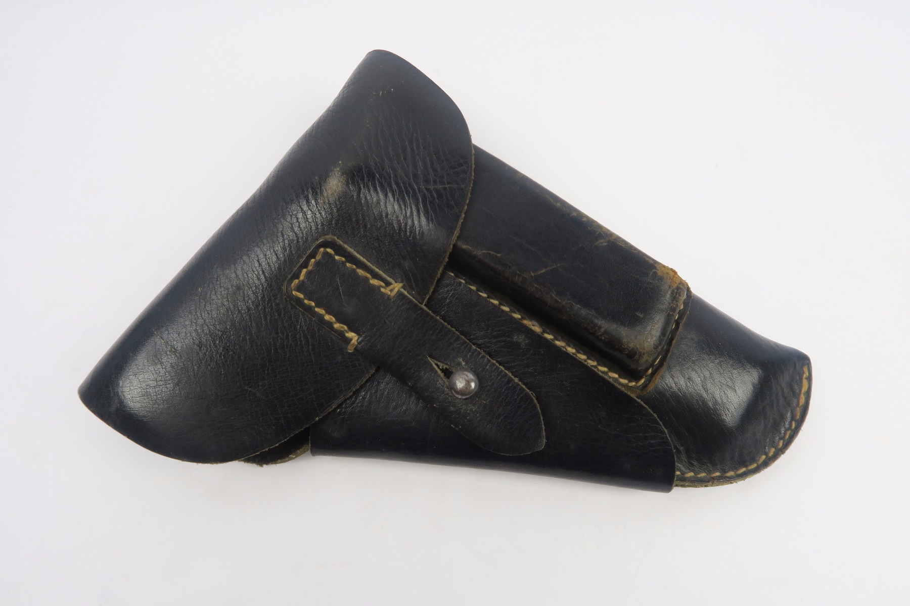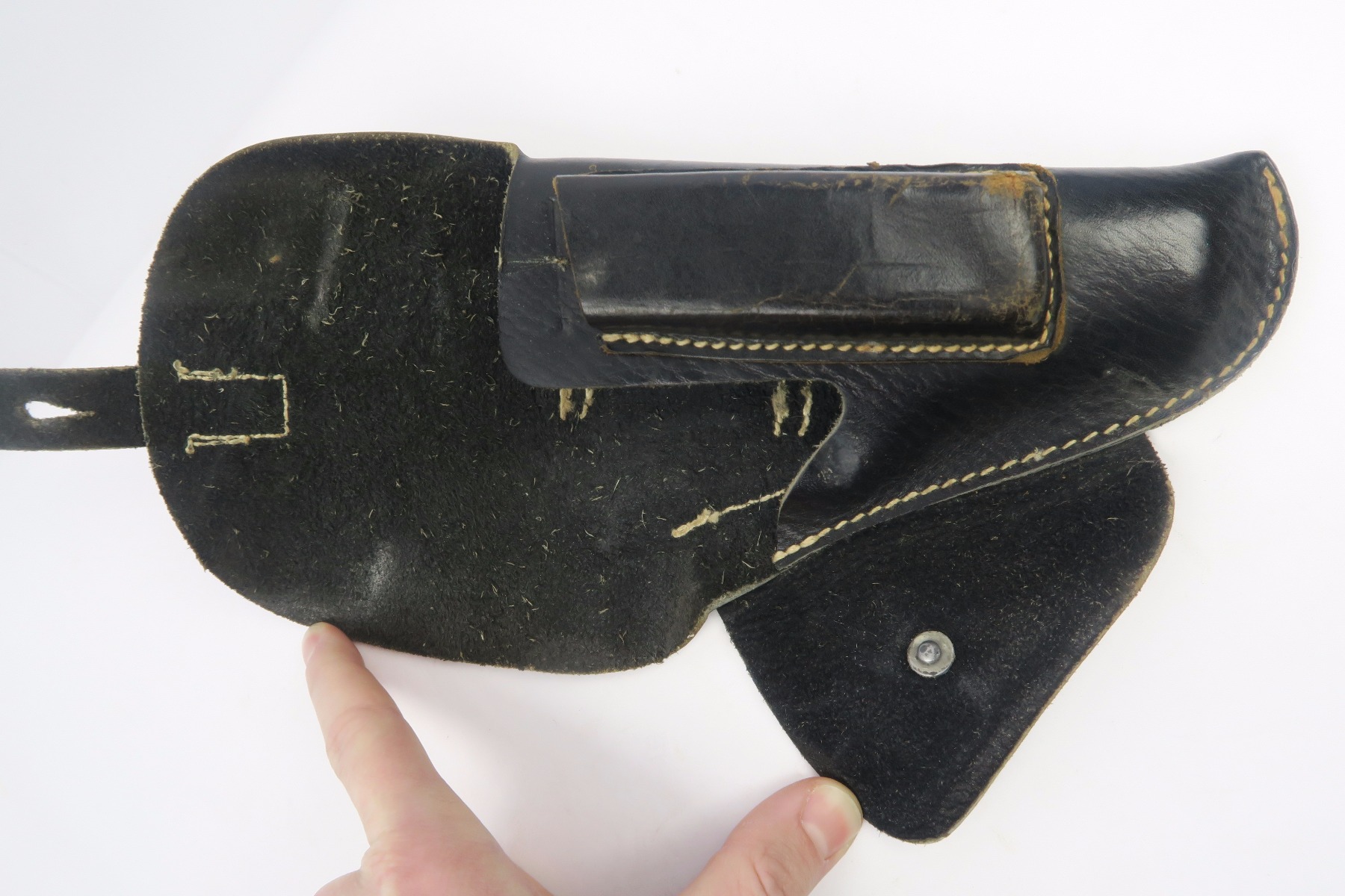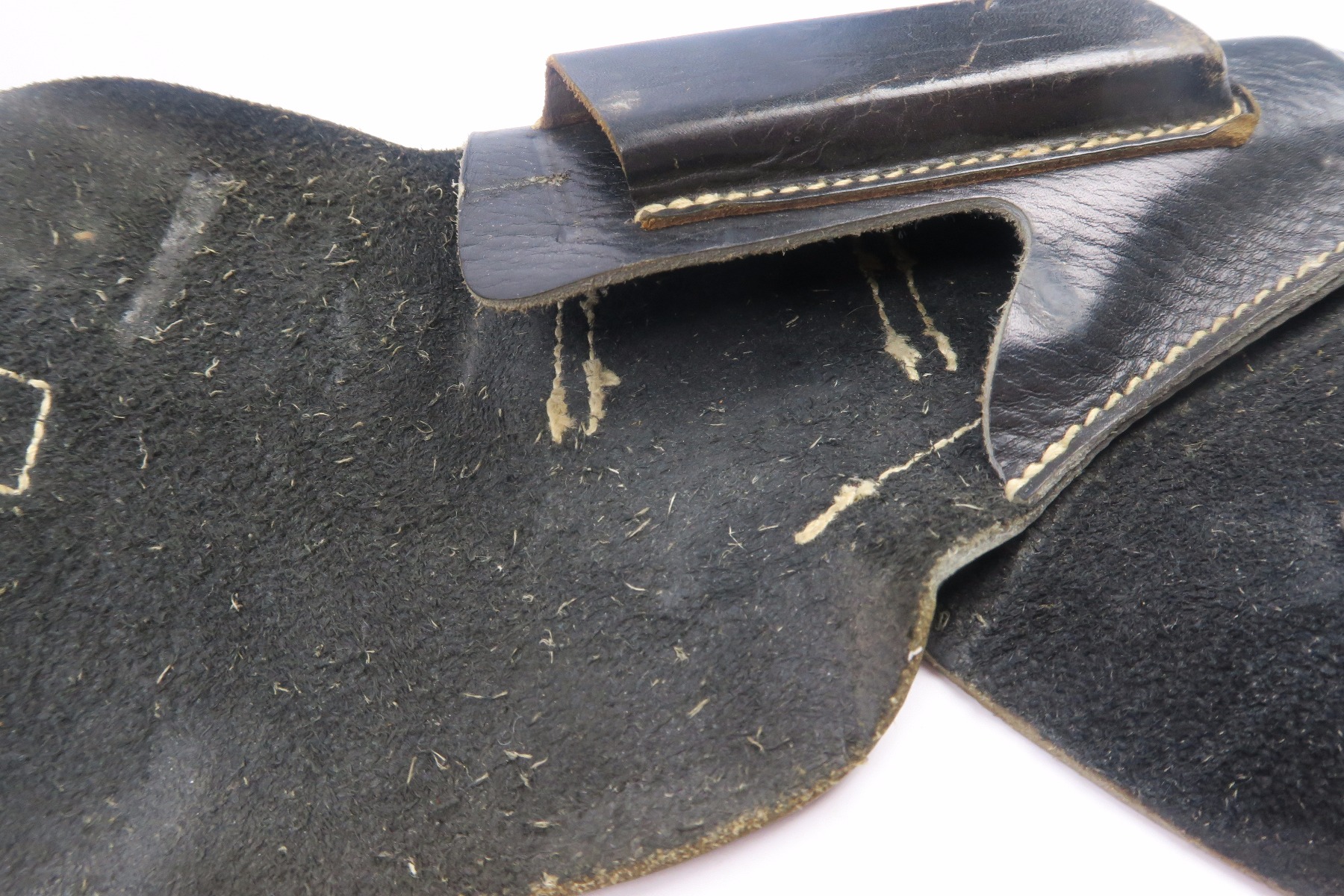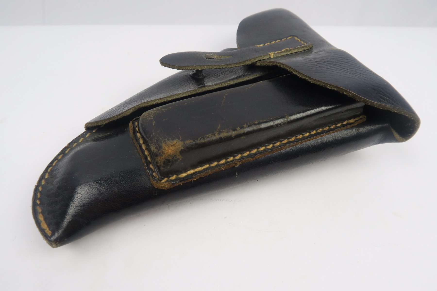11/30/17 – This is an original Mauser pistol holster from WW2. The holster would fit a model HSC, 1934, or similar sized pistol. The back leather is stamped “fkx 4”. There are no other markings. The holster leather is completely in tact and original. The stitching is all tight and original as well. The magazine pouch has some scuffing near the edges, but this is normal wear. Guaranteed original.