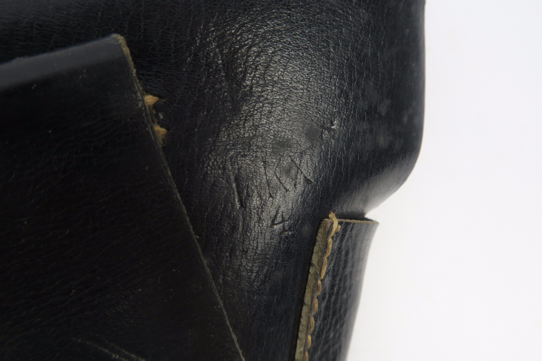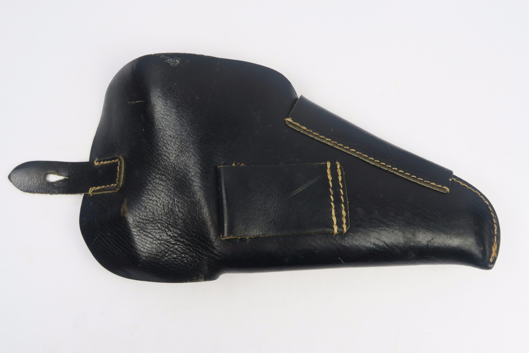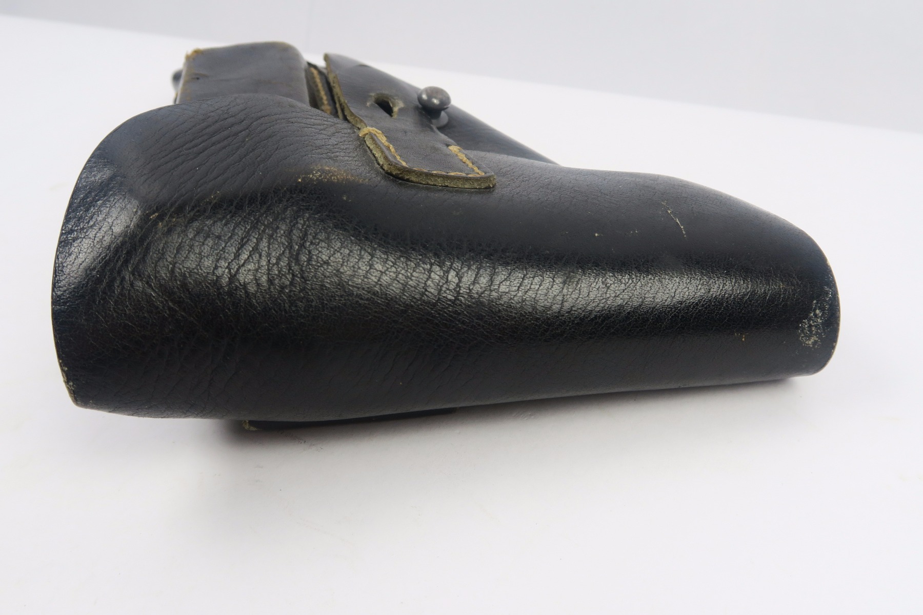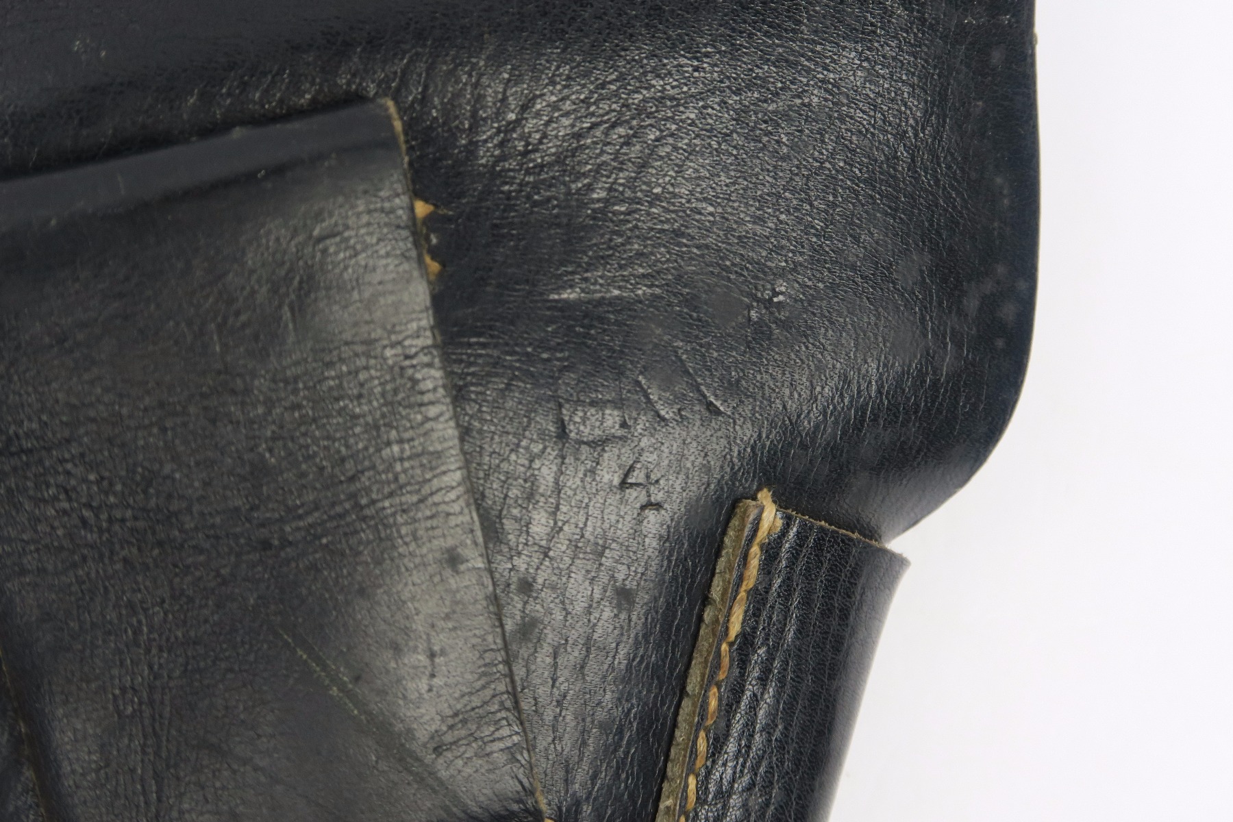 11/30/17 – This is an original Mauser pistol holster from WW2. The holster would fit a model HSC, 1934, or similar sized pistol. The back leather is stamped “fkx 4”. There are no other markings. The holster leather is completely in tact and original. The stitching is all tight and original as well. The magazine pouch has some scuffing near the edges, but this is normal wear. Guaranteed original.