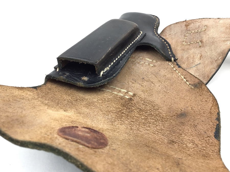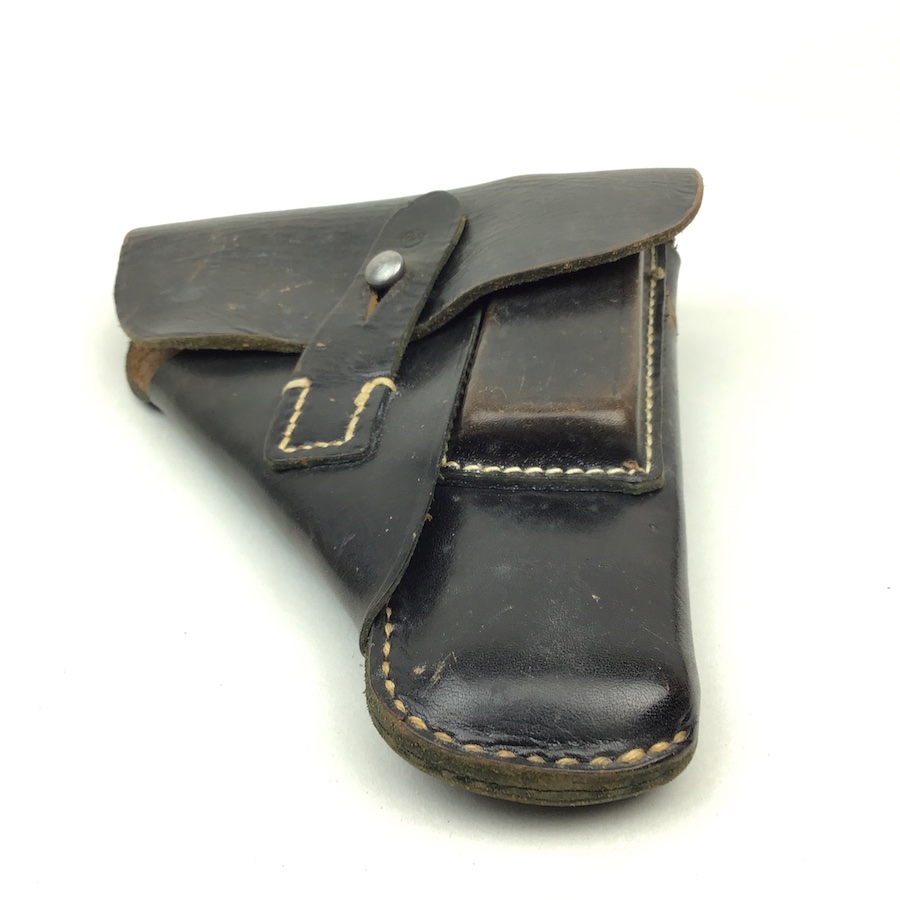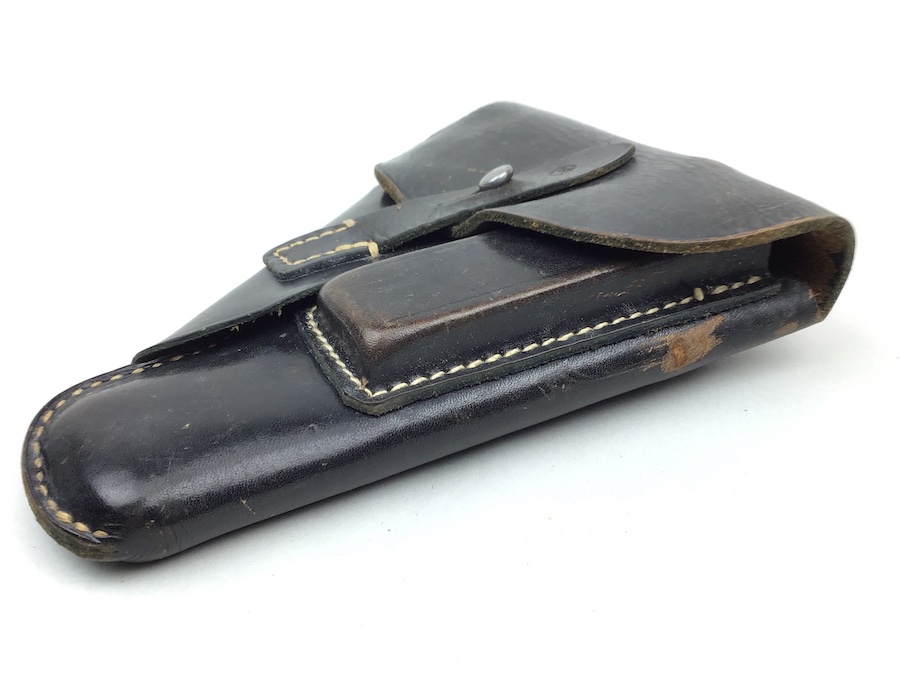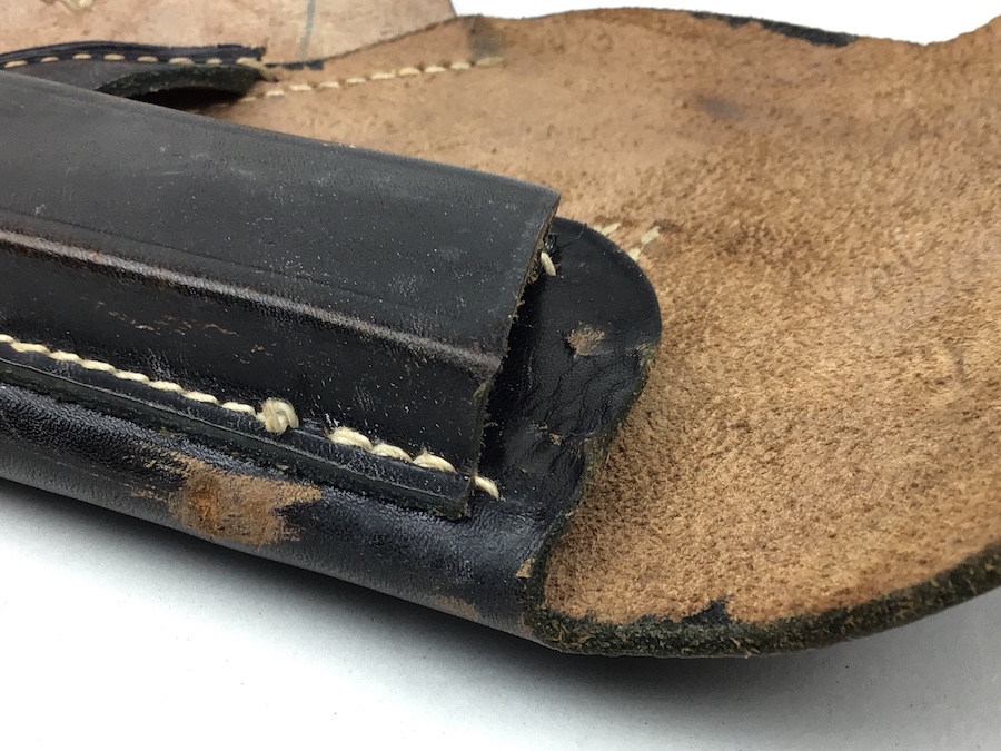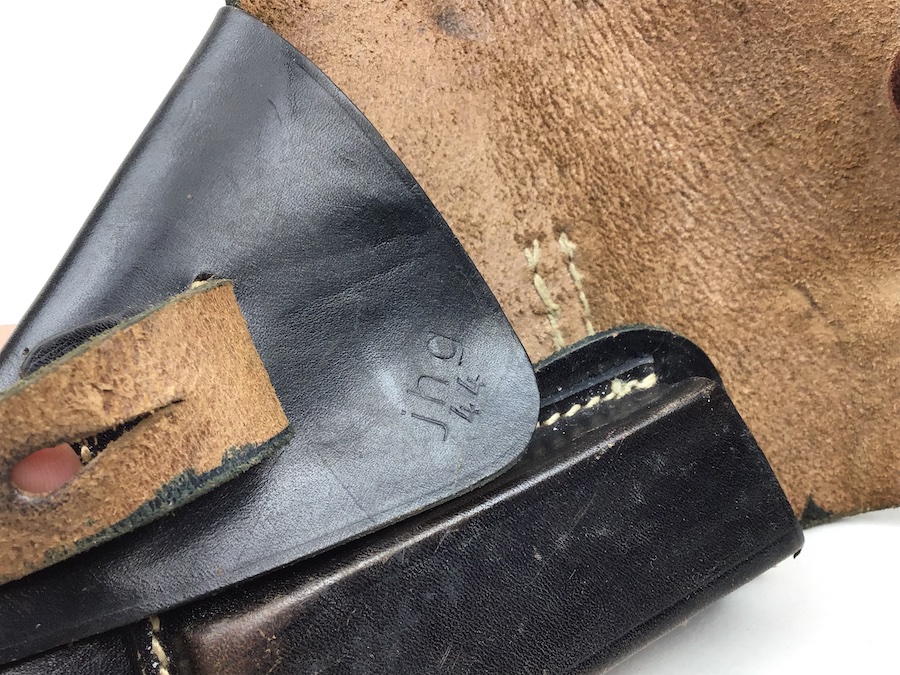 6/9/20 – Very good condition Mauser HSc holster from 1944. Will also fit similar sized 7.65mm pistols. This late war piece is stamped with the “jhg” maker code and “44” date just under the closer flap. The tip of the closer strap shows the “GECO” maker stamp which was applied over the waffen stamp after the war. (Many left over and remaining holsters of the Nazi regime were re-issued to police and the swastika symbol was covered over) Small area of wear on the edge by the mag pouch and 1 loose stitch near the top of the mag pouch. Overall, a very nice piece of history.