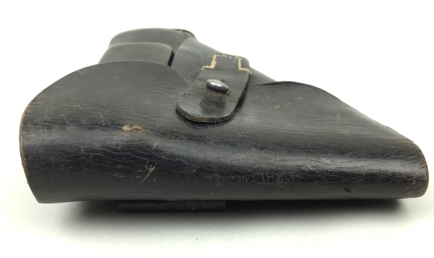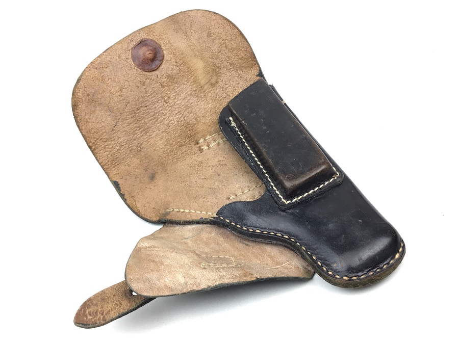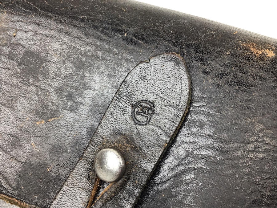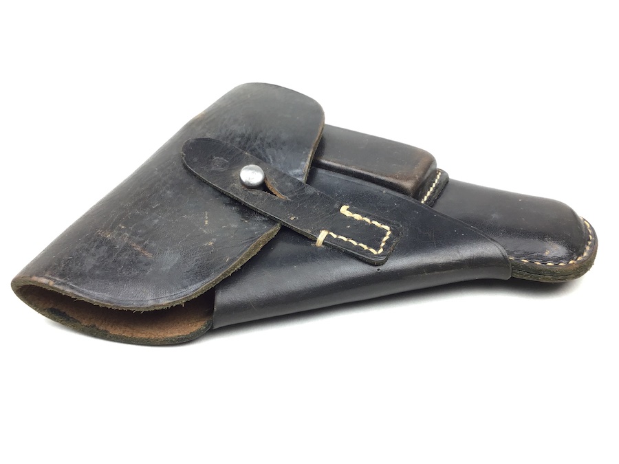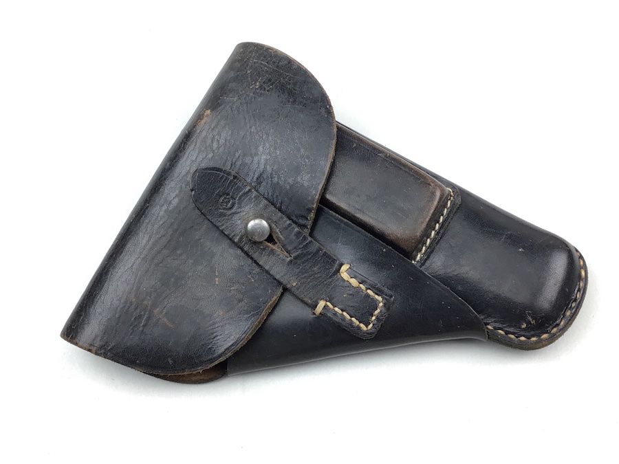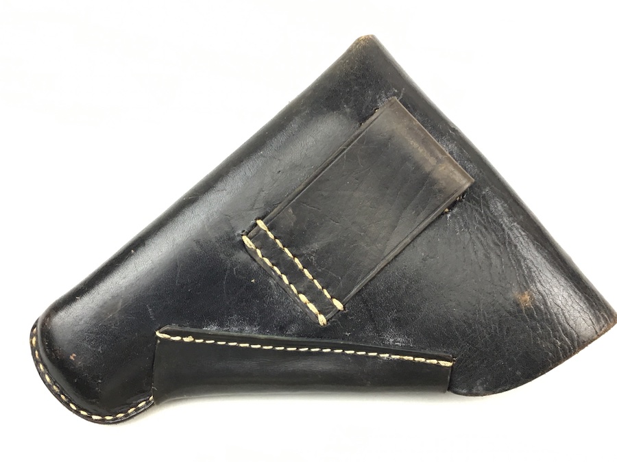 6/9/20 – Very good condition Mauser HSc holster from 1944. Will also fit similar sized 7.65mm pistols. This late war piece is stamped with the “jhg” maker code and “44” date just under the closer flap. The tip of the closer strap shows the “GECO” maker stamp which was applied over the waffen stamp after the war. (Many left over and remaining holsters of the Nazi regime were re-issued to police and the swastika symbol was covered over) Small area of wear on the edge by the mag pouch and 1 loose stitch near the top of the mag pouch. Overall, a very nice piece of history.