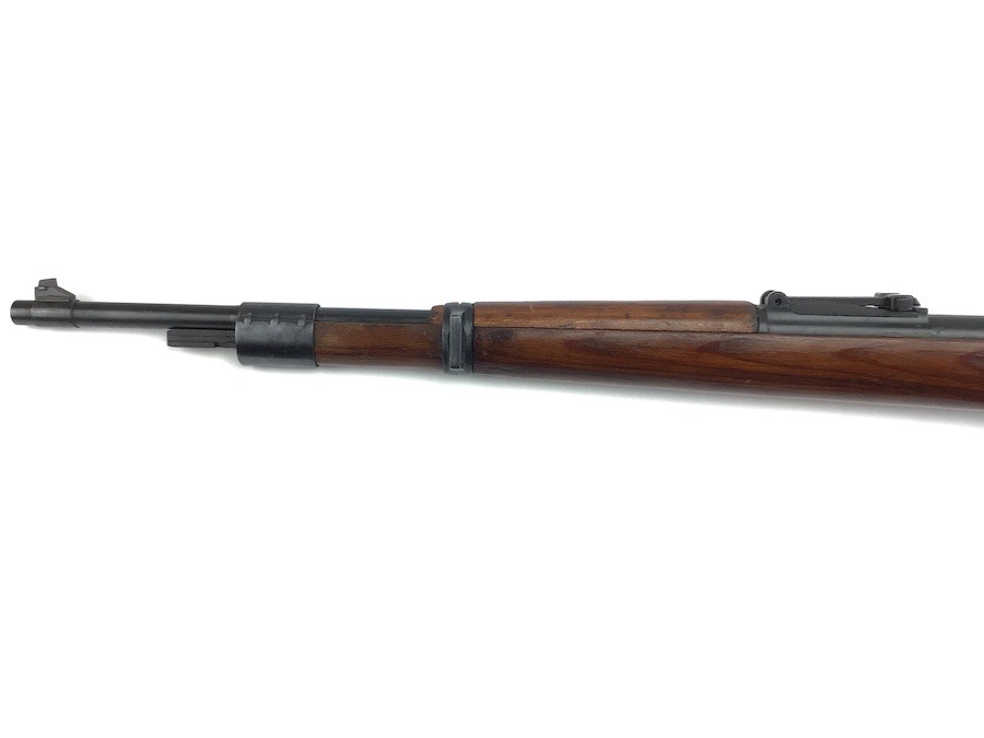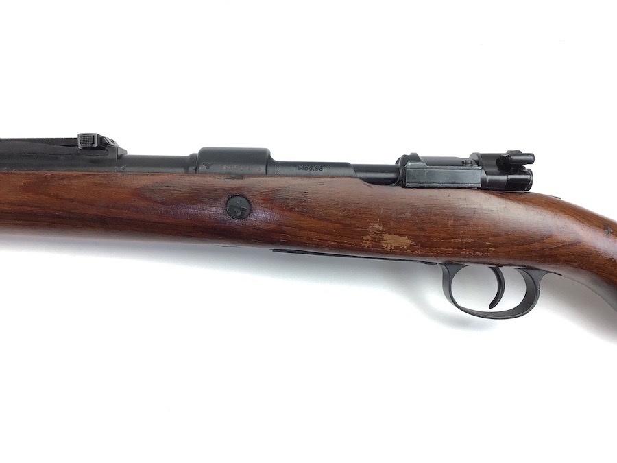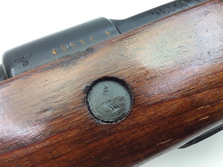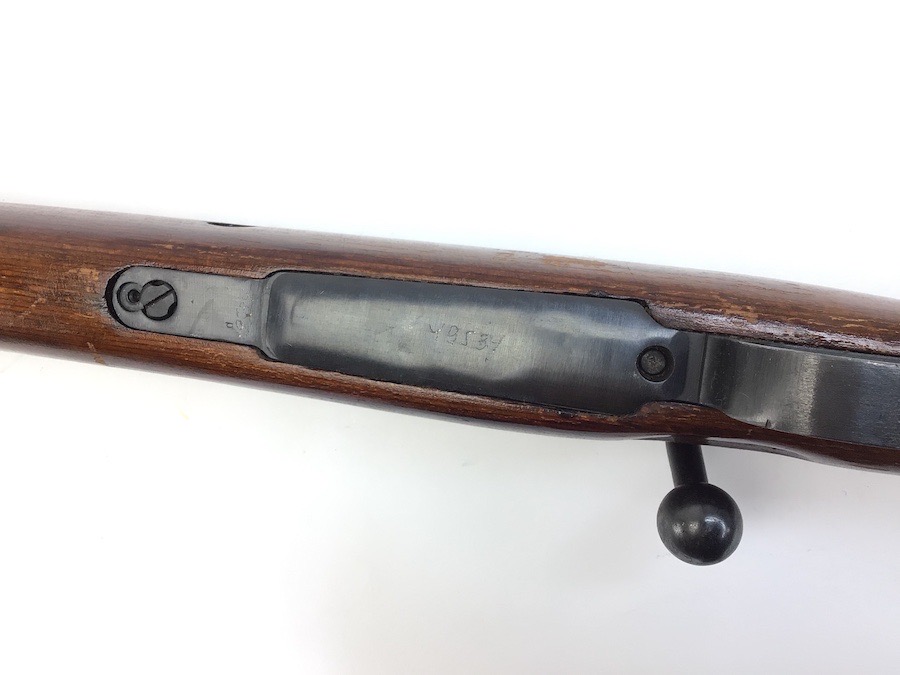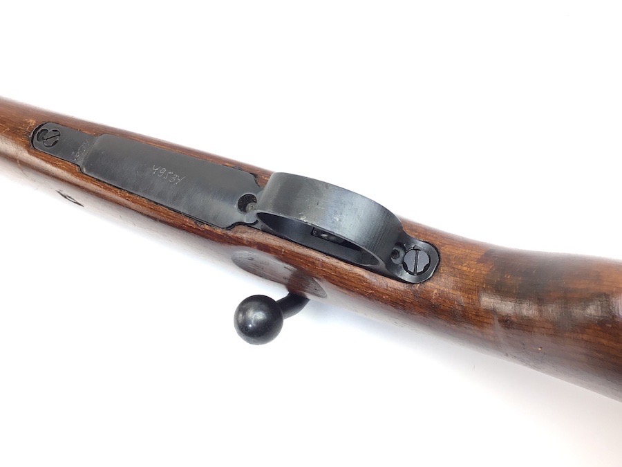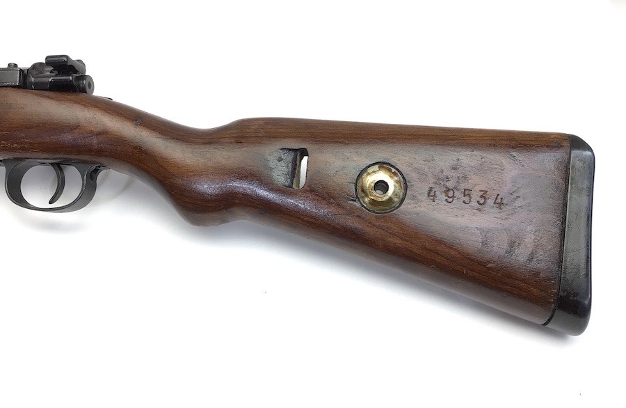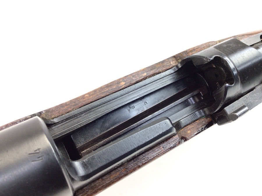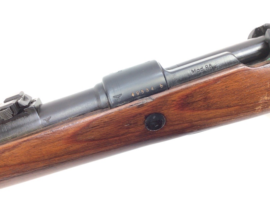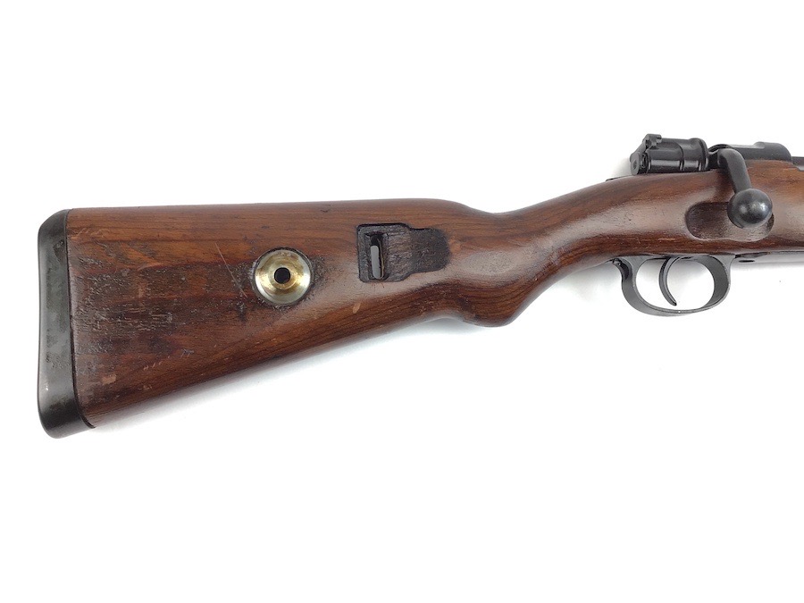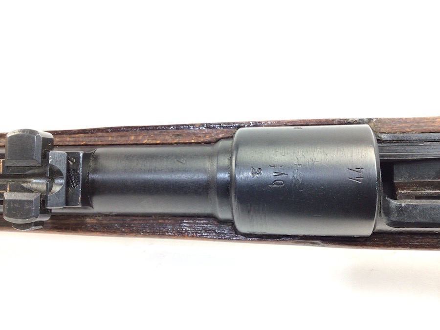 10/23/23 – This Mauser K98 was originally manufactured for the German Military by Mauser in 1944, as evidenced by the byf and 44 stamped on top the breach. The metal parts were evidently re-blued / dipped after Russian capture. German proof stamps are still visible on the left side of the breech. Serial numbers were etched into the top of the bolt and near the bolt handle, as well as the magazine base plate. Two capture screws are missing from the front and rear of the trigger guard. Butt plate is stamped ‘brg’. Wood stock is in great shape and has been refinished and stamped with the serial number on the left side. Bore is great with strong rifling and rates 7.5-8 of 10. Functions normally with smooth, tight action. Import marked just under the muzzle.