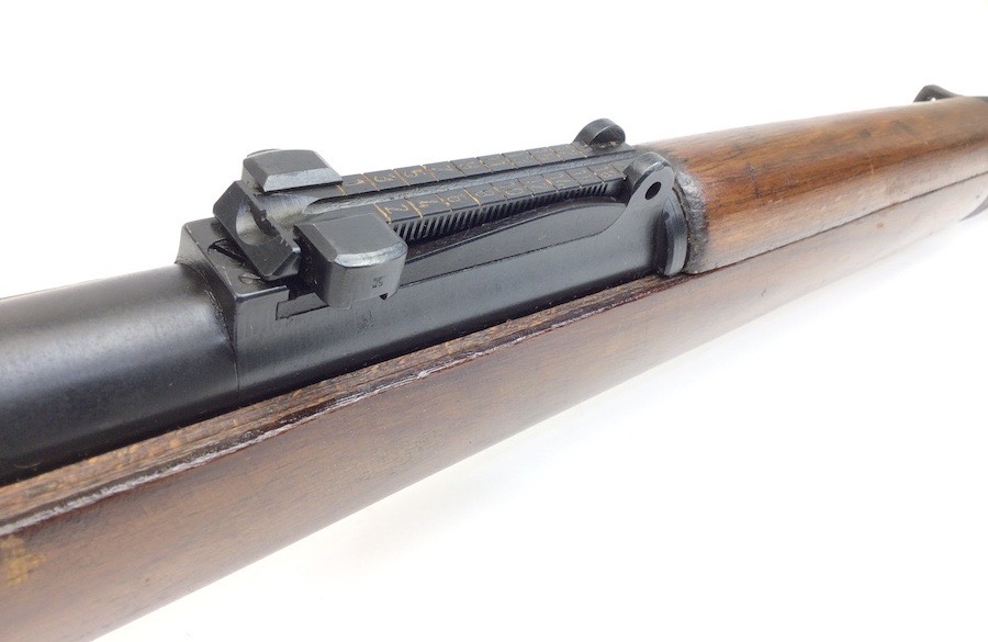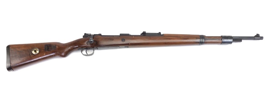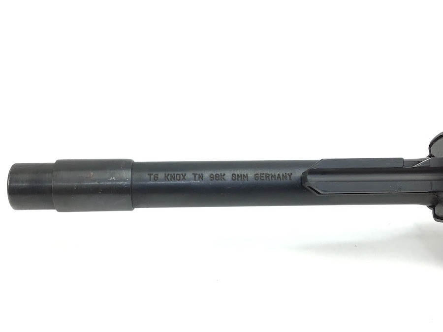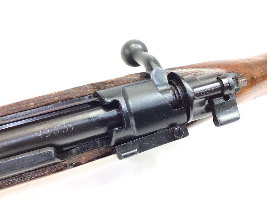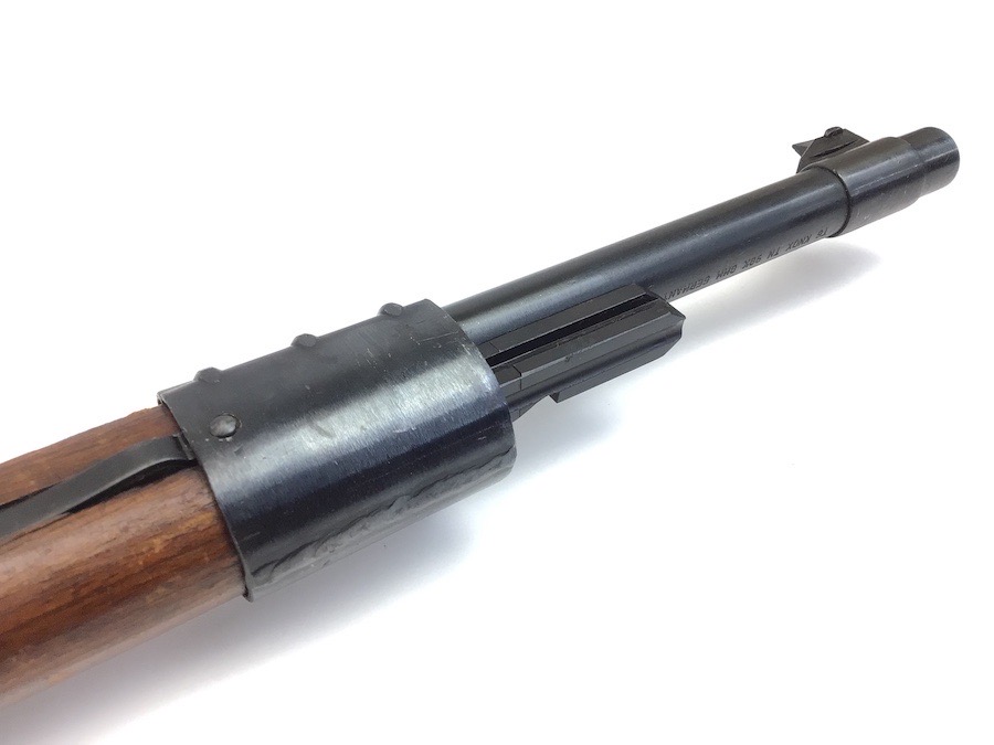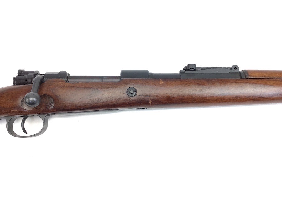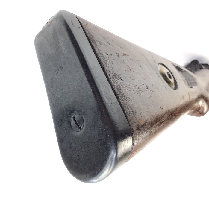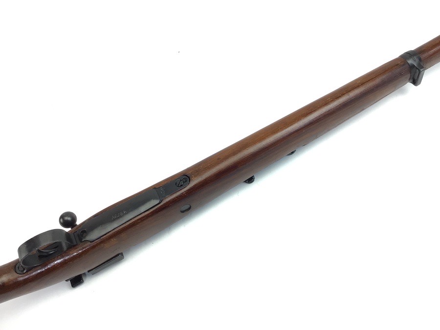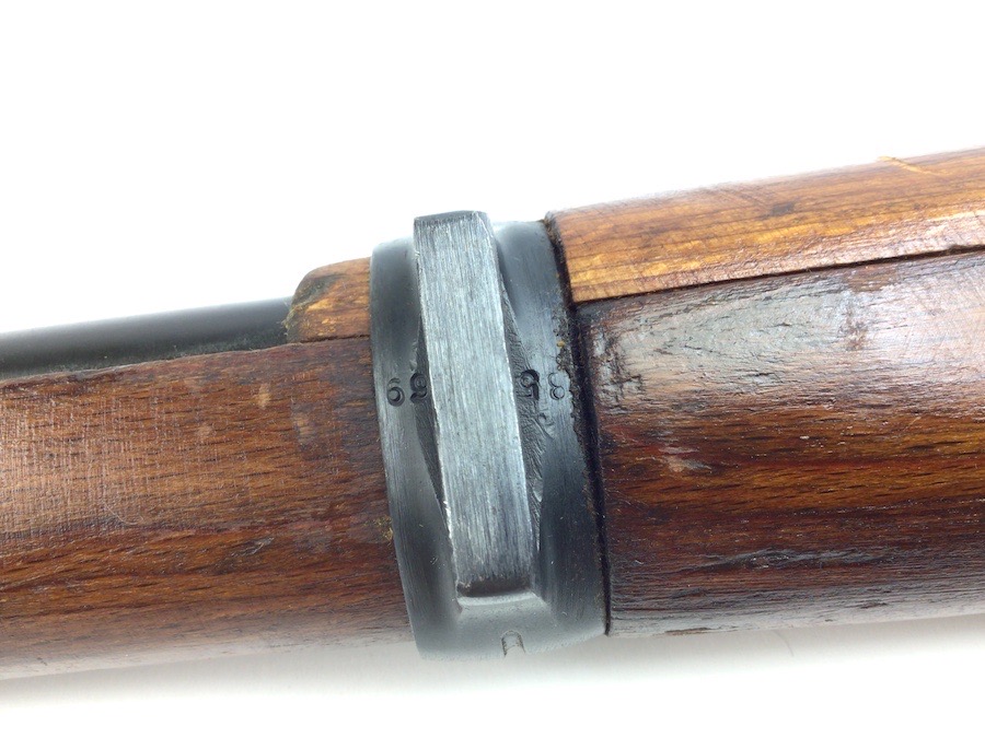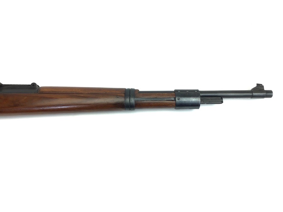 10/23/23 – This Mauser K98 was originally manufactured for the German Military by Mauser in 1944, as evidenced by the byf and 44 stamped on top the breach. The metal parts were evidently re-blued / dipped after Russian capture. German proof stamps are still visible on the left side of the breech. Serial numbers were etched into the top of the bolt and near the bolt handle, as well as the magazine base plate. Two capture screws are missing from the front and rear of the trigger guard. Butt plate is stamped ‘brg’. Wood stock is in great shape and has been refinished and stamped with the serial number on the left side. Bore is great with strong rifling and rates 7.5-8 of 10. Functions normally with smooth, tight action. Import marked just under the muzzle.