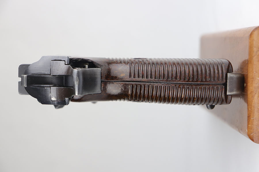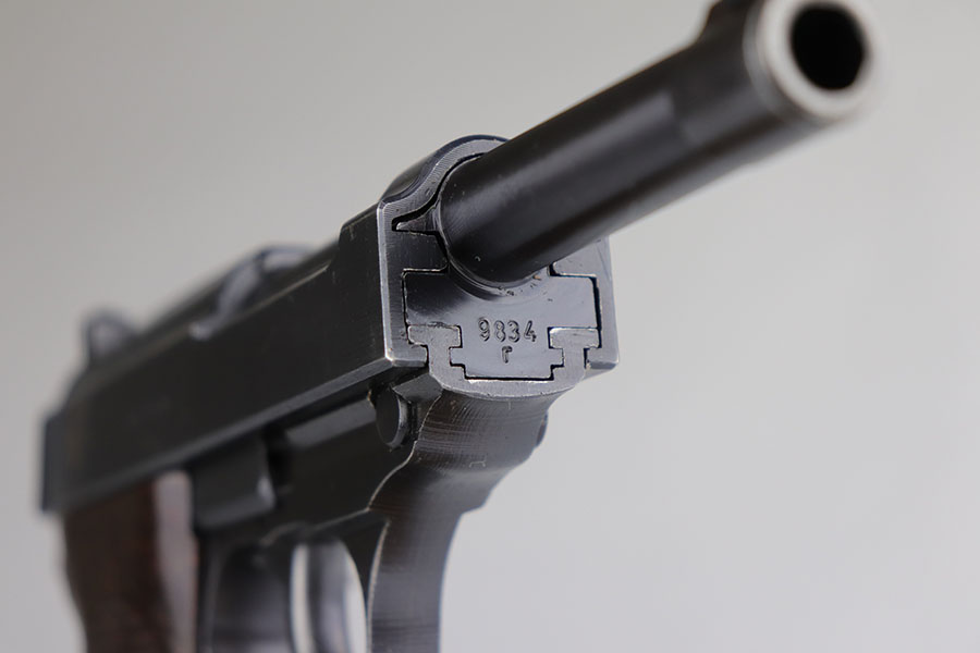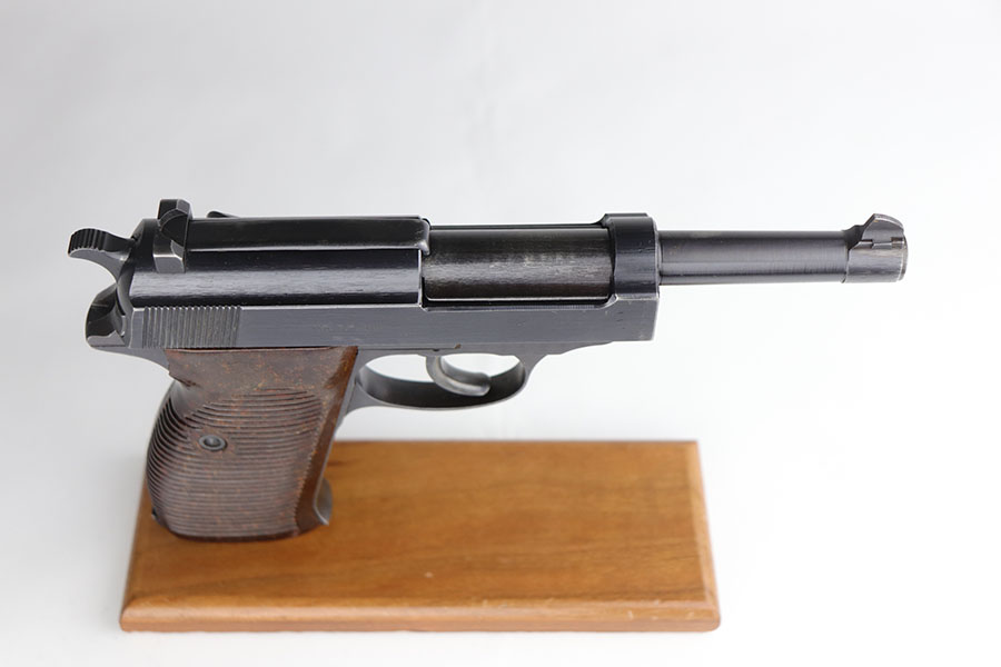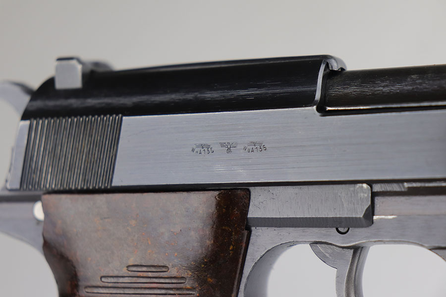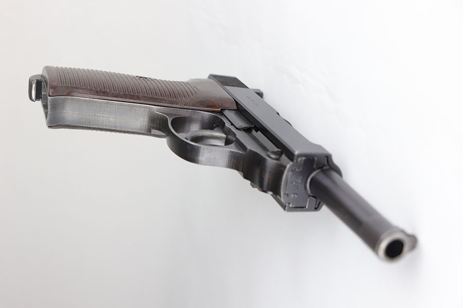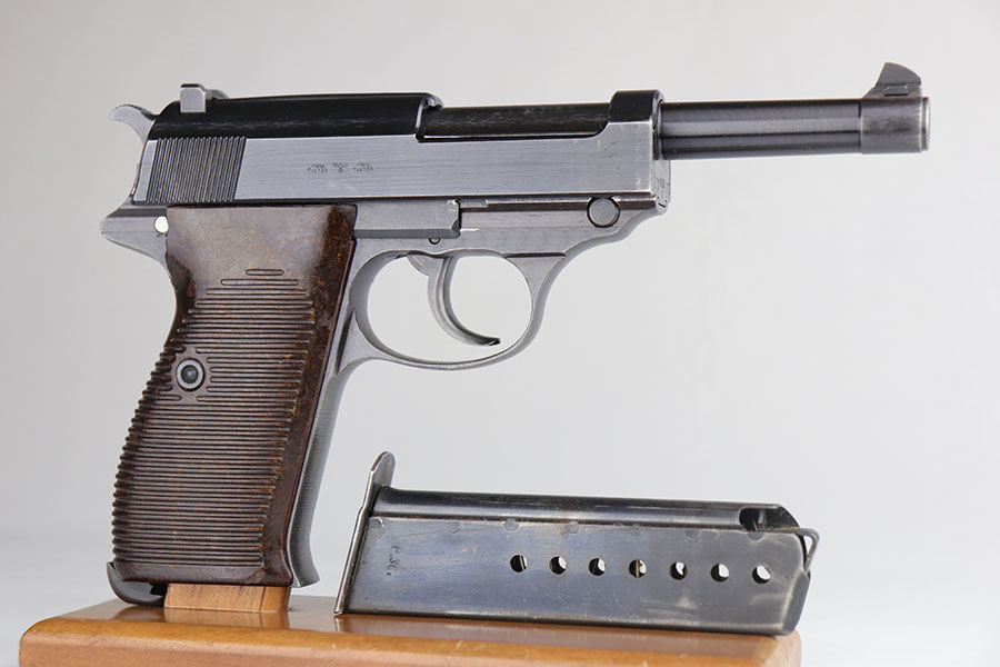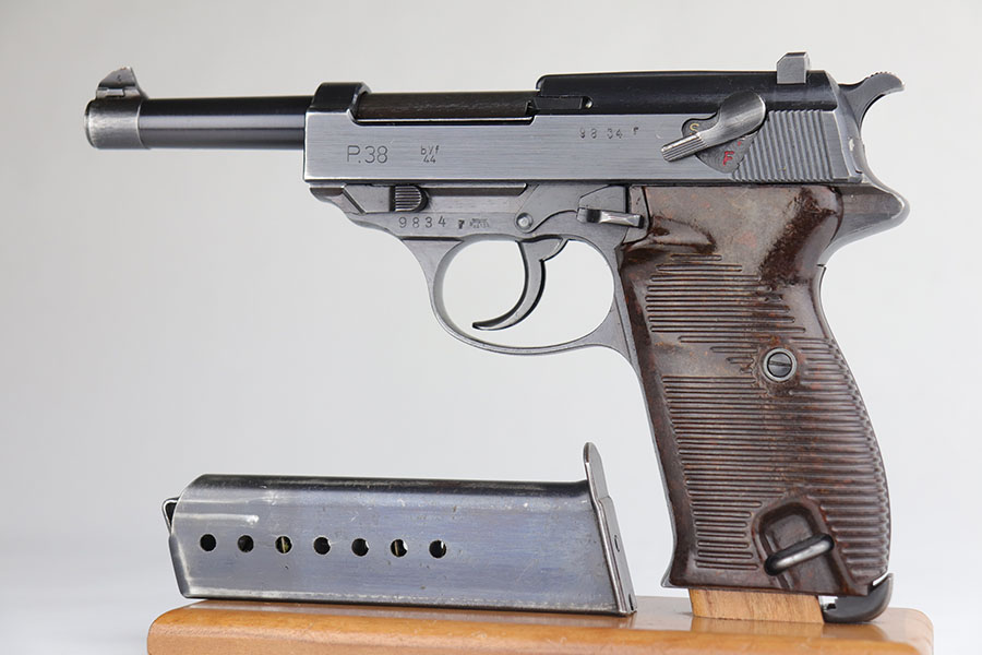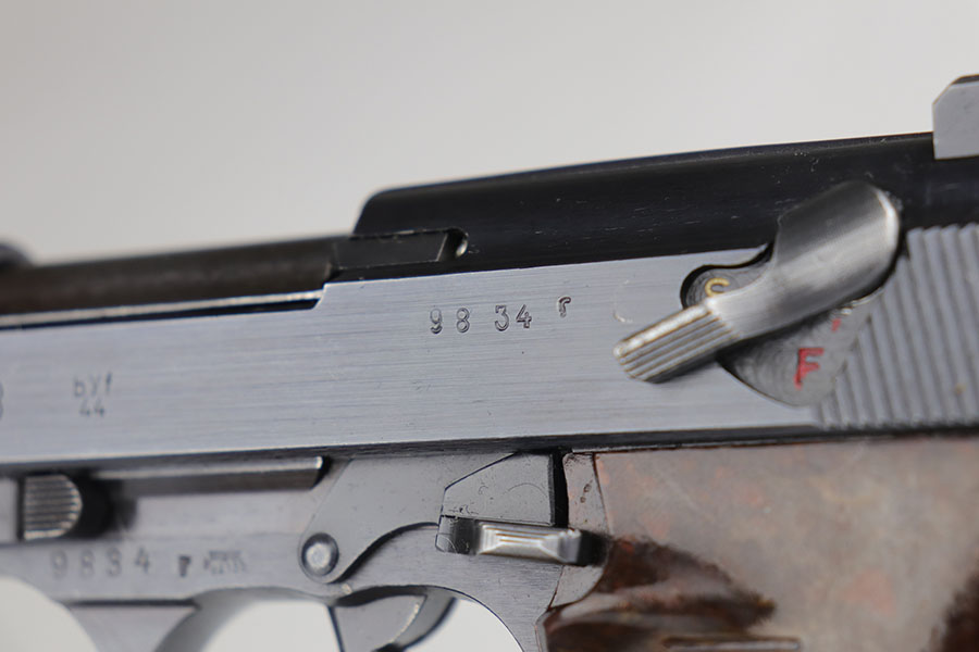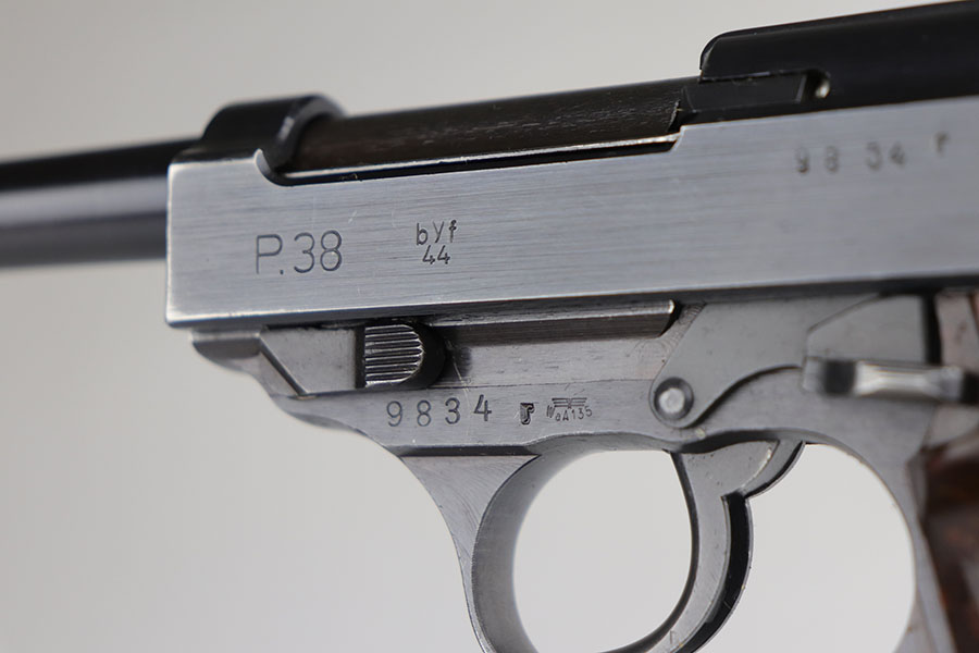 7/21/20 – This is a very nice Mauser P.38 from April of 1944. The profile has only a bit of high edge wear on the muzzle and front of slide, with most of the overall finish loss on the front strap. Mint bore. Proper mechanics, including de-cocker. Excellent reddish brown grips. Mauser magazine.