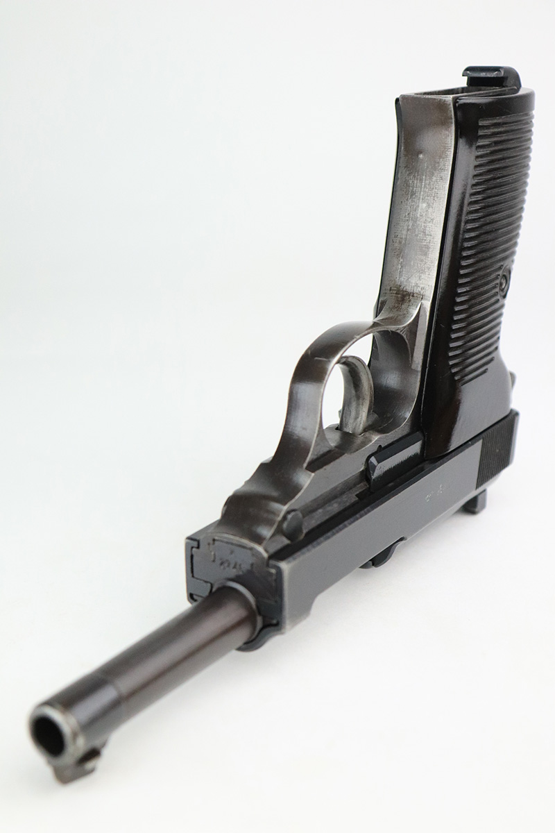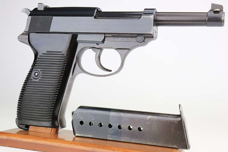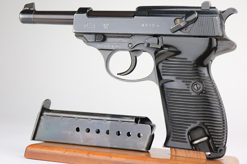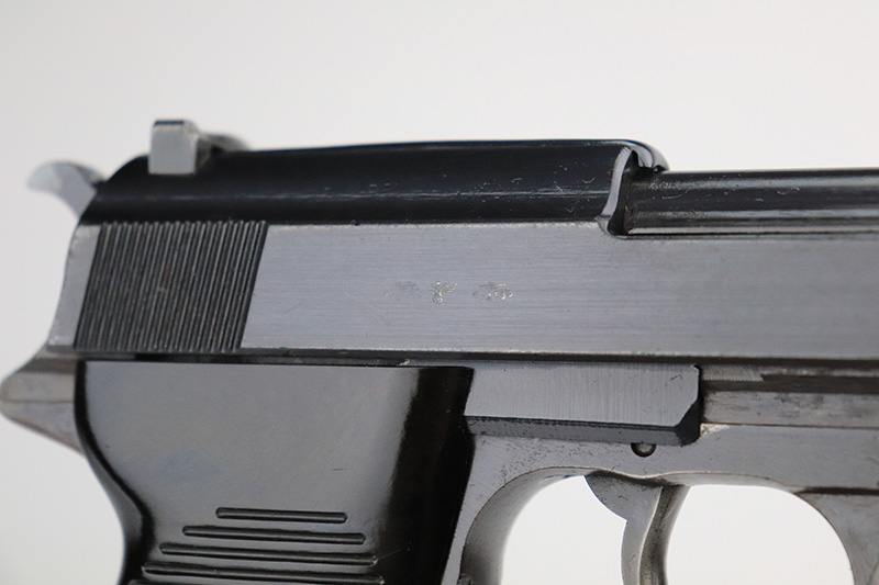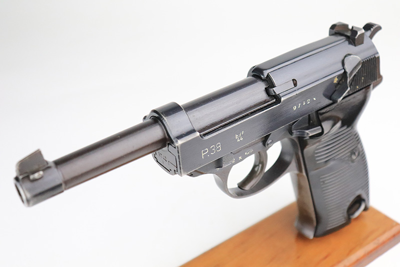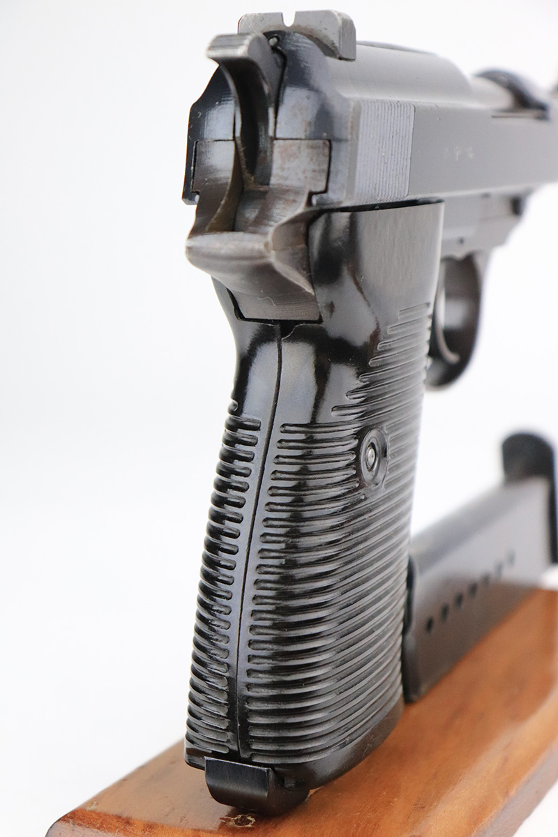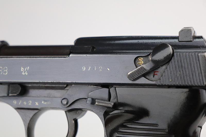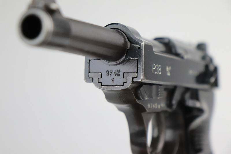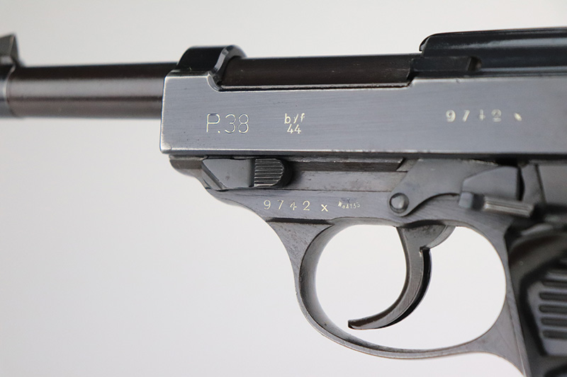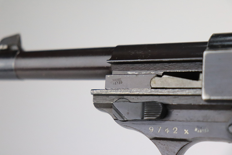 9/16/22 – This is a very nice example of a BYF 44 Mauser P.38 issued to the Nazi military in 1944. It is all matching and has the proper “Waffen 135” military acceptance proofs. It has retained about 93% of its original finish. The majority of the finish loss is on the front strap, so the profile views are minty. Just very minor wear on the very front edges of the slide and around the muzzle. Comes with excellent period-correct grips and a proper “Waffen 135” marked magazine. The bore is shiny with very strong rifling, but there is some light freckling in the grooves. De-cocker is functional.