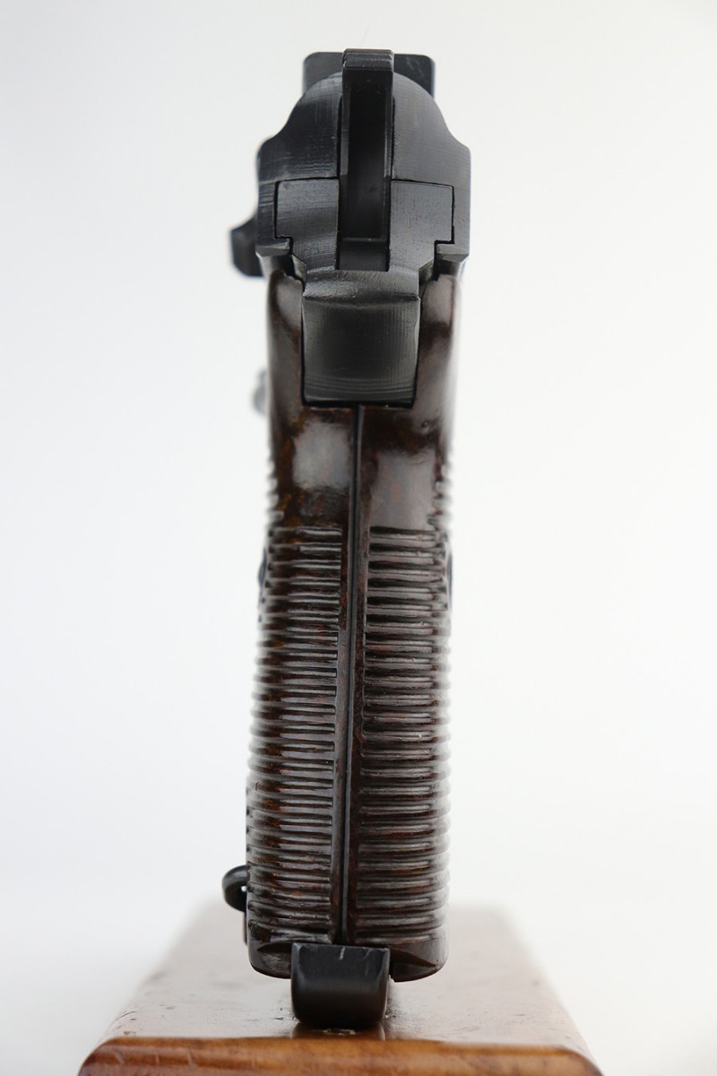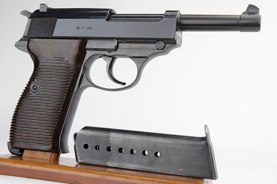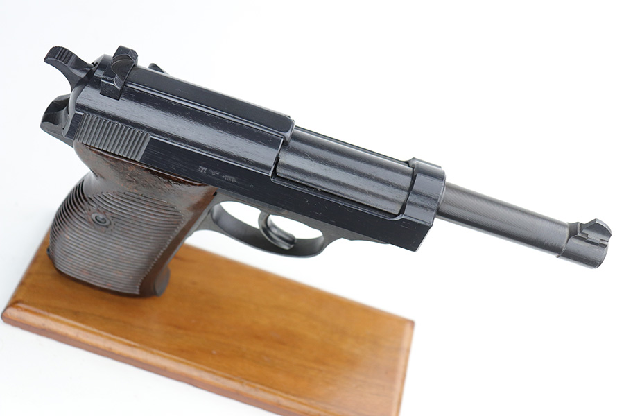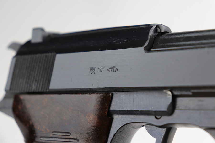 9/27/21 – This is an excellent example of a rare Mauser P.38 issued to the Nazi military in 1944. It is all matching. This one is rare because it has mixed “Eagle 135” and “Waffen Eagle 135” military proofs on the right side of the slide. It is the correct “q” serial number block for this variation. The finish is a little dark, so we believe it has been professionally restored. As a result, the gun has a beautiful look to it. It has retained virtually all of its bluing – just a few small dings and a scratch on the left side of the frame. Comes with excellent grips and a period-correct Mauser magazine. The bore is shiny with strong rifling and areas of freckling throughout. De-cocker is functional.