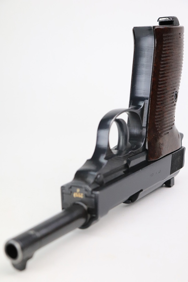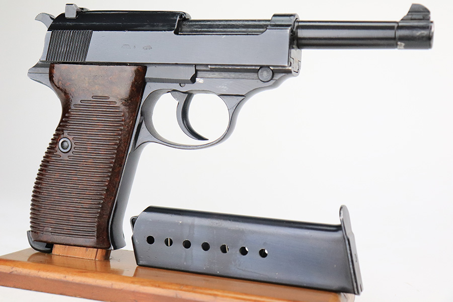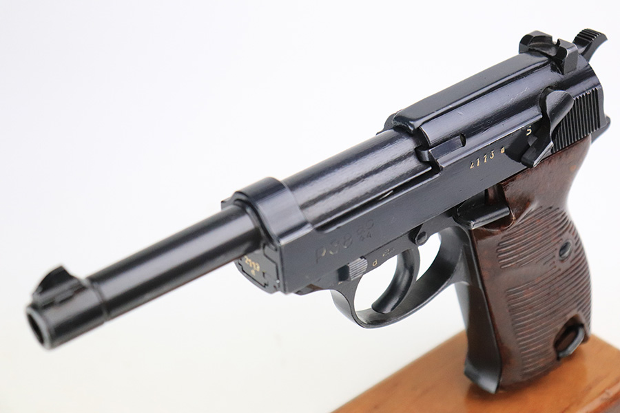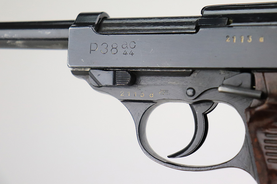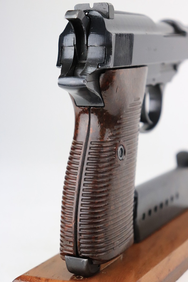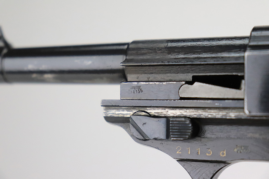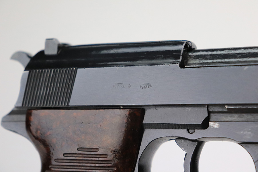 6/22/22 – This is an excellent example of a Mauser P.38 issued to the Nazi military in 1944. It is all matching and has the proper “Waffen 135” military acceptance proofs. This one also has a rare FN-made slide. We believe the gun has been refinished, but the bluing is really nice throughout. There is very little finish loss, just some tiny dots of wear on the barrel and a few very light scratches on both sides of the slide. Comes with really nice reddish grips and a period-correct Mauser magazine. Excellent bore with strong rifling. De-cocker is functional.