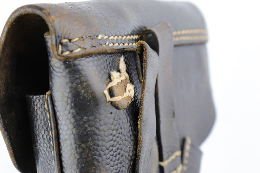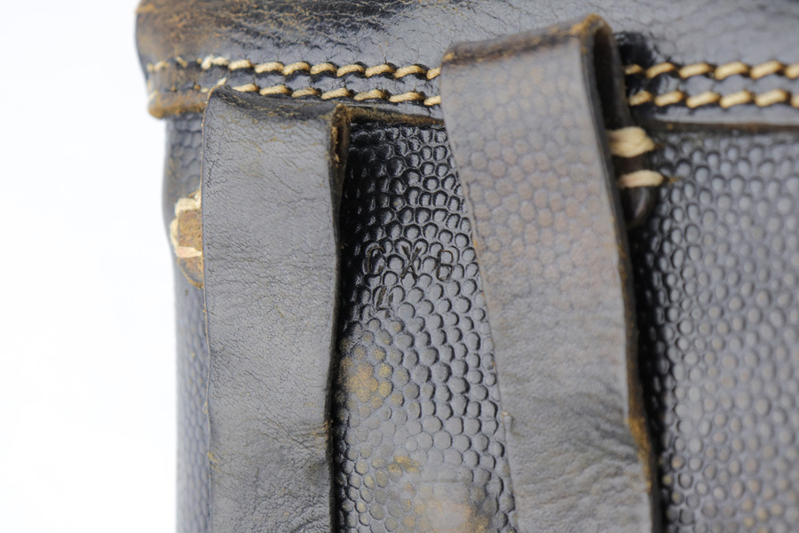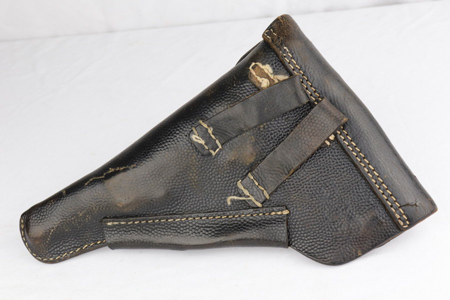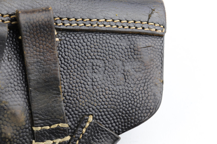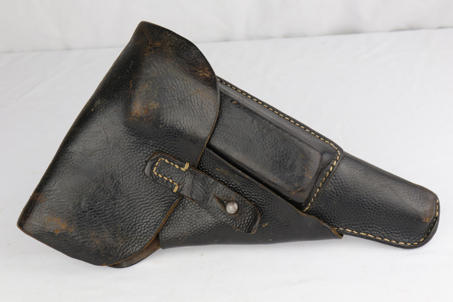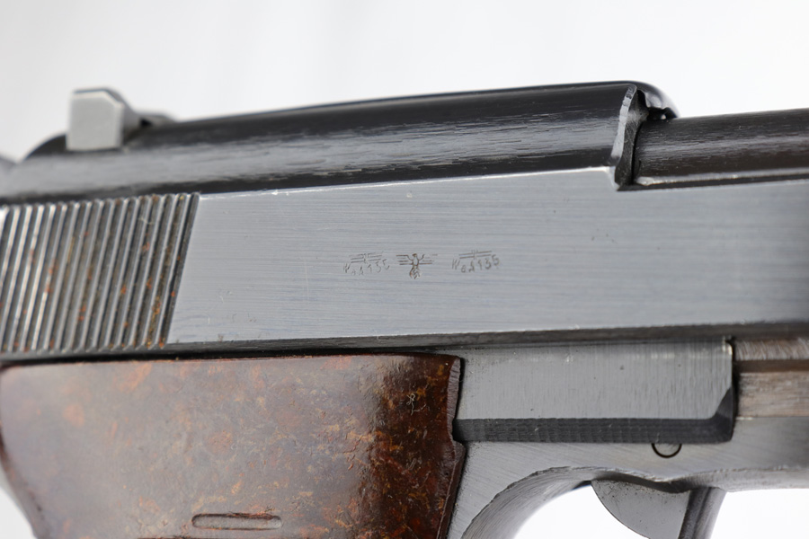 3/14/19 – This is a complete Mauser P.38 rig from 1944 with spare magazine and softshell holster. The gun is in excellent, original condition with about 97% blue remaining. Muzzle wear on both sides, and an area of finish loss on the trigger guard. All matching numbers. Strong, shiny bore. Excellent reddish grips, though there is a small chip in the back of the right panel. Holster is 1944 dated with maker mark. It shows some age/wear, and one belt loop has come unstitched.